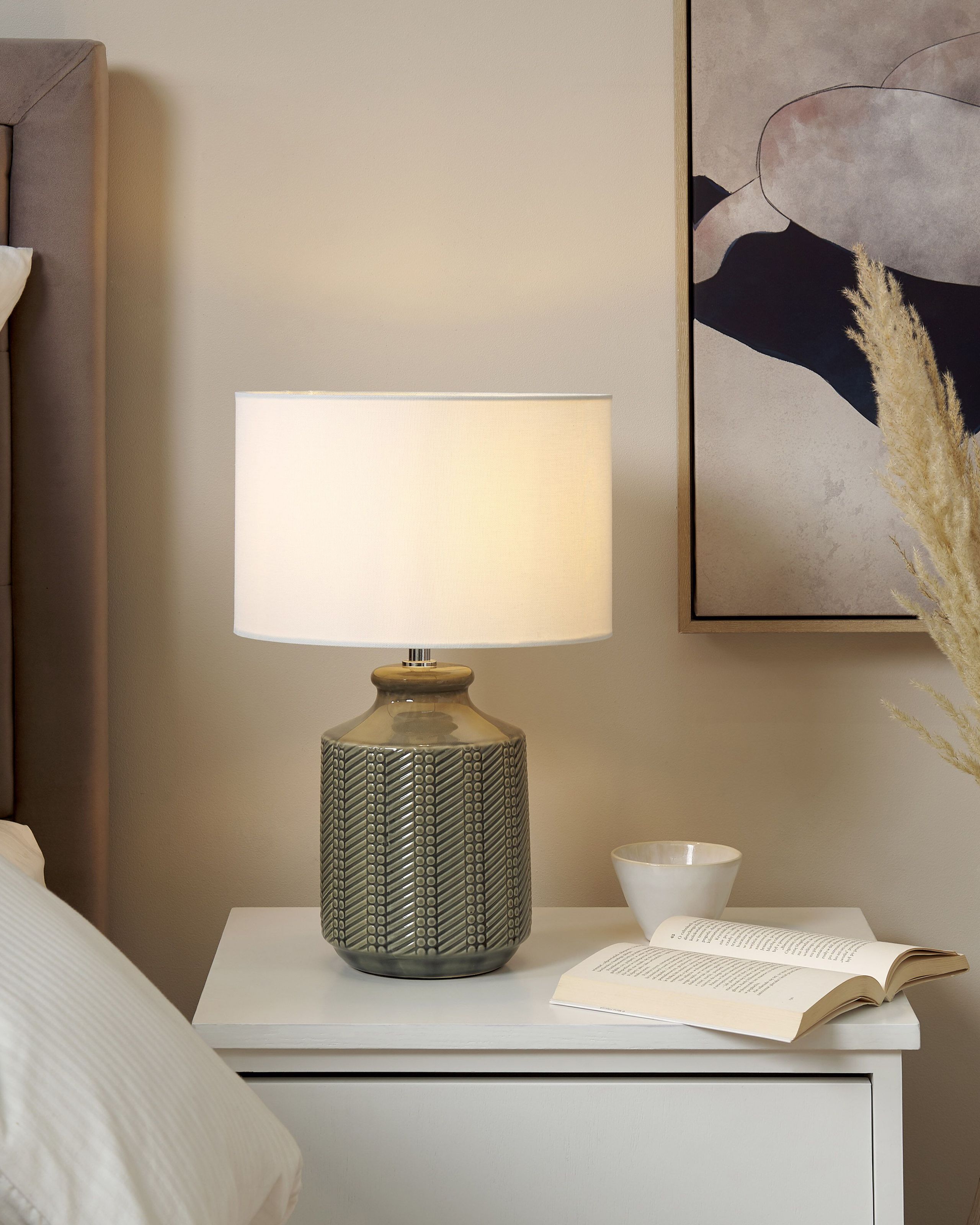 Moderni yöpöydän valaisin tyylikkäällä jalalla. Piristä minkä tahansa tilan tai sisustuksen ilmettä tällä pöytävalaisimella. Sen keraaminen jalka sekä pellavan ja puuvillan sekoituksesta valmistettu varjostin on valmistettu käsin yksityiskohtiin huomiota kiinnittäen. Tyylikäs geometrinen kuviointi antaa valaisimelle trendikkään ilmeen, joka näyttää hyvältä niin makuuhuoneessa kuin olohuoneessakin. Neutraalit värit saavat valaisimen näyttämään hyvältä useissa sisustustyyleissä.