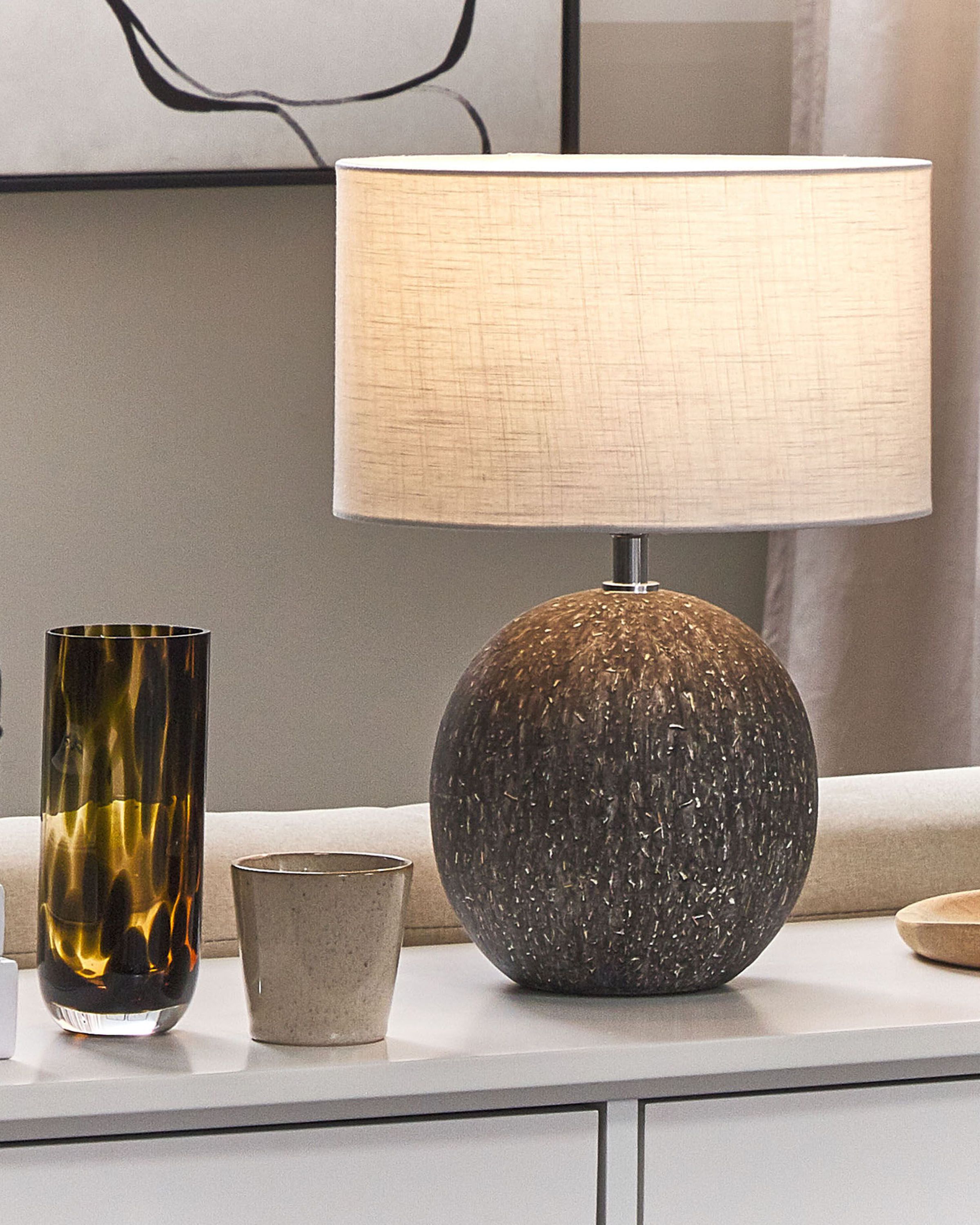 Tyylikäs valaisin pyöreällä jalalla. Mikään sisustus ei on täydellinen ilman koristeellista valaisinta. Tämä moderni pöytävalaisin tulee varmasti herättämään huomiota. Kestävästä keramiikasta valmistettu jalka on tukeva. Koon puolesta valaisin käy jopa pienemmille pöydille ja hyllyille makuuhuoneessa tai olohuoneessa. Käsintehty kangasvarjostin hajauttaa valoa ja luo tunnelmaa huoneeseen.