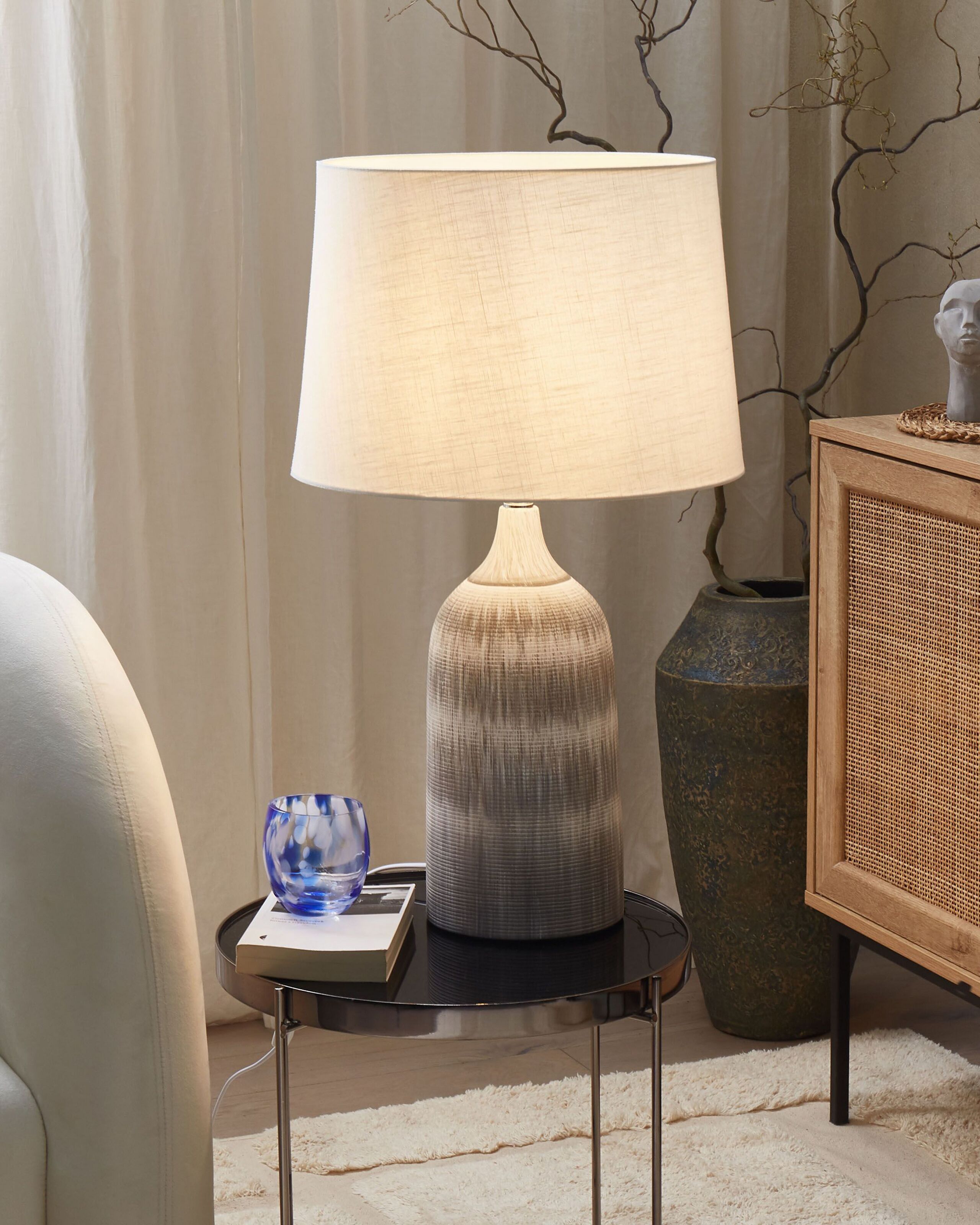 Moderni yöpöydän valaisin. Jos tarvitset valoa sohvannurkkaan, yöpöydälle tai sivupöydälle, klassinen pöytävalaisin on hyvä ratkaisu. Valaisimen jalka on harmaanvalkoista keramiikkaa ja lampunvarjostin yhteensopivaa valkoista kangasta, jonka läpi valo suodattuu lämpimän sävyisenä. Hyvin neutraalin ja kiiltävän ulkonäkönsä ansiosta valaisin sopii sisustukseen kuin sisustukseen.