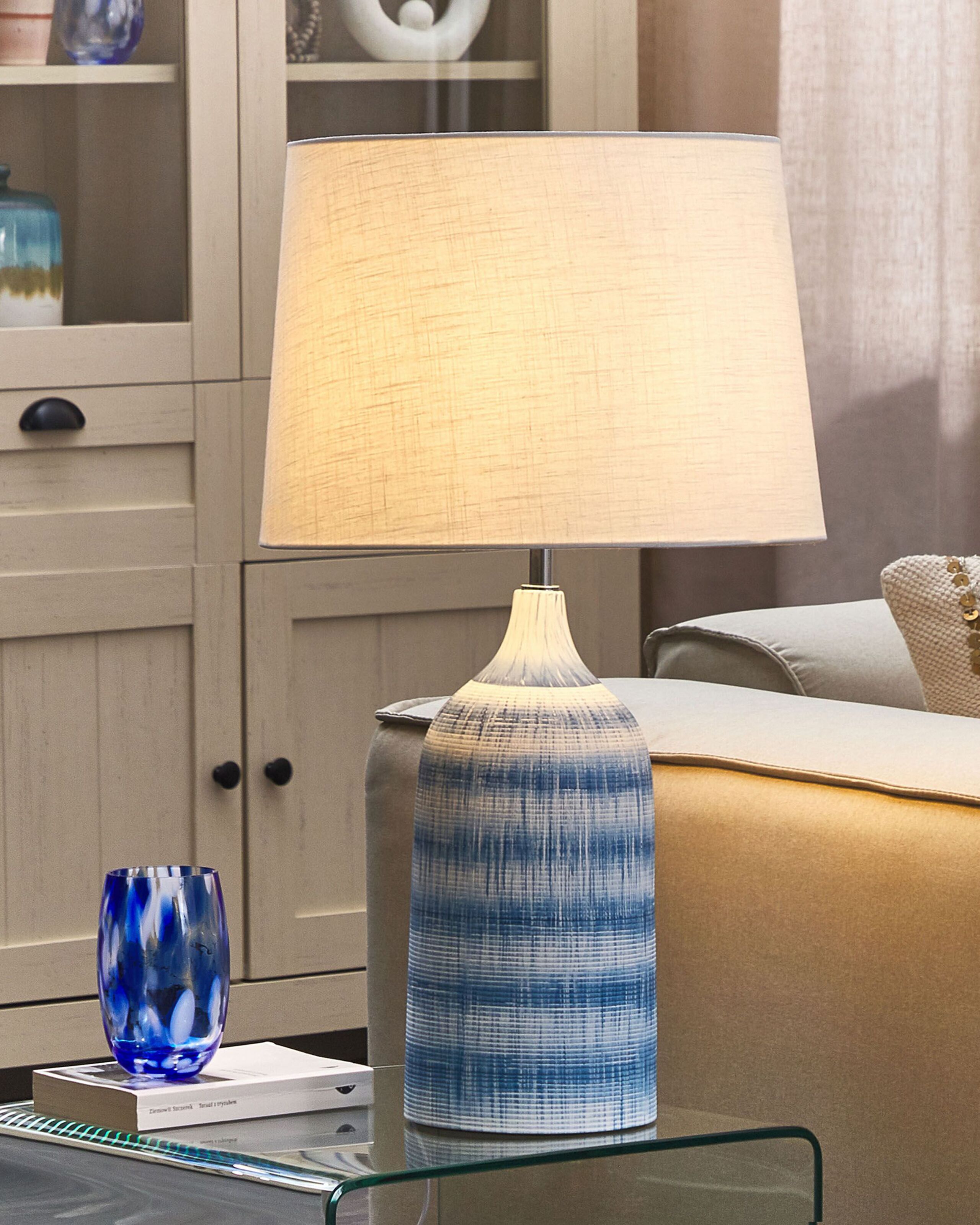 Moderni yöpöydän valaisin. Jos tarvitset valoa sohvannurkkaan, yöpöydälle tai sivupöydälle, klassinen pöytävalaisin on hyvä ratkaisu. Valaisimen jalka on sinisenvalkoista keramiikkaa ja lampunvarjostin yhteensopivaa valkoista kangasta, jonka läpi valo suodattuu lämpimän sävyisenä. Hyvin neutraalin ja kiiltävän ulkonäkönsä ansiosta valaisin sopii sisustukseen kuin sisustukseen.