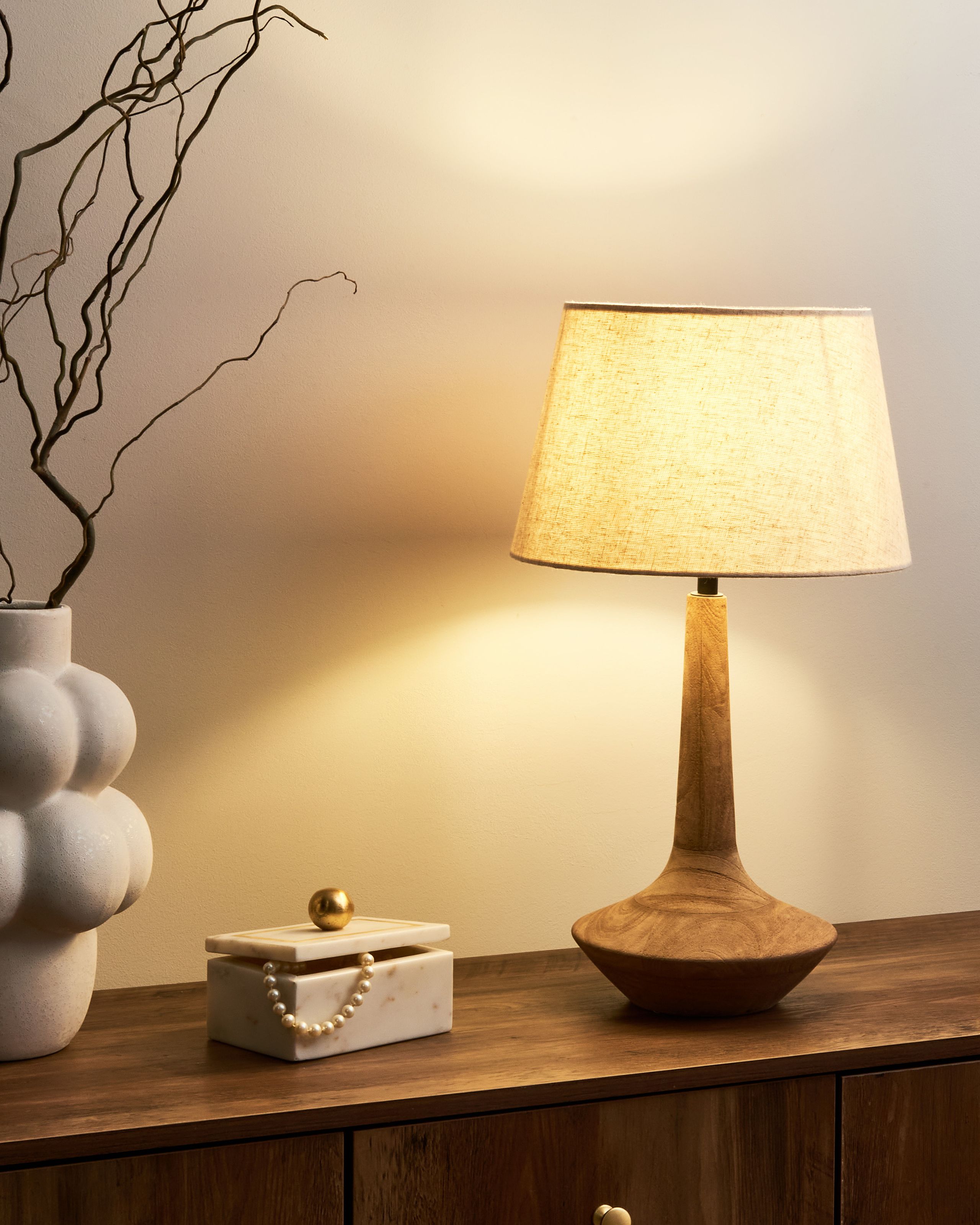 Moderni pöytälamppu kangasvarjostimella. Piristä sisustustasi tällä tyylikkäällä ja näyttävällä pöytävalaisimella. Jalka on valmistettu käsin laadukkaasta mangopuusta, mikä tekee siitä erittäin vakaan ja kestävän sekä helppohoitoisen. Varjostin on valmistettu puuvillan ja pellavan sekoituksesta, joten se antaa pehmeää ja miellyttävän tunnelmallista valoa, joka sopii erinomaisesti sekä olohuoneisiin että makuuhuoneisiin.