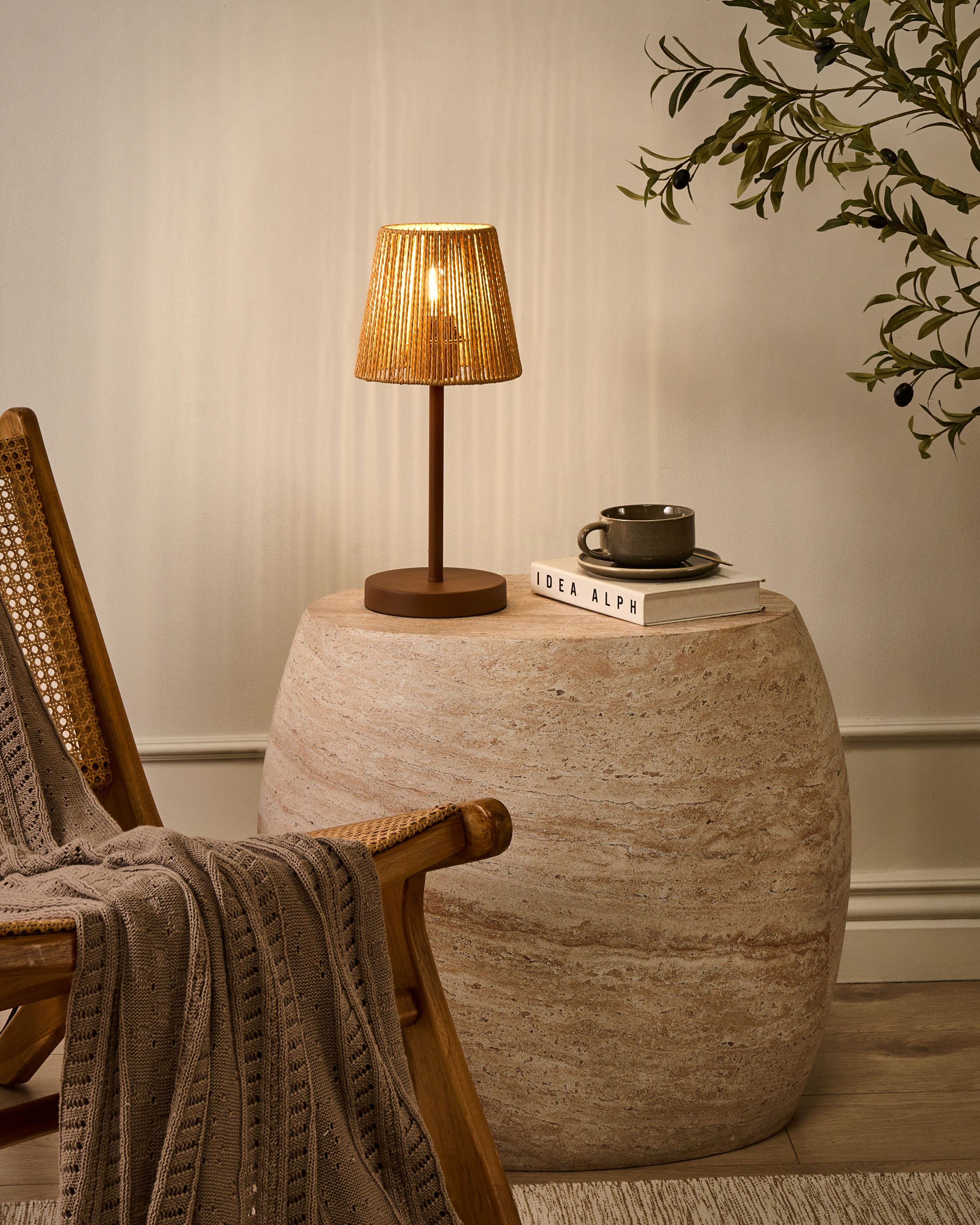 Boho-tyylinen pöytälamppu punotulla varjostimella. Tässä pöytävalaisimessa yhdistyvät mattaisen raudan karheus ja punotun varjostimen luonnollinen viehätys. Minimalistinen rautajalka täydentää paperinarusta valmistettua varjostinta täydellisesti. Valaisin heijastaa pehmeää hajavaloa, joka luo kodikkaan tunnelman olohuoneeseen, makuuhuoneeseen tai työpöydälle. Hienovarainen mutta tyylikäs sisustuselementti, joka sopii täydellisesti moniin sisustuksiin.