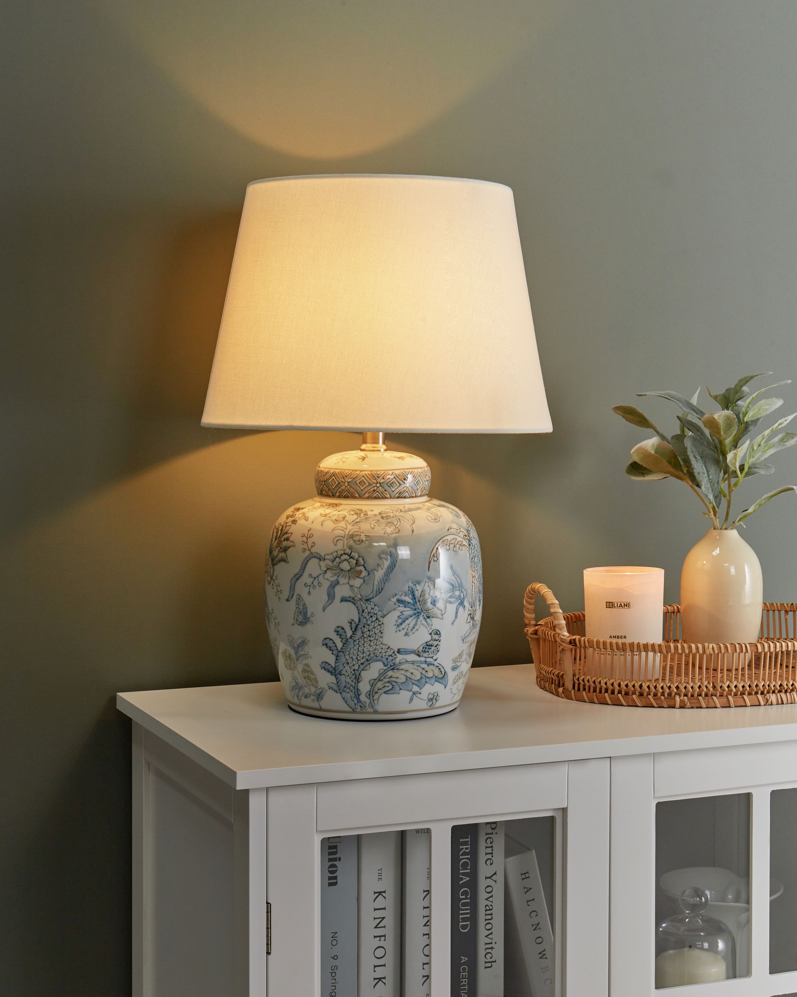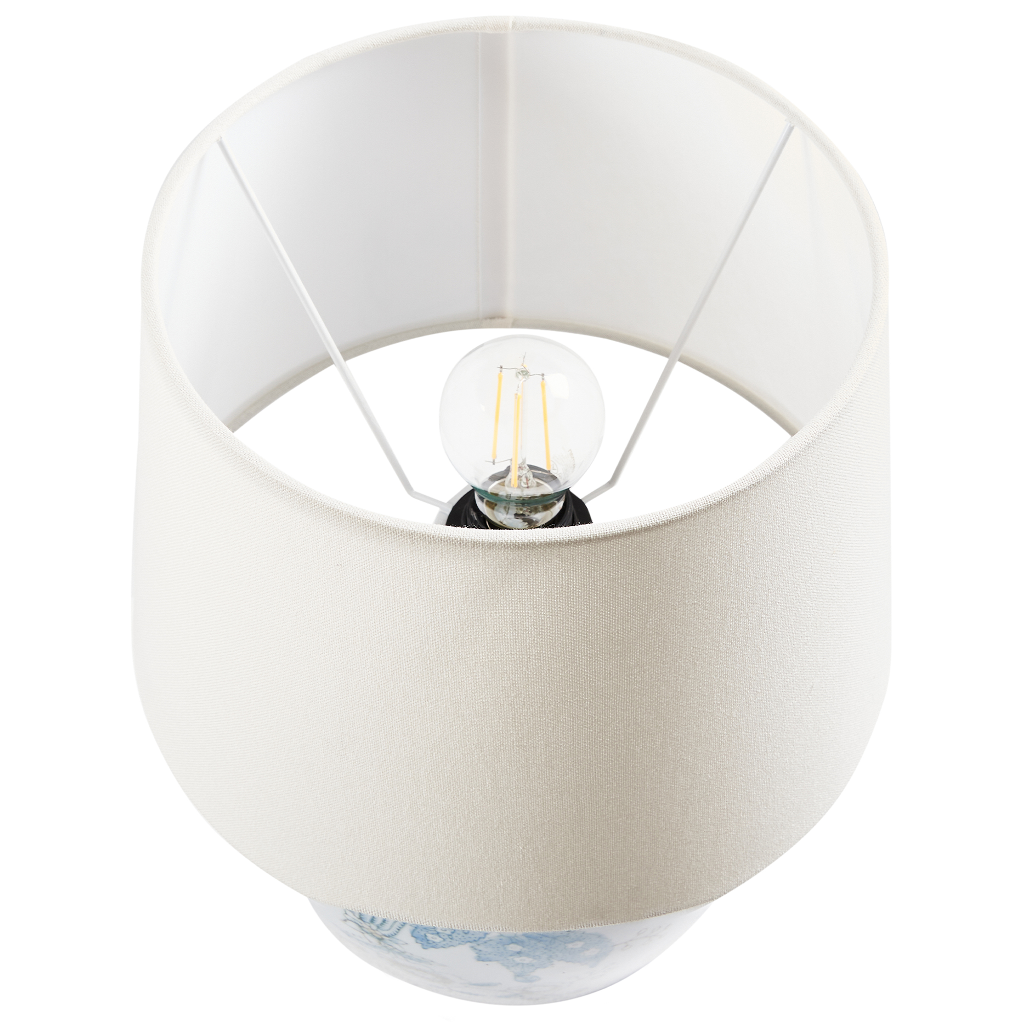 Tyylikäs kuvioitu valaisin. Kohota mitä tahansa tilaa tällä tyylikkäällä pöytävalaisimella. Käsin maalatussa posliinijalassa on tyylikäs kuviointi, ja sitä täydentävä vaalea pellavavarjostin antaa pehmeän ja lämpimän valon. Muotoilunsa ja värimaailmansa ansiosta valaisin sulautuu vaivattomasti jokaiseen moderniin tai perinteiseen sisustukseen. Lisäksi johtoon sijoitettu kätevä on/off-kytkin helpottaa käyttöä.