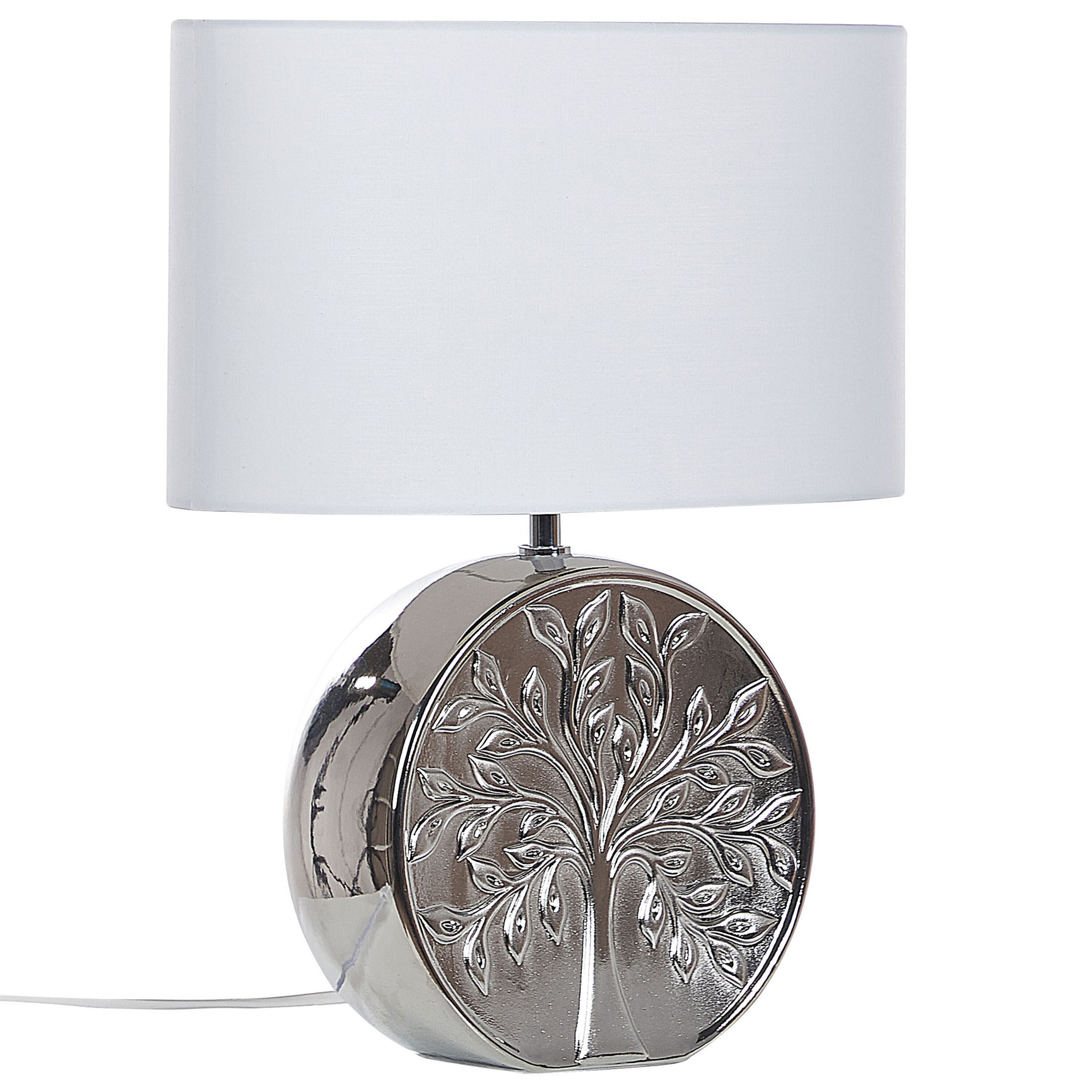 Glamour-tyylinen valaisin puukuviolla. Käytännöllinen pöytävalaisin makuu- ja olohuoneeseen, tarjoten samalla arastelemattoman ilmeen. Sen keraaminen jalka on viimeistelty kiiltävän hopeisella värillä, joka antaa sille glamour-tyylisen hohdon. Veistetty puukuvio tekee valaisimesta eklektisen ja ainutlaatuisen. Valkoinen varjostin toimii kontrastina valaisimen jalalle kohottaen sen eleganttia ilmettä entisestään. Lisää valaisin sohvan viereen, jossa se luo tunnelmallisen valaistuksen tai lukuvaloksi sängyn viereiselle yöpöydälle.
