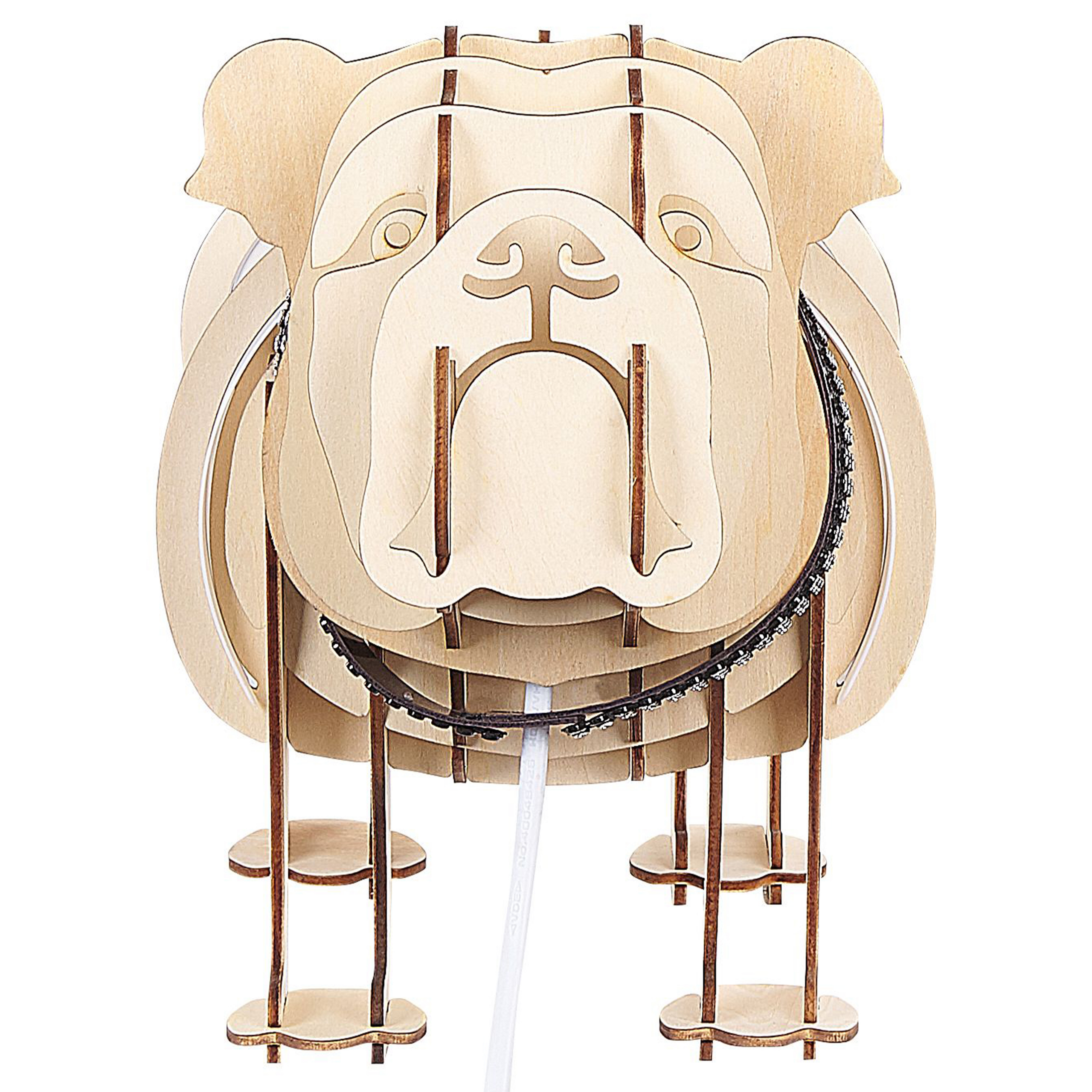 Suloinen koiran muotoinen valaisin. Tämä ainutlaatuisesti muotoiltu pöytävalaisin on käytännöllinen, mutta koristeellinen lisä mihin tahansa tilaan. Runko on valmistettu kestävästä vanerista ja muovinen varjostin on viimeistely hauskalla luunkuvalla. Bulldoggin muotoisen valaisimen viimeistelee kaulassa oleva tyylikäs mustan värinen kaulapanta. Pöytävalaisin tarjoaa hellän ja tunnelmallisen valon, joka luo rentouttavan ilmapiirin. Valaisin sopii loistavasti etenkin lastenhuoneisiin, mutta sitä voidaan käyttää myös muissa tiloissa.