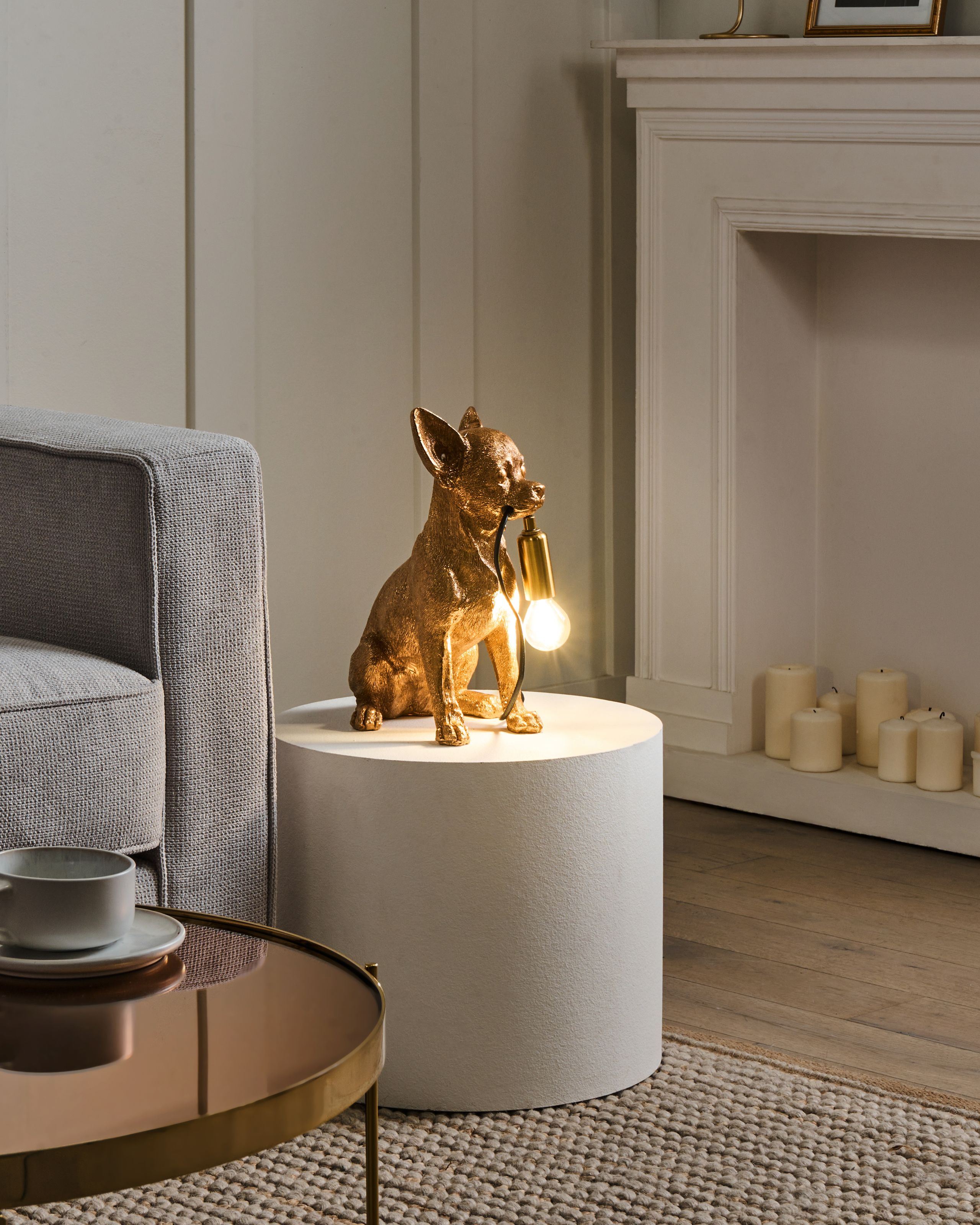 Tyylikäs koiravalaisin. Tämä pöytävalaisin ei ole pelkkä valaisin – se on viehättävä, käsintehty koriste, joka on muotoiltu suloisen koiran muotoiseksi. Se yhdistää visuaalisen viehätyksen toiminnallisuuteen ja on ainutlaatuinen lisä kodikkaaseen olohuoneeseen tai lastenhuoneeseen. Lämmin kullanvärinen viimeistely lisää eleganssia, ja kestävä polyhartsi takaa erinomaisen laadun moniksi vuosiksi.