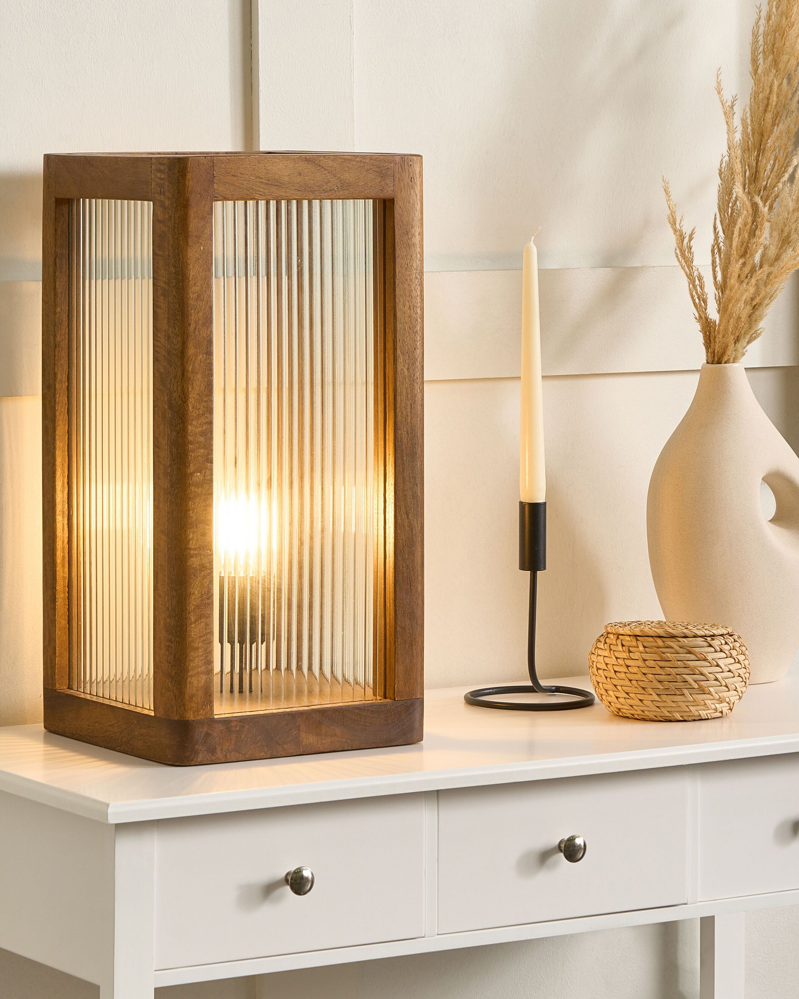 Industriaalinen yöpöydän valaisin. Tämän kiehtovan, ainutlaatuisen pöytävalaisimen avulla jokapäiväinen tilasi muuntuu tunnelmalliseksi tilaksi, jossa rentoutua hämärän koittaessa. Upean ilmeensä lisäksi valaisimelle on ominaista myös kestävyys – se on valmistettu mangopuusta ja lasipaneeleista, joten se ei vaadi päivittäistä huoltoa ja kestää useita vuosia. Pehmeää, tunnelmallista valoa säteilevä valaisin valaisee makuuhuoneesi ja koristaa sisustusta modernilla, industriaalisella ilmeellään.