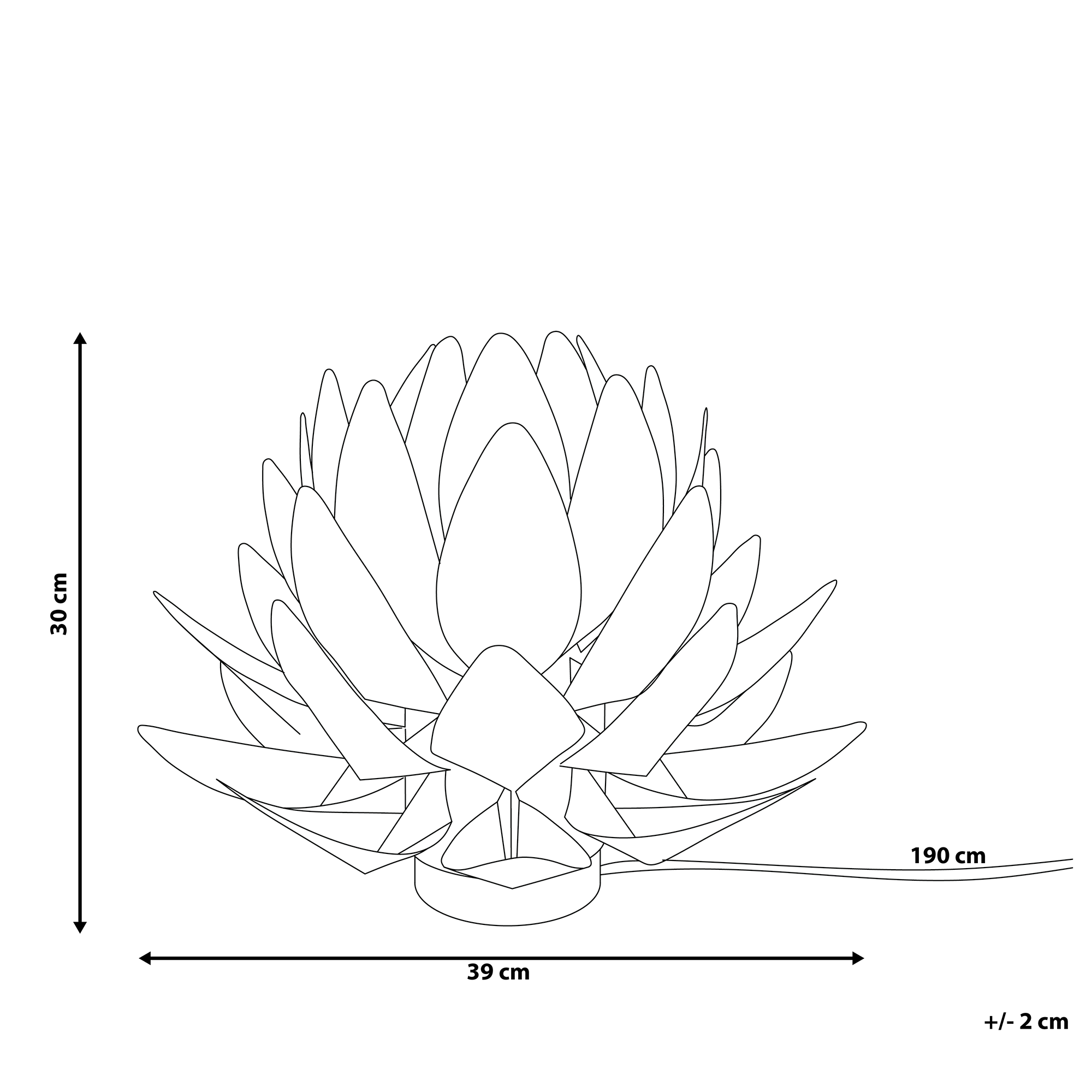 Kukan muotoinen pöytävalaisin. Kukkaa muistuttava pöytävalaisin, joka koostuu useista valkoisista muoviosista. Ylöspäin avautuva terälehtimäinen asetelma luo kauniin tunnelmavalaistuksen esimerkiksi makuuhuoneeseen, olohuoneeseen tai toimistoon. Leikkisän muotoilunsa ja värinsä ansiosta valaisin toimii katseenkääntäjänä kaikenlaisissa sisustustyyleissä. Mukana yhteensopiva valkoinen johto katkaisijalla.