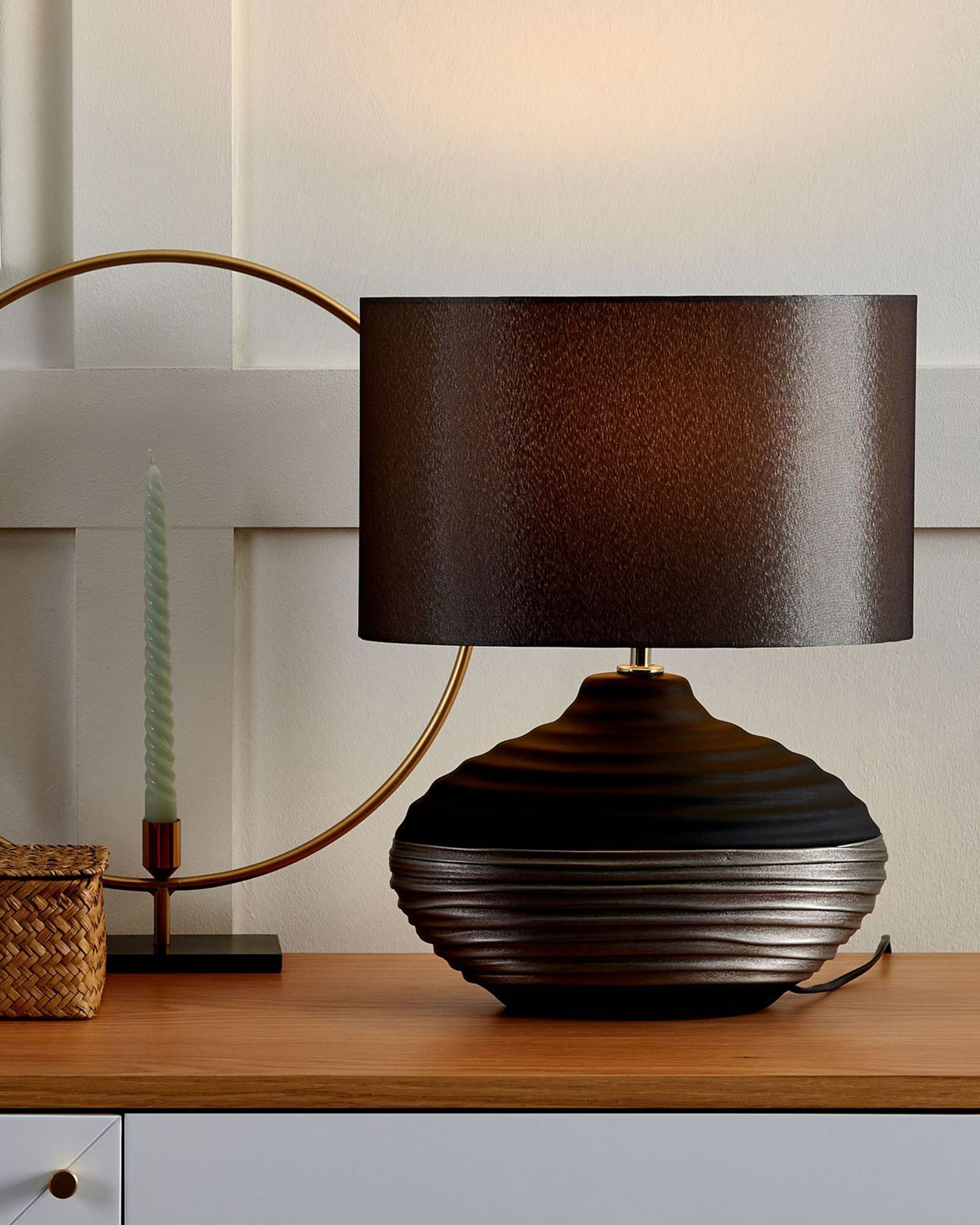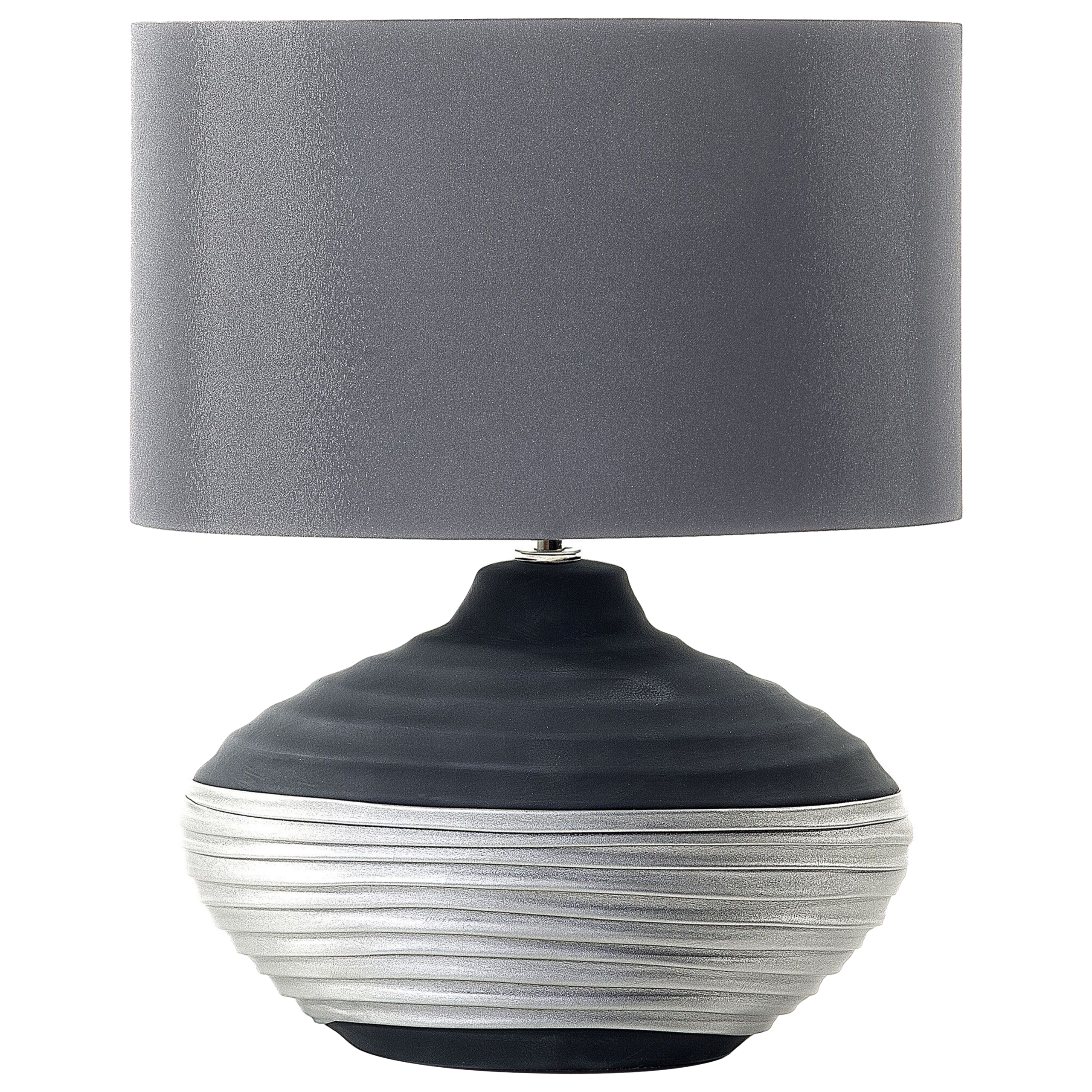 Elegantti valaisin kangasvarjostimella. Ylellinen pöytävalaisin tarjoaa hurmaavan valaistuksen kodin sisustukseen. Epäsymmetrisen ovaali jalka on valmistettu harmaasta posliinista, joka on viimeistelty kaiverretuilla juovilla ja valkoisella korosteella. Vaaleamman harmaan sävyinen varjostin antaa valaisimelle hienostuneen ilmeen ja korostaa sen jalkaa kauniisti. Sylinterin muotoinen varjostin on valmistettu keinosilkistä, joka levittää valoa ja tarjoaa tunnelmallisen valaistuksen. Pienen kokonsa ansiosta se on monikäyttöinen koroste, joka sopii sisustukseen kuin sisustukseen.