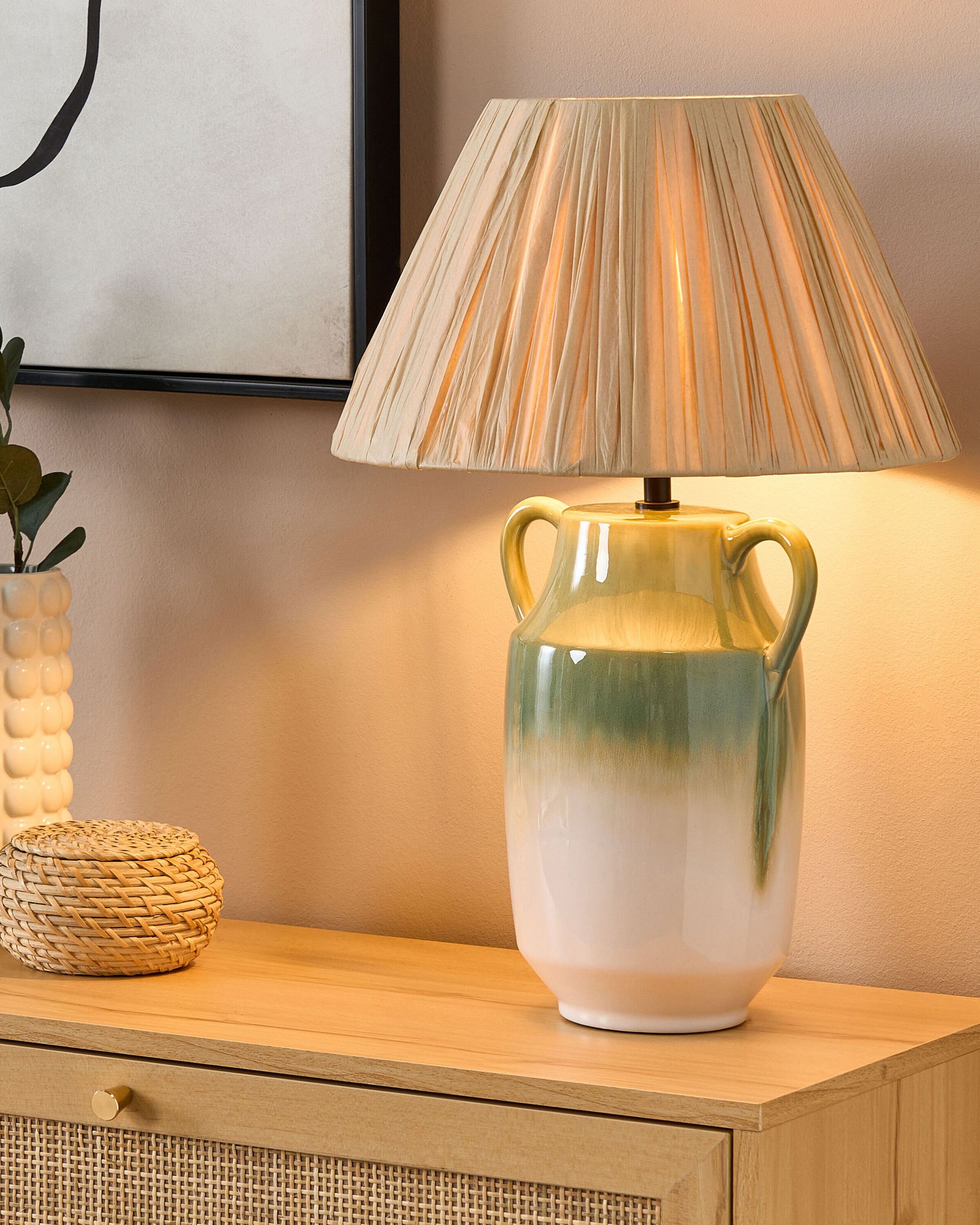 Boheemi yöpöydän valaisin paperivarjostimella. Koe boho-eleganssin huipentuma tällä pöytävalaisimella. Sen maljakkoa muistuttava jalka on valmistettu keraamista, jota koristavat sirot kahvat. Paperista valmistettu kartiovarjostin on vahvistettu raudalla. Se tarjoaa lempeän, luonnollisen hehkun, joka luo tilaan kuin tilaan rauhallisen ja tyylikkään valaistuksen. Valaise ympäristösi ripauksella luonnon loistoa.