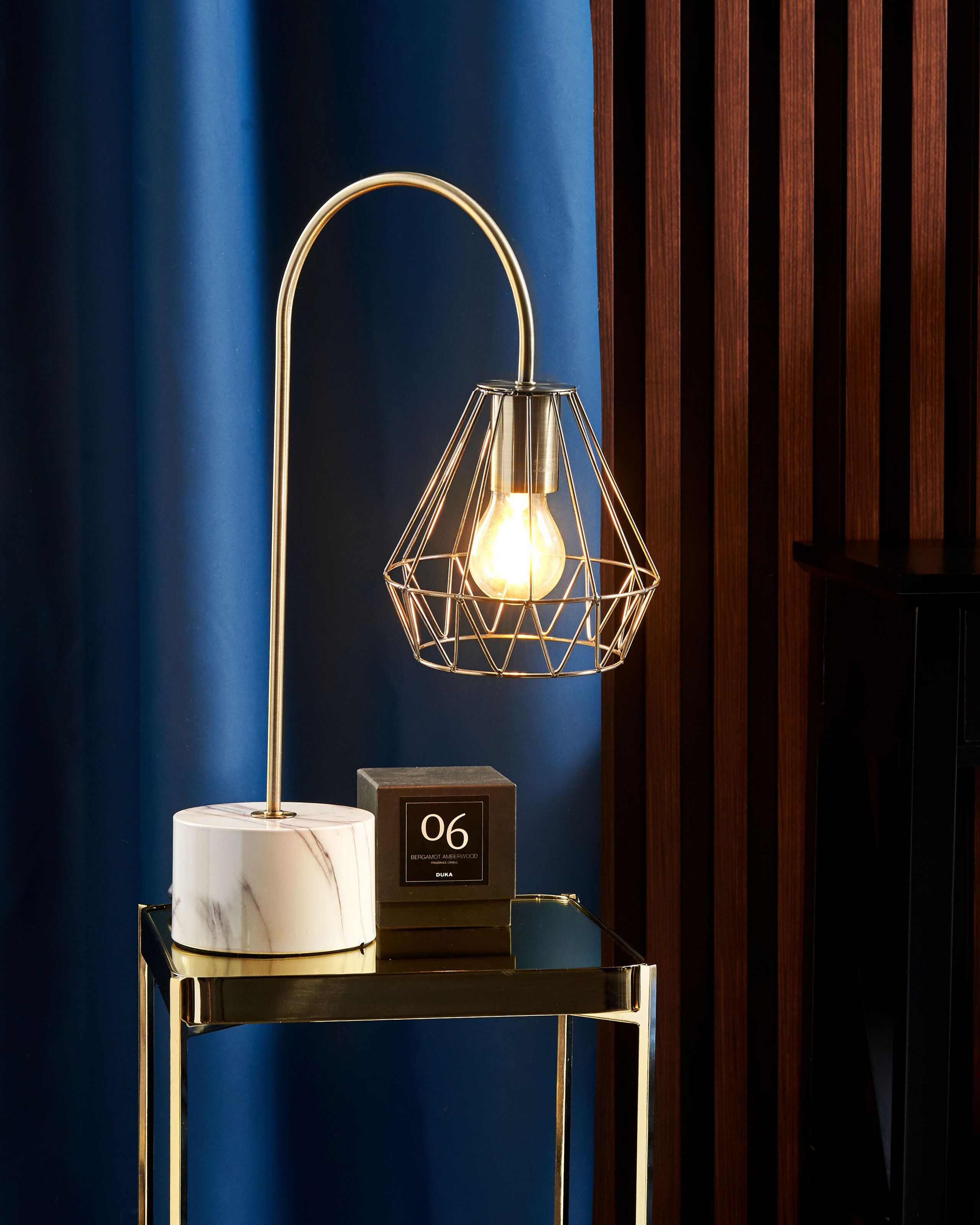 Elegantti valaisin geometrisella varjostimella. Modernia muotoilua parhaimmillaan. Timantinmallinen lampunvarjostin toimii katseenvangitsijana tilassa kuin tilassa. Varjostimen avoin rakenne jättää polttimon näkyville ja luo seinille upeita valo- ja varjoefektejä. Metallista valmistettu jalka takaa valaisimen tukevuuden.