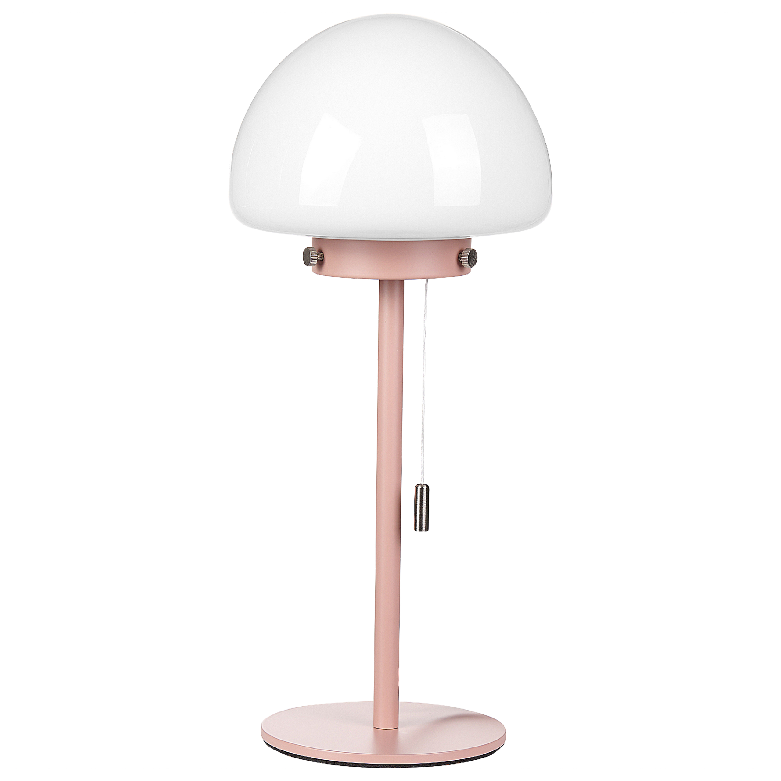 Minimalistinen yöpöydän valaisin lasivarjostimella. Kohota sisustuksesi ilmettä tällä kauniilla pöytävalaisimella. Puolipallon muotoinen valkoinen varjostin on valmistettu lasista. Yhdessä vaaleanpunaisen rautajalan kanssa se tekee valaisimesta katseita keräävän korosteen tilaan kuin tilaan – makuuhuoneesta olohuoneeseen. Leikkisä naruvedin antaa valaisimelle vintage-henkeä, tehden valaisimen sytyttämisestä ja sammuttamisesta helppoa. Valaisin sopii erinomaisesti sekä moderneihin että retrotyylisiin sisustuksiin.