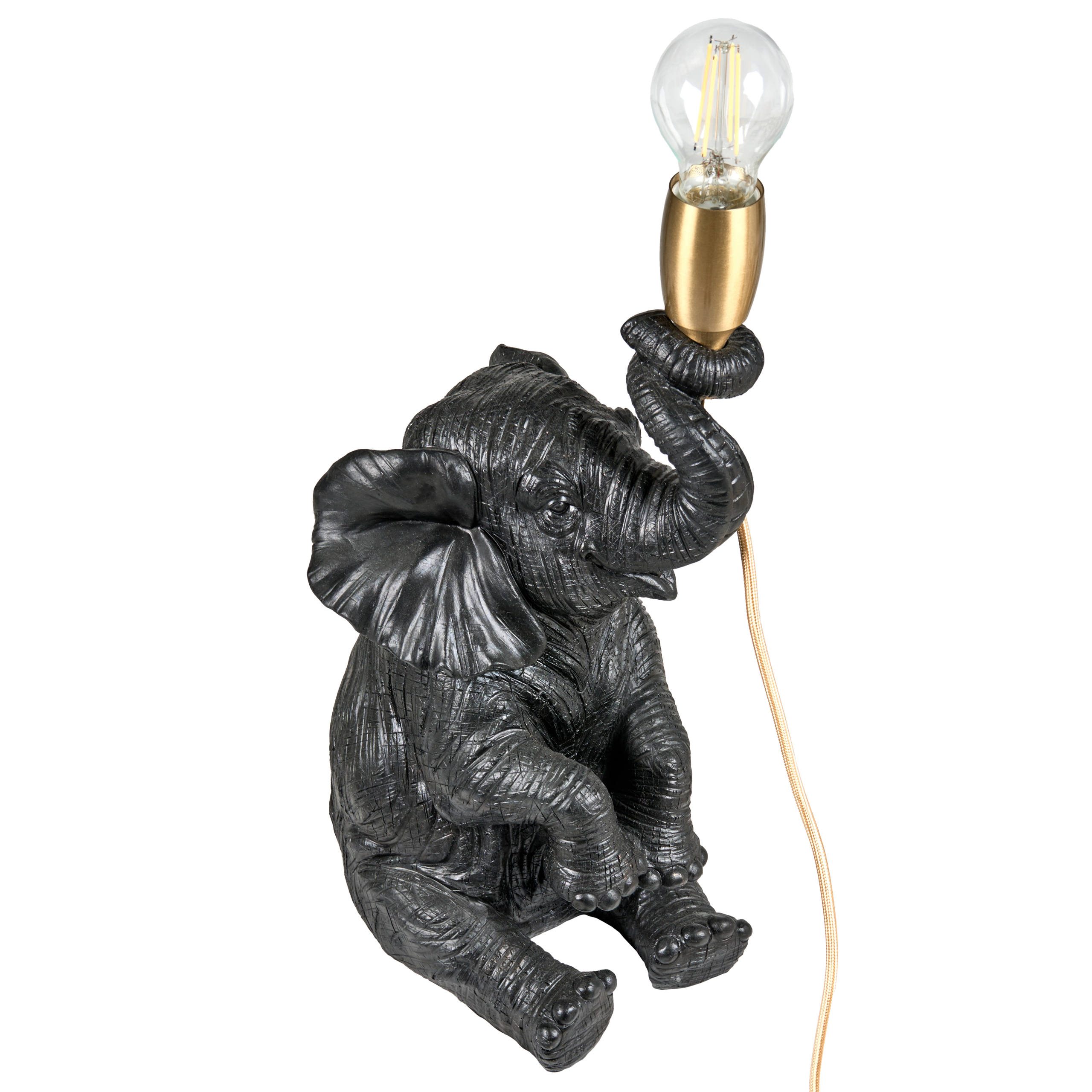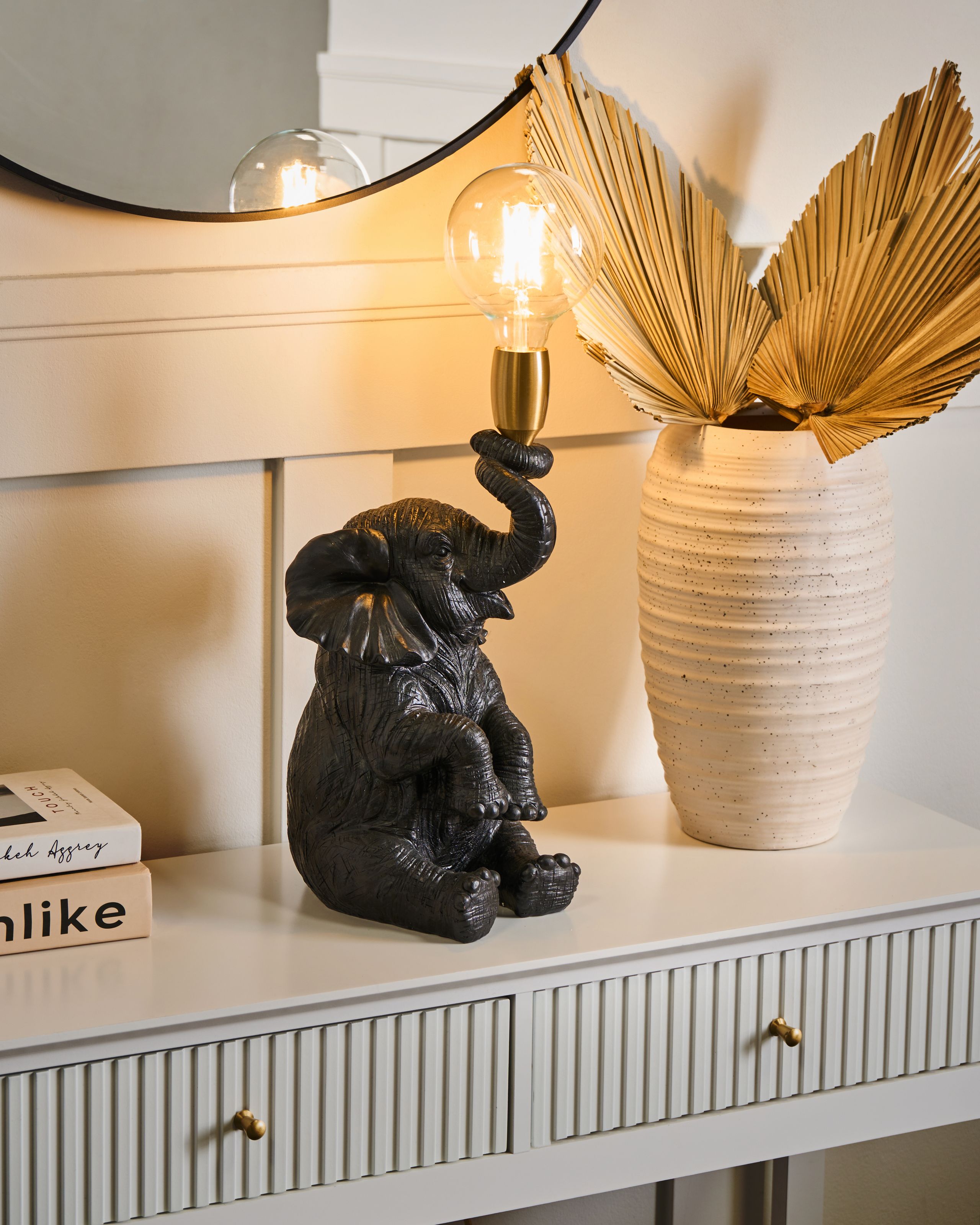 Suloinen norsuvalaisin. Tuo kotiin eksoottinen vivahde tällä käsintehdyllä, norsunmuotoisella pöytävalaisimella. Se on koristeellinen ja käytännöllinen lisä, joka sopii täydellisesti sekä olohuoneeseen että makuuhuoneeseen. Hienostunut musta viimeistely lisää valaisimeen tyylikkyyttä, ja se sulautuu vaivattomasti monenlaisiin sisustuksiin. Kestävä materiaali takaa, että valaisin pysyy suosikkina vuosien ajan.