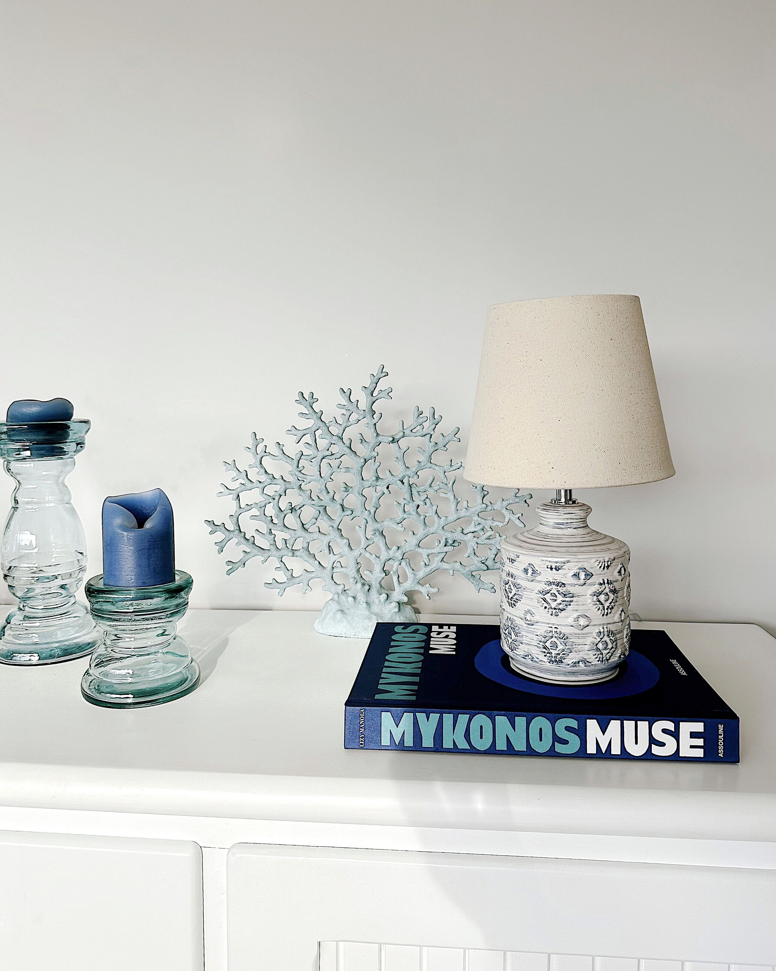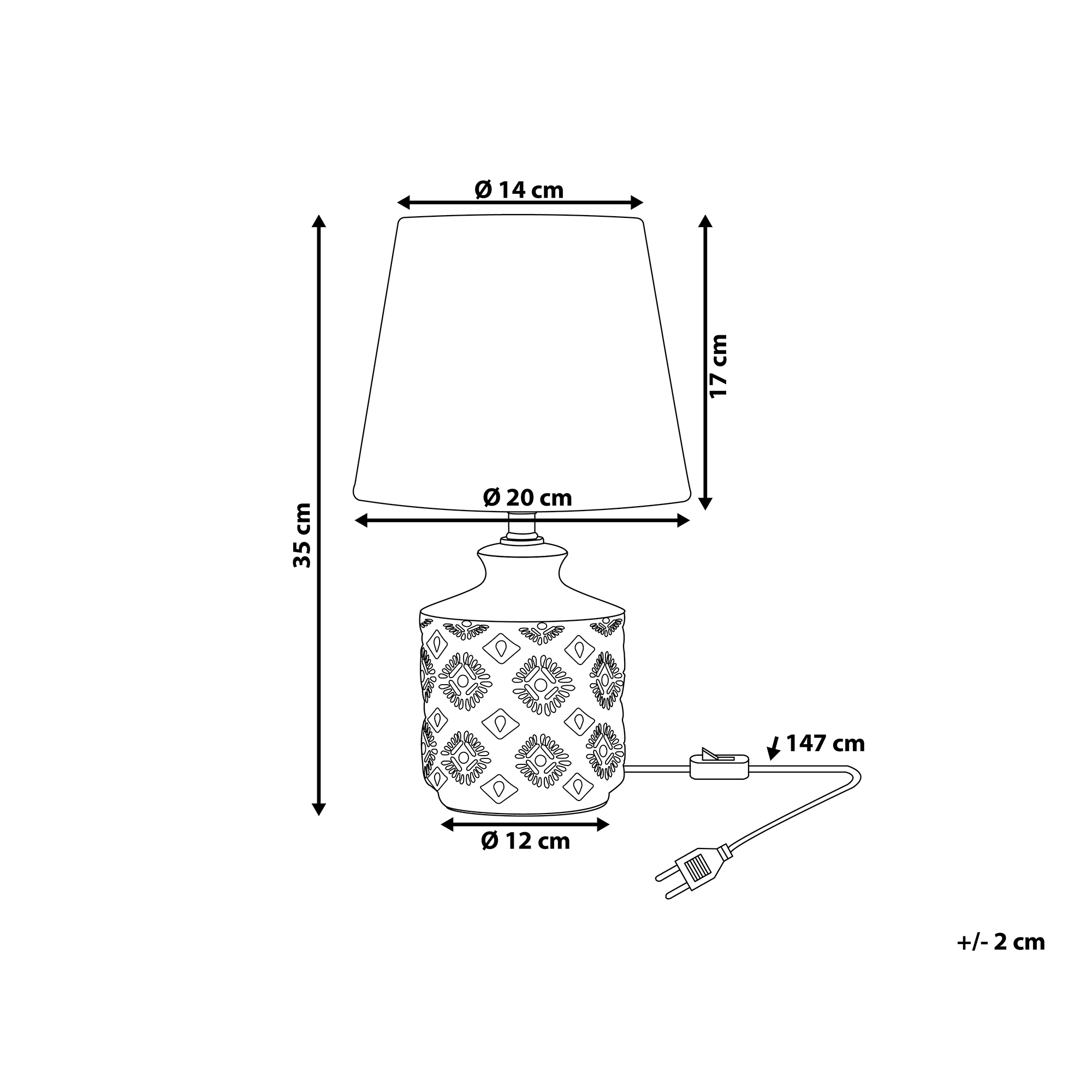 Vintage-tyylinen valaisin kangasvarjostimella. Vintage-tyylin, klassisen tai modernin sisustuksen rakastajille. Kaunis jalan vintage-tyylinen kuviointi sopii erityisen hyvin täydentämään sinistä sisustusta ja toimii esineenä, jota katseella ei voi ohittaa. Sopii kauniisti olohuoneen sivupöydälle tai makuuhuoneen yöpöydälle tuomaan tunnelmavaloa.