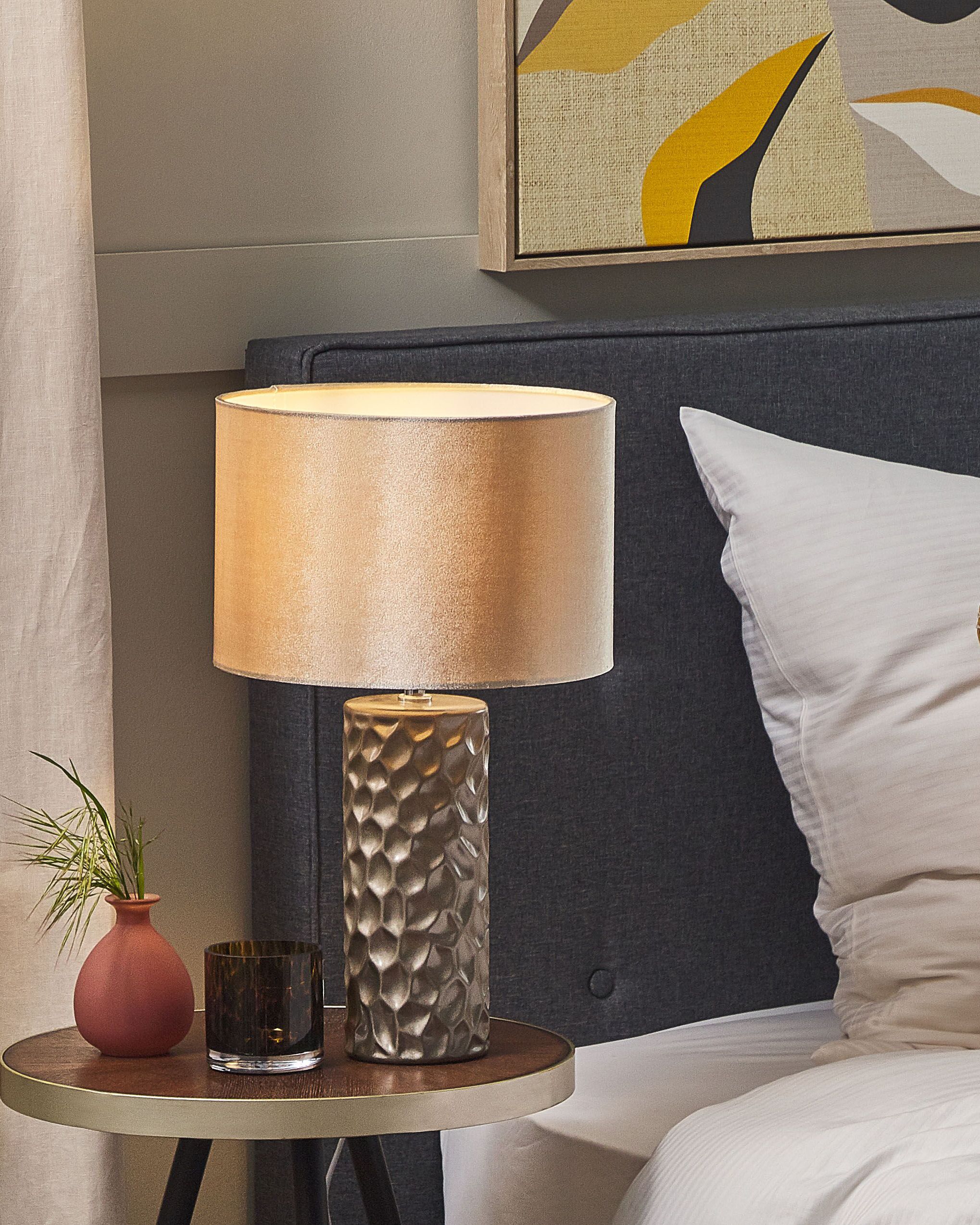 Glamour-tyylinen yöpöydän valaisin. Päivitä sisustustasi ja tuo ripaus glamour-tyyliä tämän pöytävalaisimen avulla. Keraamista jalkaa koristaa samettinen varjostin, jotka sopivat täydellisesti yhteen. Ajattoman muotoilunsa ja uniikin hunajakennomaisen kuvion ansiosta valaisin on loistava koriste niin kotitoimistoon kuin makuu- ja olohuoneeseen.