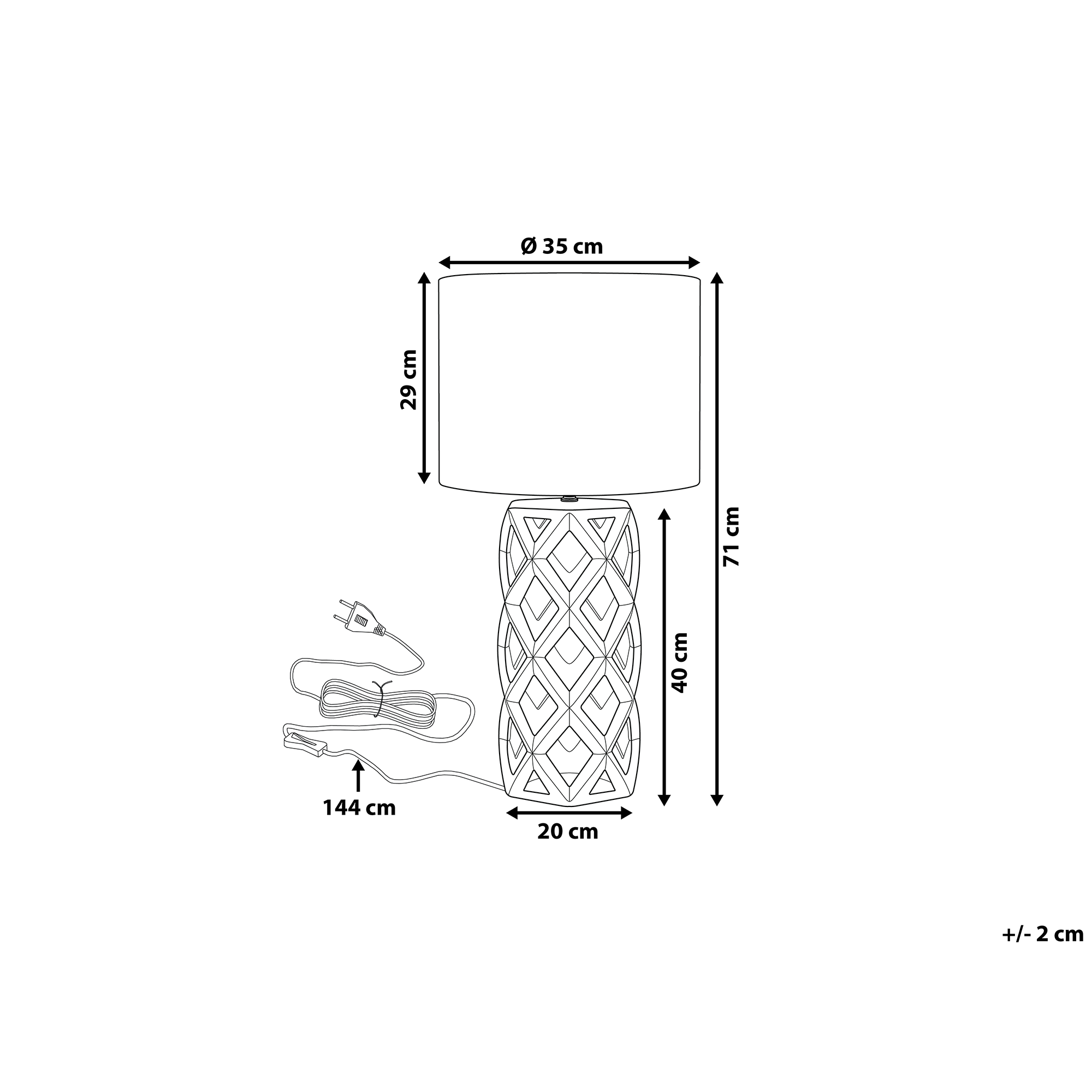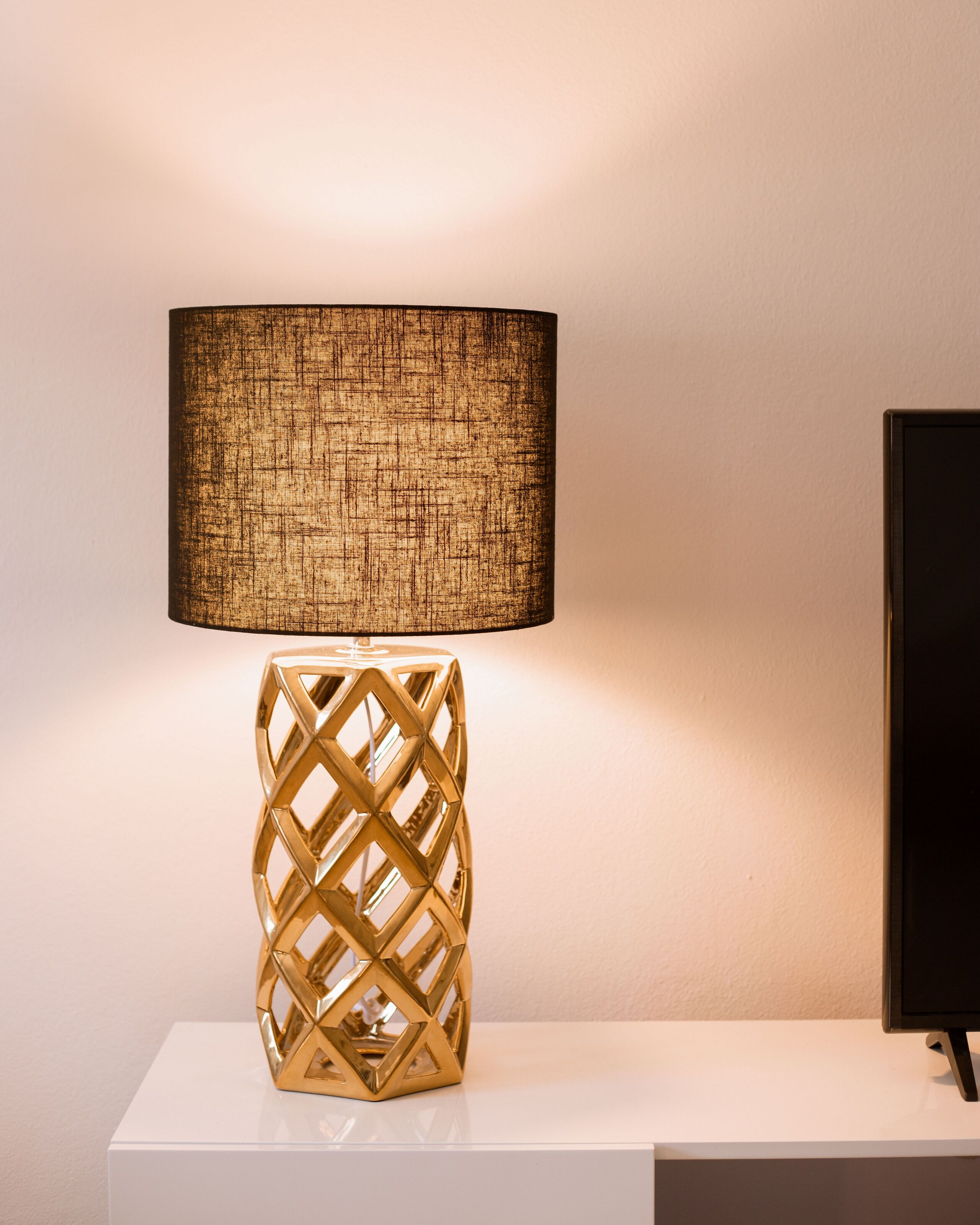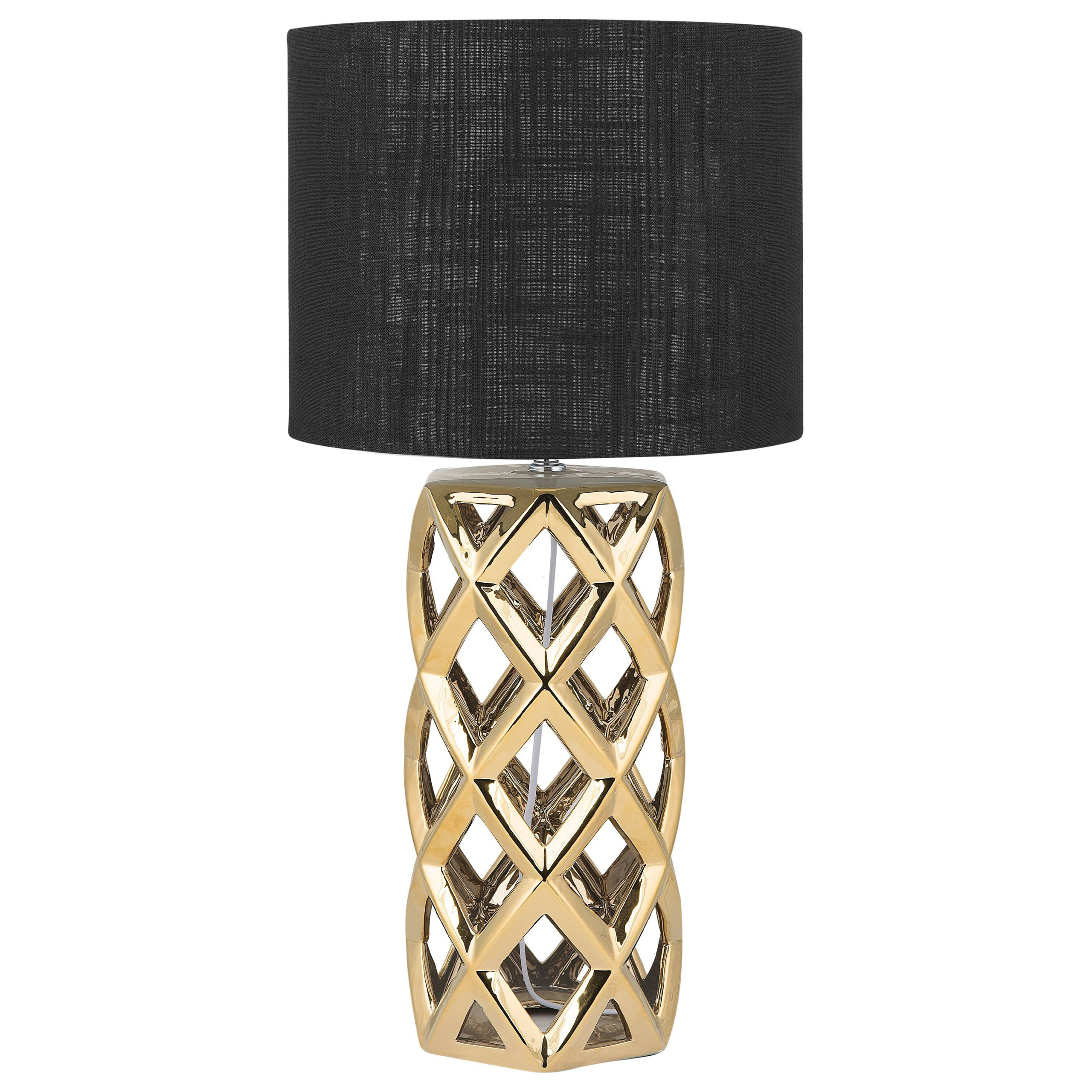 Glamour-tyylinen geometrinen valaisin. Lisää sisustukseesi modernia ilmettä tällä upealla pöytävalaisimella. Avoimen kultaiseksi maalatun keraamisen jalan ansiosta lamppu on kestävä sekä tyylikäs elementti missä tahansa sisustuksessa. Musta pyöreä kangasvarjostin mahdollistaa valon pehmeän leviämisen huoneeseen. Valaisin sopii loistavasti olohuoneen sivupöydälle tai makuhuoneen yöpöydän lukulampuksi.