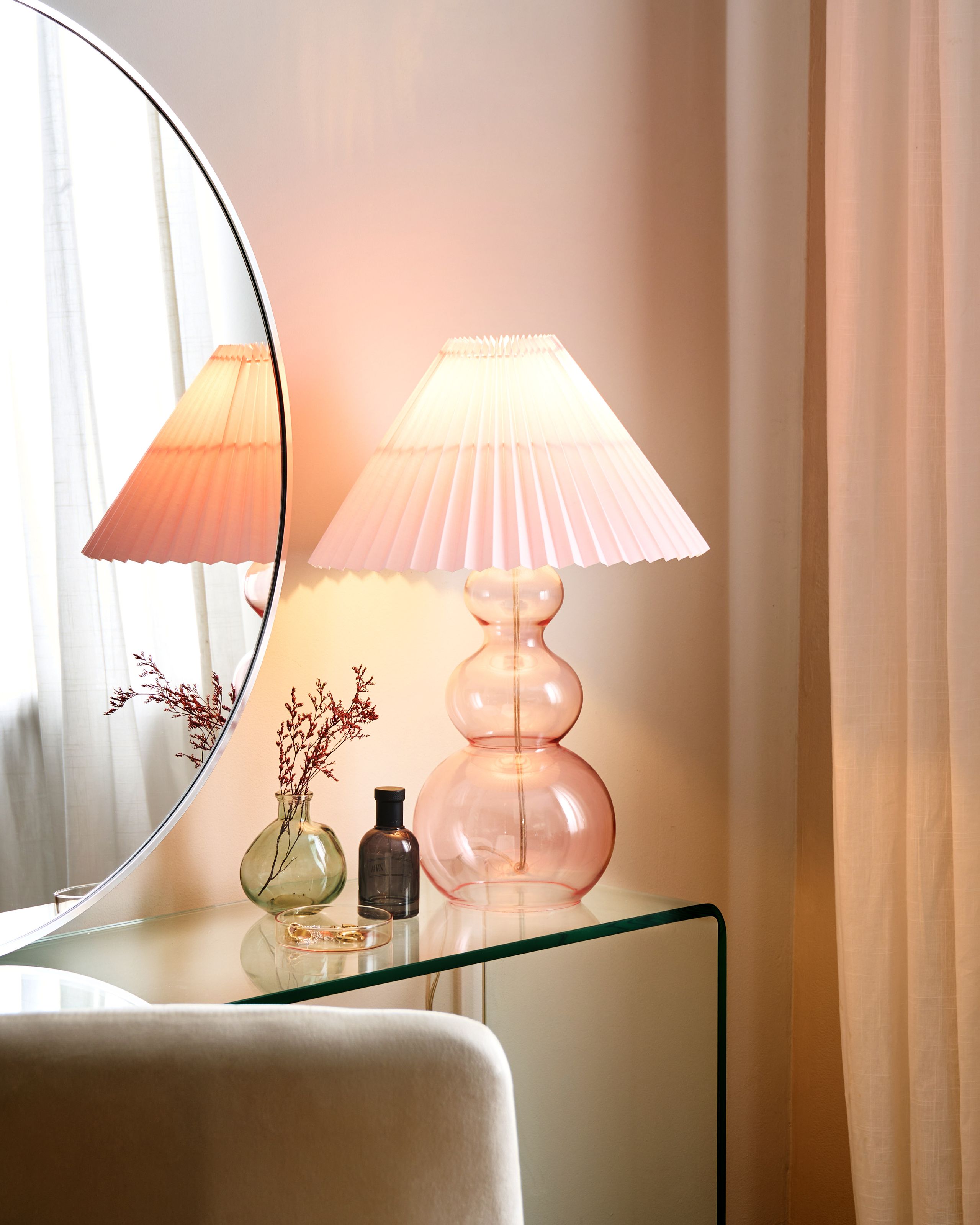 Moderni valaisin laskostetulla varjostimella. Tämä viehättävä pöytävalaisin on hienostunut korostus, joka lisää sisustukseen välitöntä lämpöä. Ainutlaatuinen, vaaleanpunaisesta lasista valmistettu jalka kiinnittää katseen orgaanisella, veistoksellisella muodollaan. Laskostettu kangasvarjostin levittää tilaan pehmeää, tunnelmallista valoa, luoden kodikkaan ja rentouttavan tunnelman. Valaisin sopii erinomaisesti käytännölliseksi koristeeksi olohuoneeseen, makuuhuoneeseen tai kotitoimistoon.