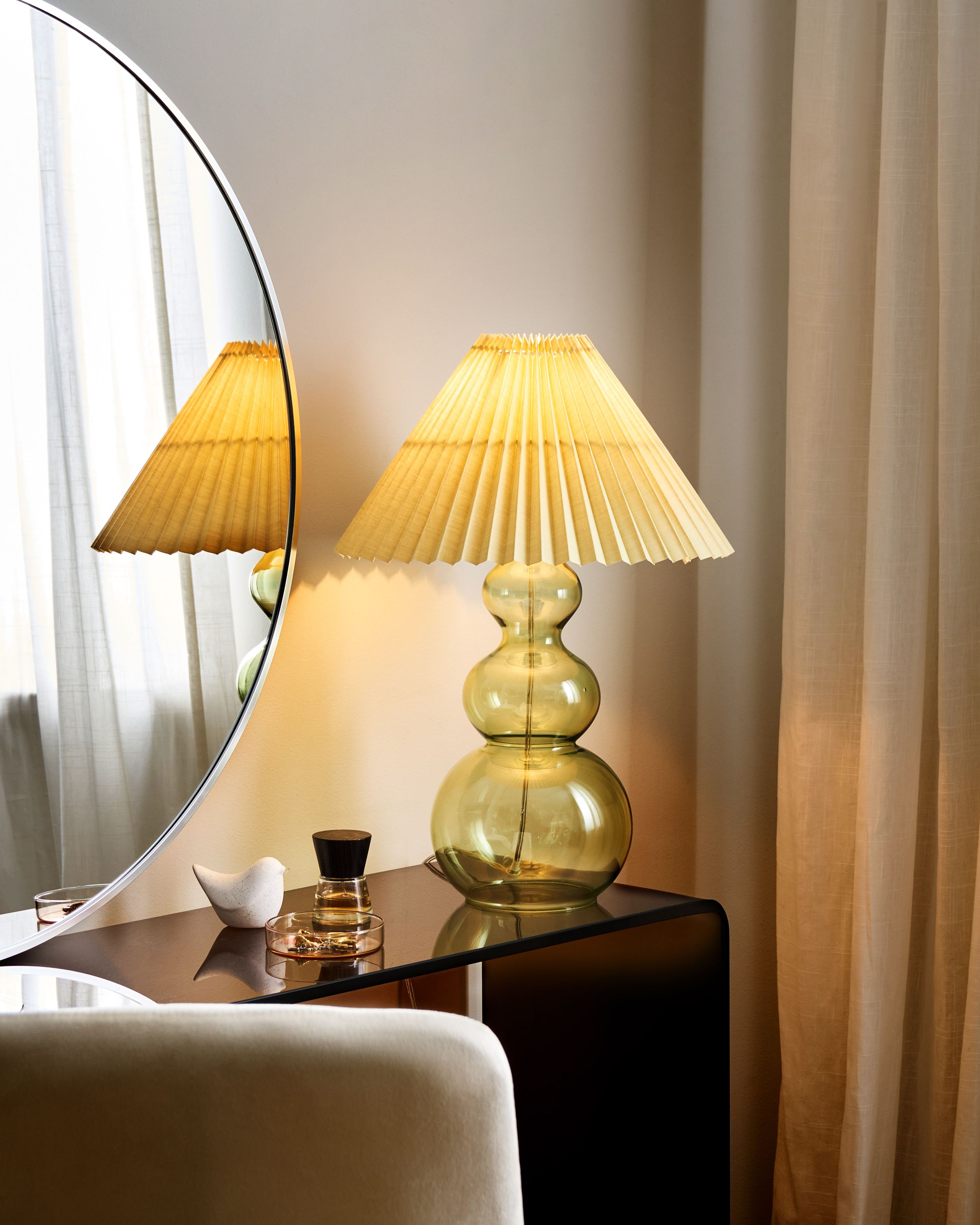 Moderni valaisin laskostetulla varjostimella. Tämä viehättävä pöytävalaisin on hienostunut korostus, joka lisää sisustukseen välitöntä lämpöä. Ainutlaatuinen, vihreästä lasista valmistettu jalka kiinnittää katseen orgaanisella, veistoksellisella muodollaan. Laskostettu kangasvarjostin levittää tilaan pehmeää, tunnelmallista valoa, luoden kodikkaan ja rentouttavan tunnelman. Valaisin sopii erinomaisesti käytännölliseksi koristeeksi olohuoneeseen, makuuhuoneeseen tai kotitoimistoon.