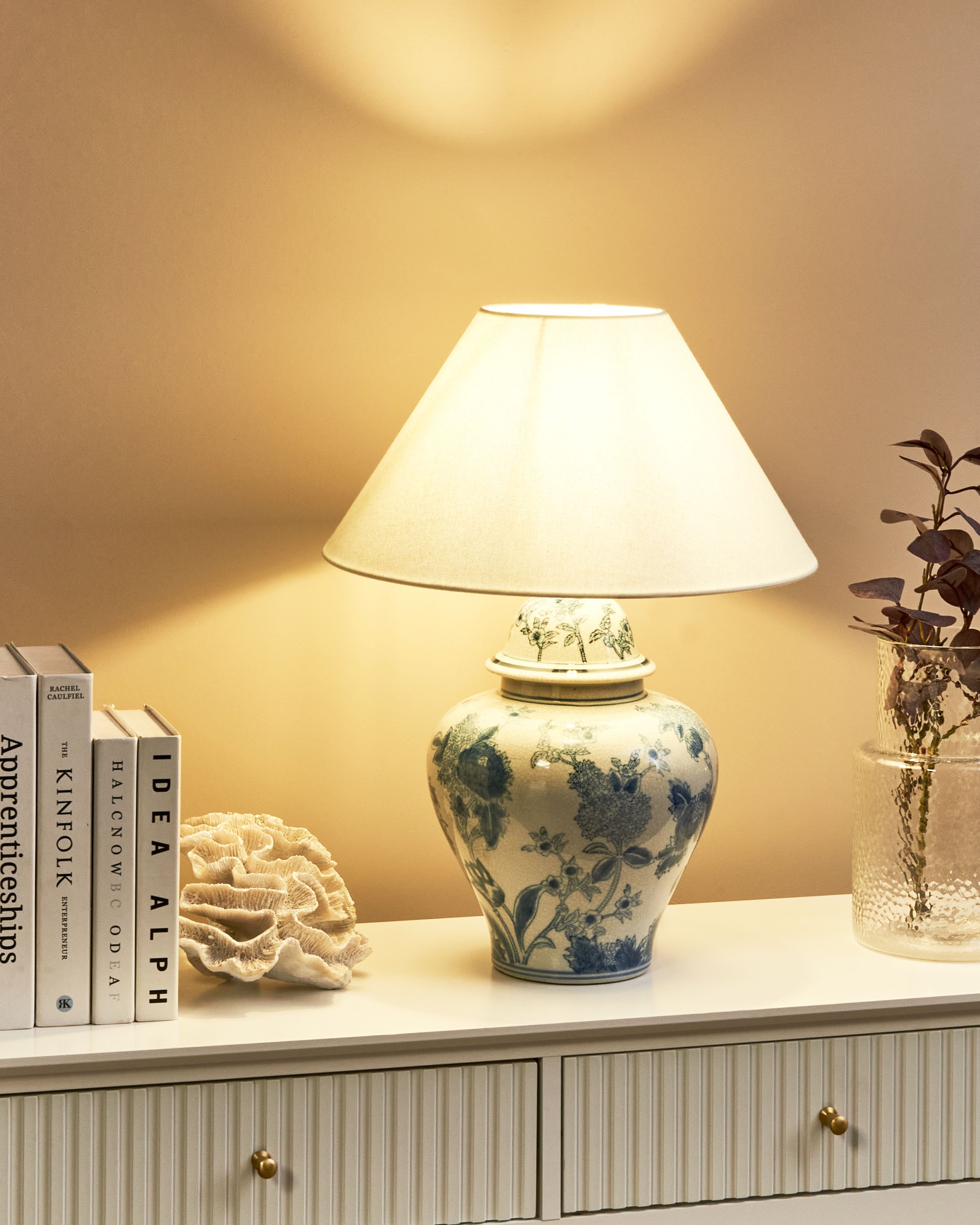 Välimerellinen koristeellinen valaisin. Tämä pöytävalaisin on täydellinen yhdistelmä toimivuutta ja tyyliä. Kestävä posliinijalusta, jossa on herkkä sininen kukkakuvio, on helppo ylläpitää, kun taas pellavavarjostin antaa pehmeää hajavaloa. Tämä valaisin on koristeellinen ja käytännöllinen kappale, joka tuo lämpöä ja eleganssia mihin tahansa tilaan.