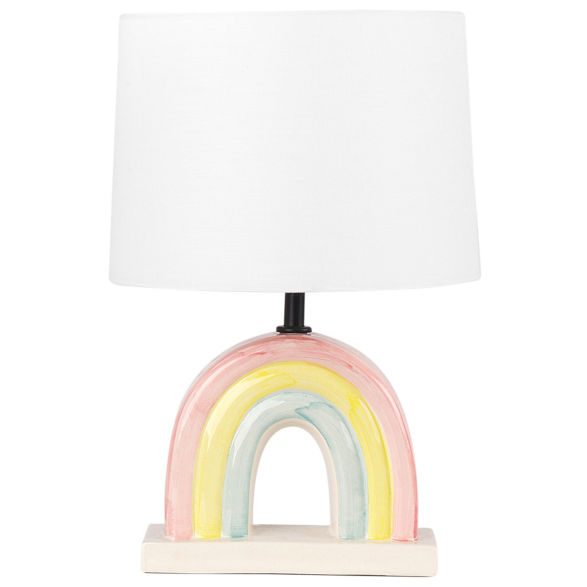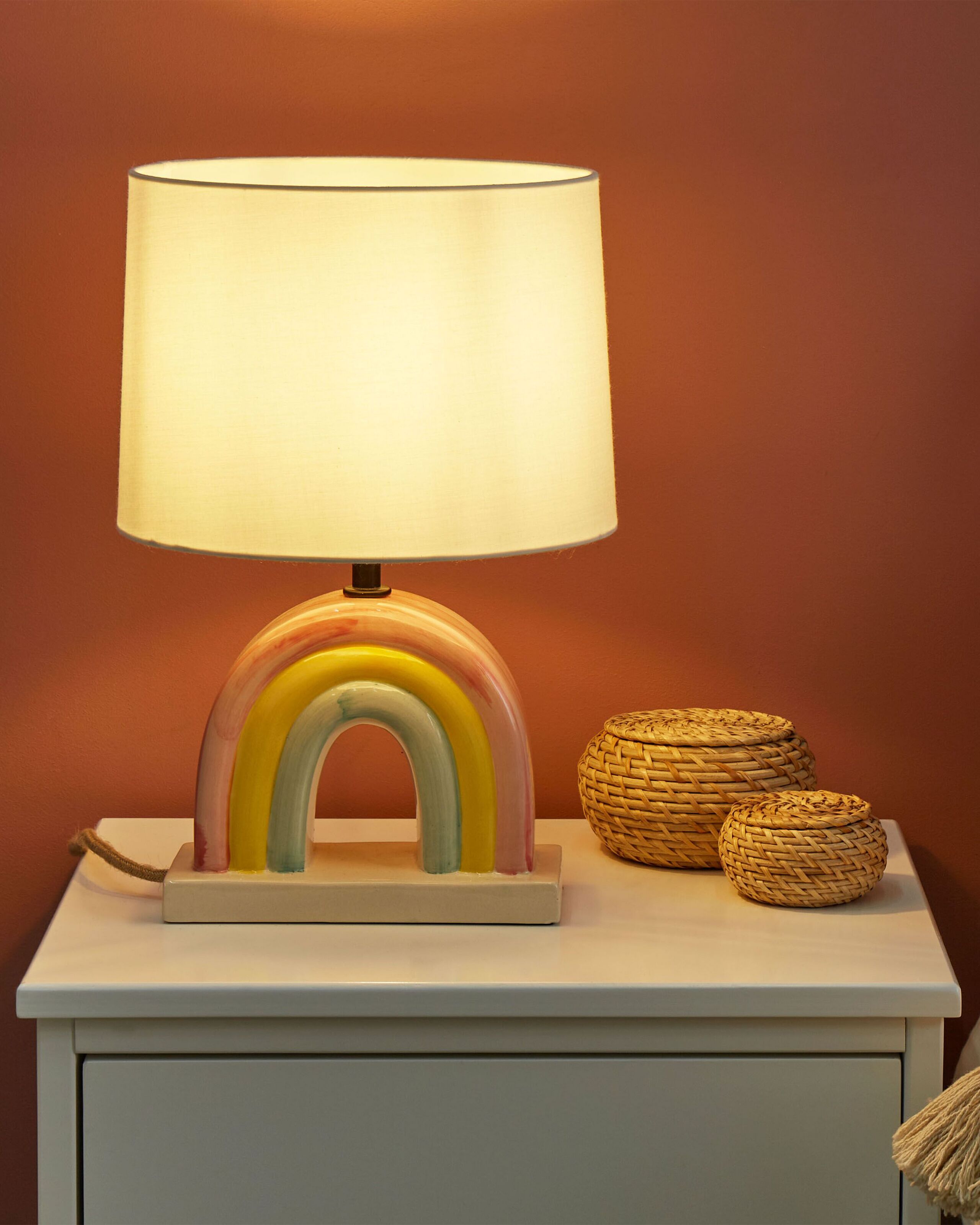 Moderni käsintehty valaisin. Tuo piristävä tuulahdus olohuoneeseen tai lastenhuoneeseen tällä käsintehdyllä pöytävalaisimella. Valaisimessa on monivärinen, sateenkaaren muotoinen jalka, joka kiinnittää huomion ja tuo tilaan eklektistä ilmettä. Varjostin on valmistettu korkealaatuisesta polyesterin ja puuvillan sekoituksesta, mikä tekee siitä pitkäikäisen ja vähän ylläpitoa vaativan.