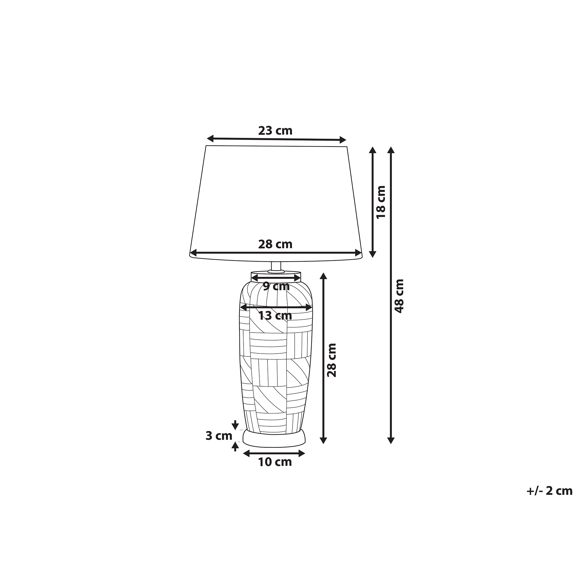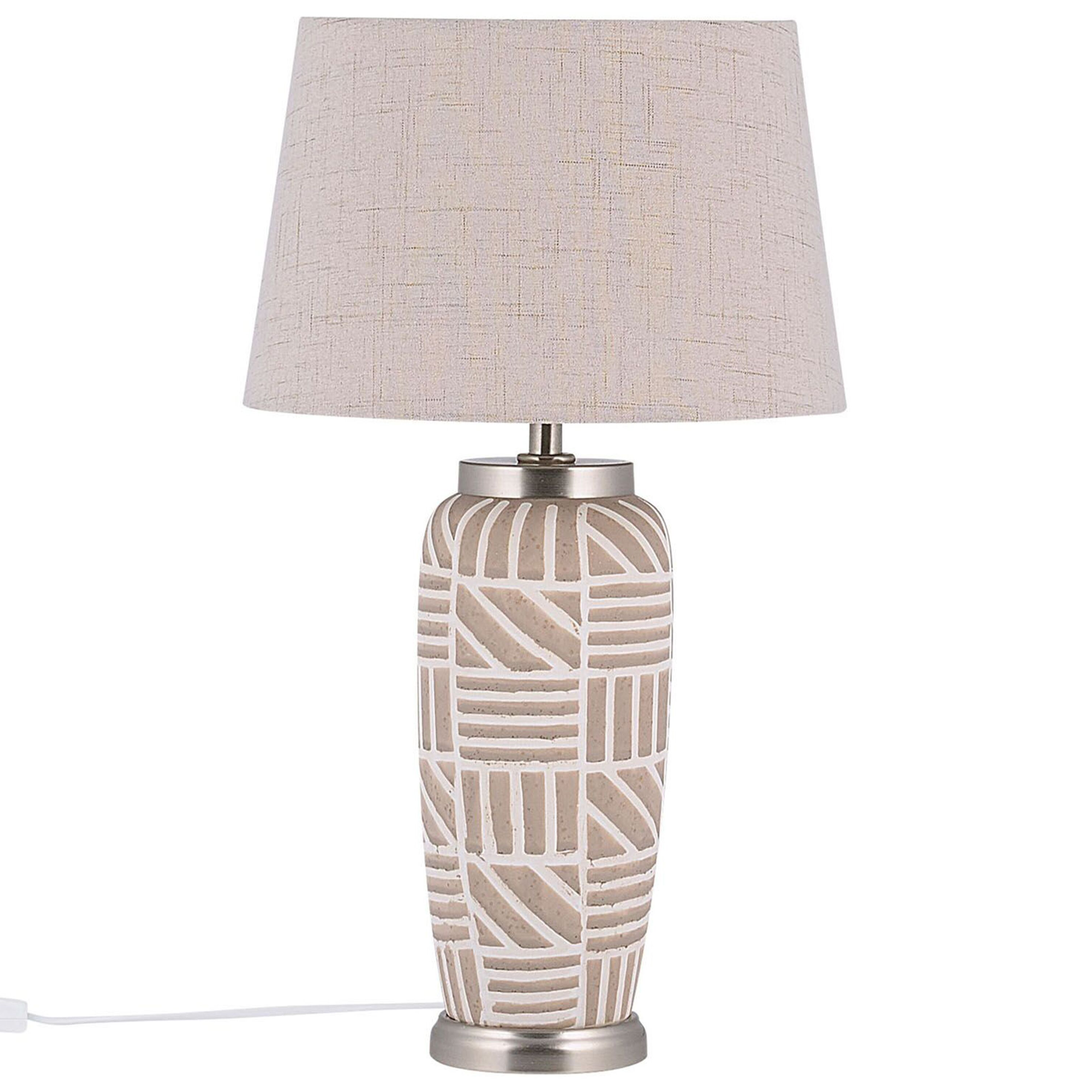 Perinteinen valaisin geometrisella kuvioinnilla. Luo lämpöisä tunnelma sisustukseen beigeillä väreillä ja miellyttävällä hajavalolla. Koristeellinen pöytävalaisin sopii loistavasti olohuoneen senkille tai makuuhuoneen yöpöydälle. Keramiikasta valmistettu jalka on viimeistelty upeilla, vaalean beigen sävyisillä geometrisilla kuvioinneilla, jotka antavat valaisimelle ainutlaatuisen ja modernin ilmeen. Yhteensopiva sylinterivarjostin on valmistettu polyesterin ja puuvillan sekoituksesta. Tämä kaunis ja käytännöllinen valaisin sopii loistavasti sekä klassisiin että nykyaikaisiin kodin sisustuksiin.