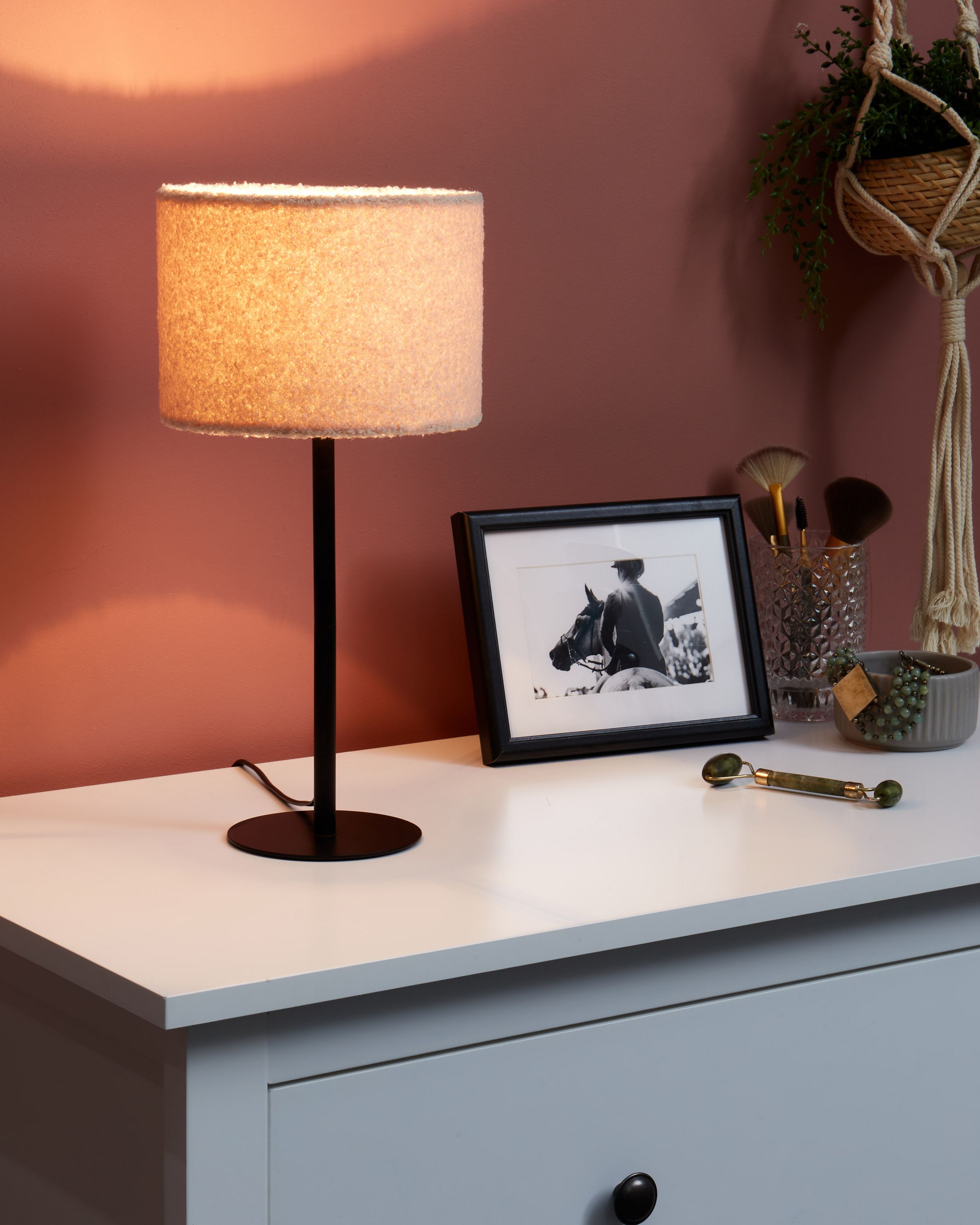 Moderni bukleevalaisin metallivarrella. Valaise tila pehmeällä hehkulla tämän trendikkään pöytävalaisimen avulla. Varjostin on päällystetty bukleekankaalla ja metallijalka takaa tukevuuden. Beige väri saa sen sopimaan monenlaiseen sisustustyyliin, kun taas koon ansiosta voit sijoittaa sen niin yöpöydälle kuin suuremmalle TV-tasolle tai sivupöydälle.