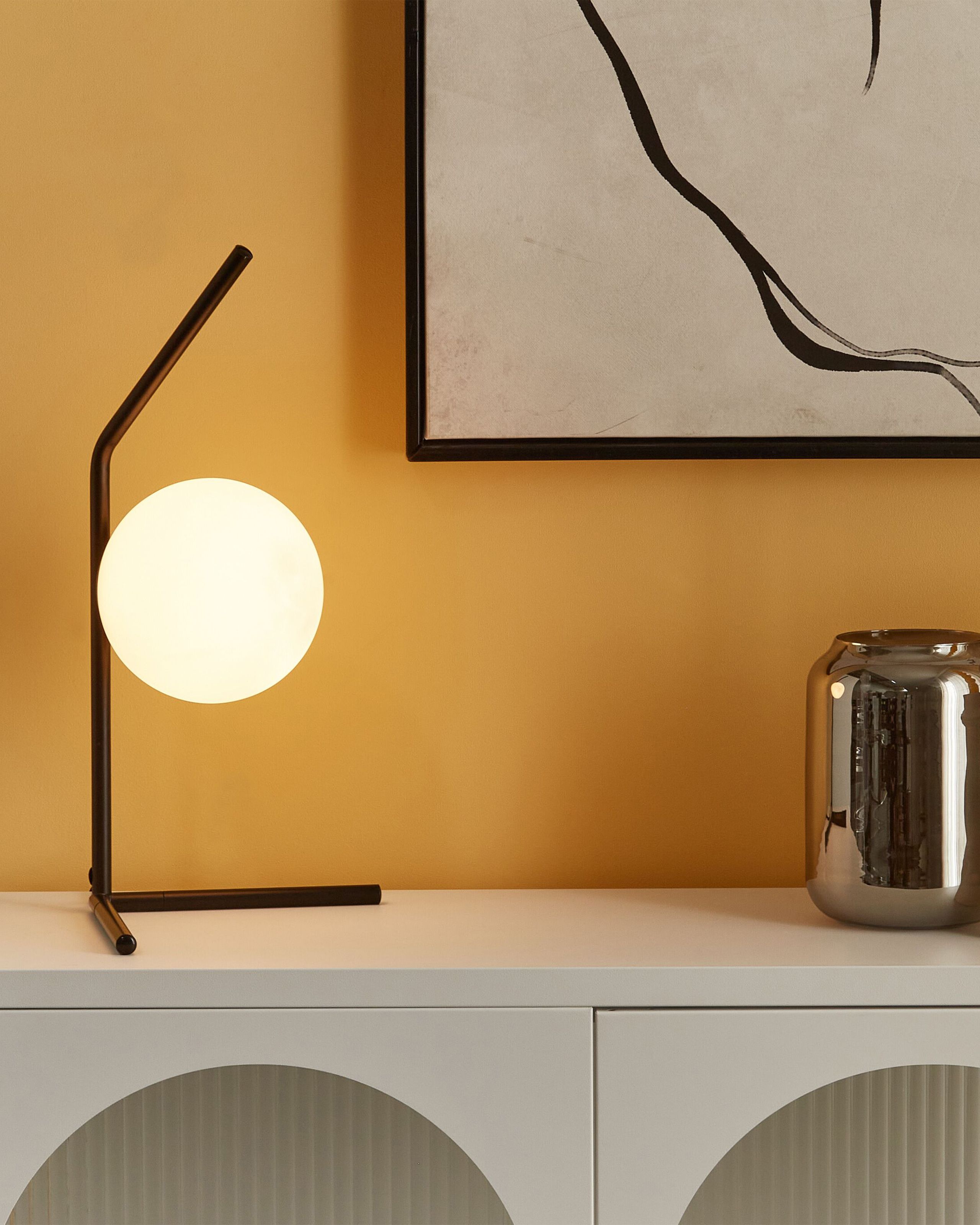 Moderni valaisin isolla varjostimella. Lisää tämä pöytävalaisin osaksi jokapäiväisen tilan sisustusta, luodaksesi hurmaavan tunnelman ja valaistaksesi tilan. Sen varjostin on valmistettu lasista, kun taas jalka on metallia. Modernin muotoilunsa ansiosta valaisin erottuu edukseen, kun taas ajaton värimaailma saa sen sopimaan moniin nykyaikaisiin sisustuksiin. Suuri, pyöreä varjostin on näyttävä koroste, joka levittää tasaista hajavaloa suurempaankin olohuoneeseen tai makuuhuoneeseen.