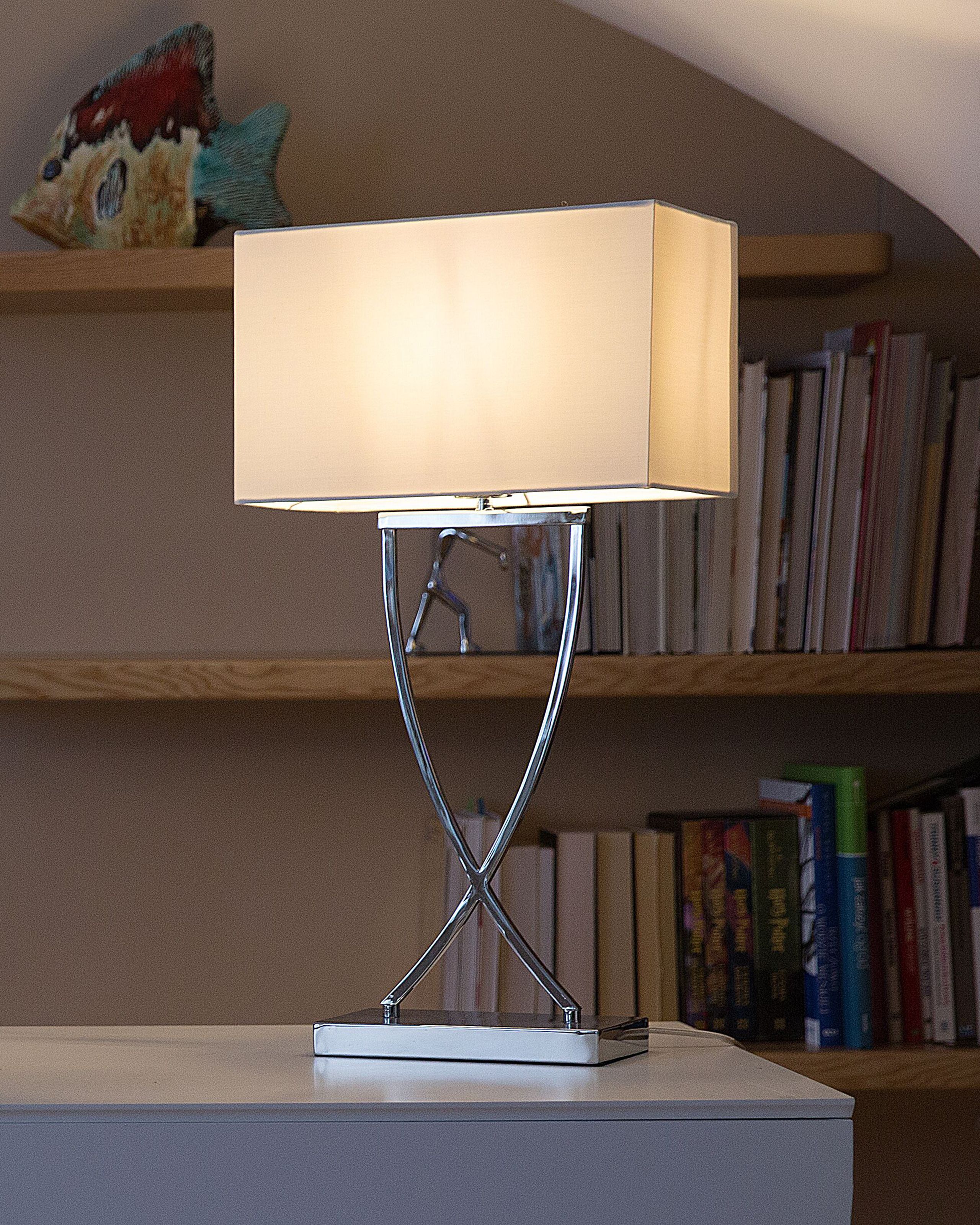 Moderni suorakulmainen valaisin. Rauhoittavaa ja himmeää valoa upealla muotoilulla, kaikki yhdessä upeassa pöytävalaisimessa. Hopeanvärisen, tyylikkään kierteisen varren ja jalustan yhdistelmä suorakaiteenmuotoisen valkoisen varjostimen kanssa tulee olemaan katseenvangitsija kodissasi, toimien samalla loistavana hyötyesineenä. Sen sirot mitat mahdollistavat lähes universaalin sijoituksen, oli kyseessä sitten olohuone, makuuhuone tai kotitoimisto, valaisimen valo on ihastuttava kaikkialla.