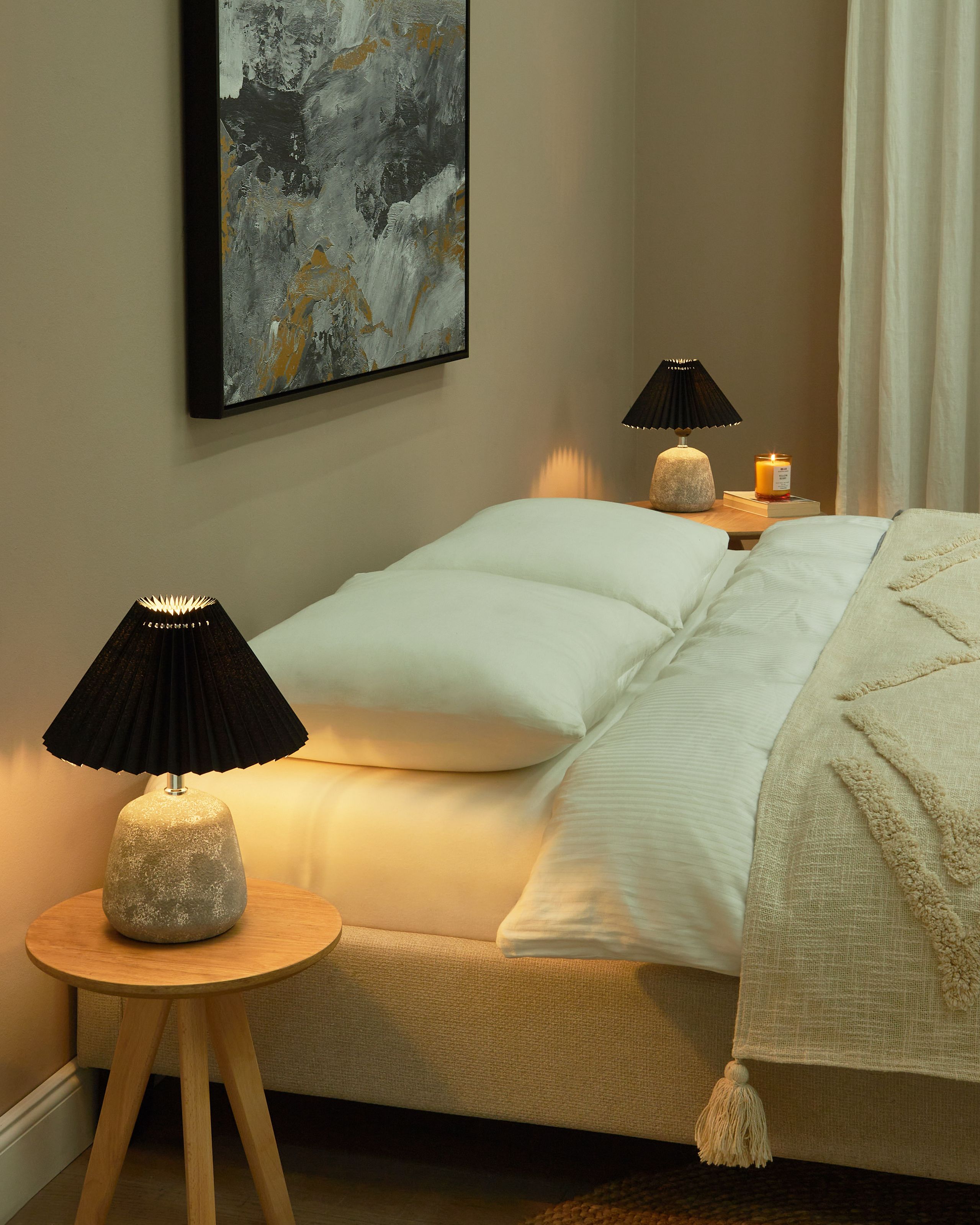 Moderni yöpöydän valaisinsetti. Tämä 2 keraamisen pöytävalaisimen setti sopii täydellisesti kodin intiimin ja viihtyisän tunnelman luomiseen. Se on suunniteltu raa'an näköisellä betoniefektillä, joka tuo siihen maalaismaista charmia, joten se sopii erinomaisesti yöpöydille tai eteiseen, joissa tarvitaan lisävaloa. Synteettisellä varjostimella täydennettynä se on tyylikäs valaistusratkaisu moderniin kotiin.