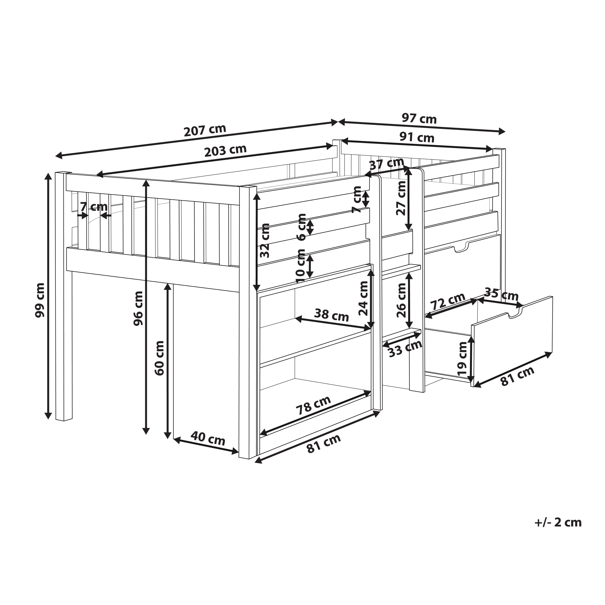 Moderni lasten puoliparvisänky hyllyillä ja vetolaatikoilla. Moderni lasten puoliparvisänky on valmistettu vankasta kumipuusta, mikä takaa kestävyyden ja pitkäikäisen laadun. Sängyn alla on kaksi tilavaa, MDF-levystä valmistettua vetolaatikkoa ja kaksi hyllyä lelujen tai tekstiileiden säilytykseen. Sisäänrakennettujen tikkaiden ansiosta korotetulle nukkuma-alueelle on helppo kiivetä. Tämä sänky tuo sekä tyyliä että toiminnallisuutta mihin tahansa lastenhuoneeseen.