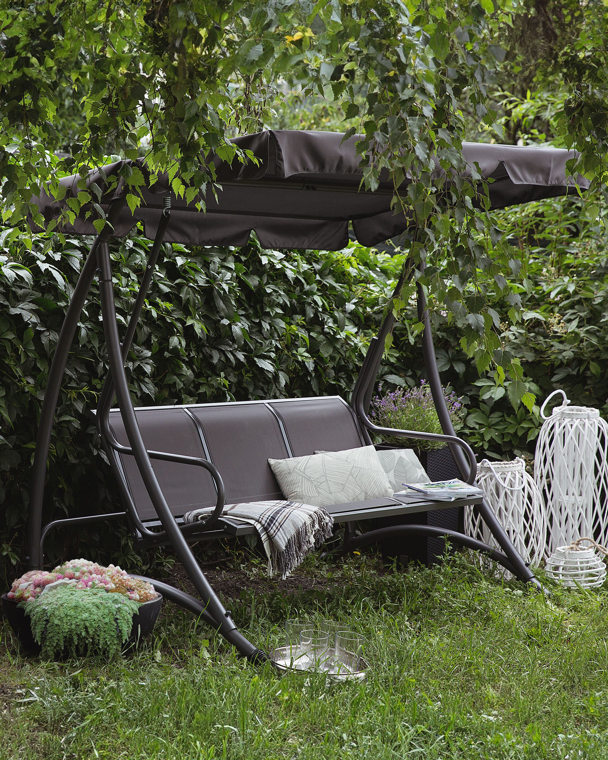 Moderni puutarhakeinu katoksella. Tyylikäs puutarhakeinu tarjoaa puutarhaan mukavan modernin paikan, jossa rentoutua ja viettää aikaa ystävien kanssa. Jauhemaalatusta teräksestä valmistettu runko on erittäin vankka ja säänkestävä. Jämäkästä verkkokankaasta valmistetut istuimet tarjoavat mukavan tuen, ja yhteensopiva polyesteristä valmistettu katos suojaa auringolta ja tuulelta. Materiaaliensa ansiosta puutarhakeinu on erittäin helppohoitoinen. Leveät istuimet tarjoavat istumatilaa jopa kolmelle hengelle.