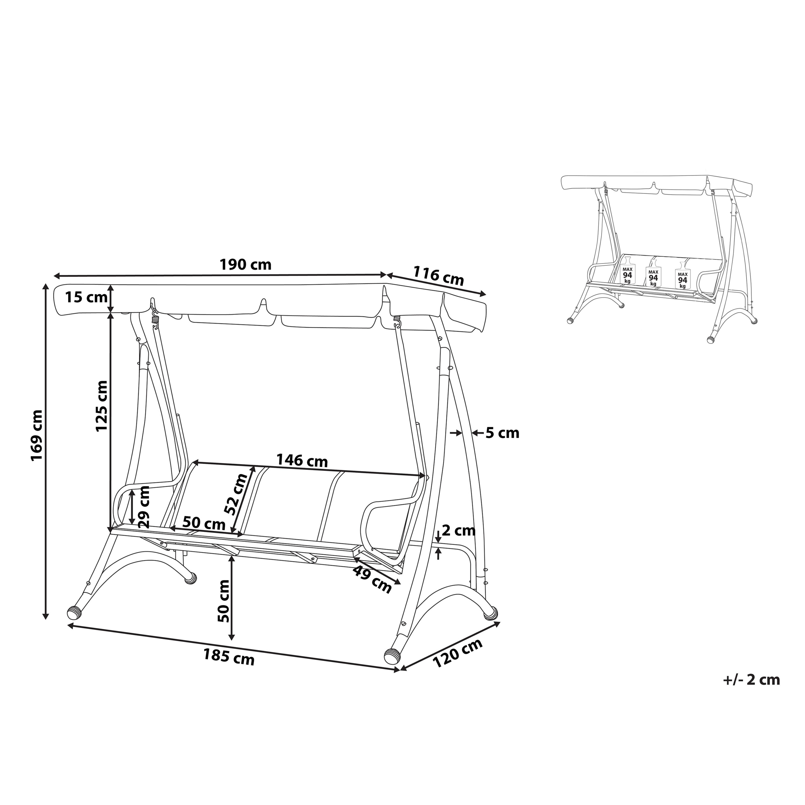 Ominaisuudet: Toimiva katos suojaa auringolta ja tuulelta, Leveä ja mukava istuin, Loistava paikka rentoutua, Modernia tyyliä terassille ja puutarhaan, Vankka ja kestävä rakenne, Säänkestävä