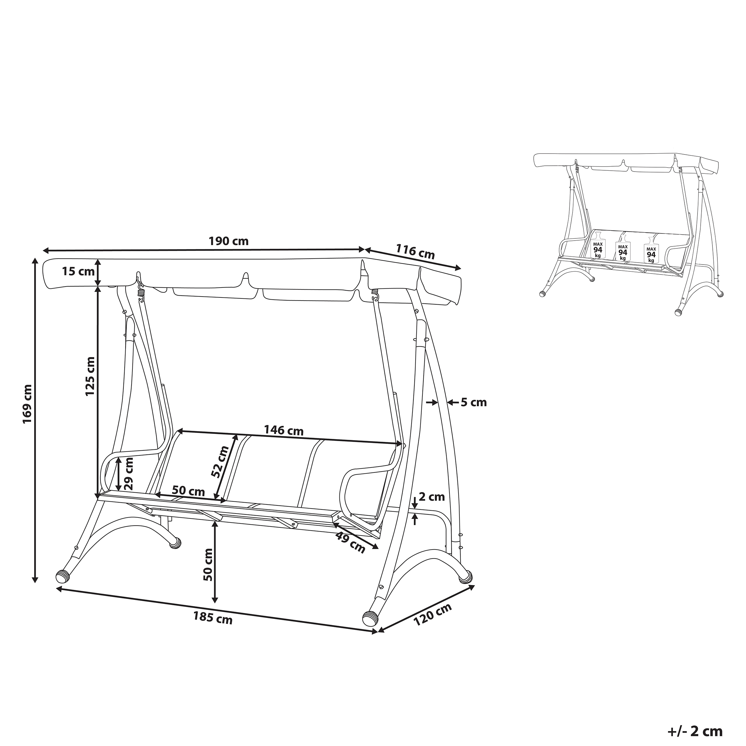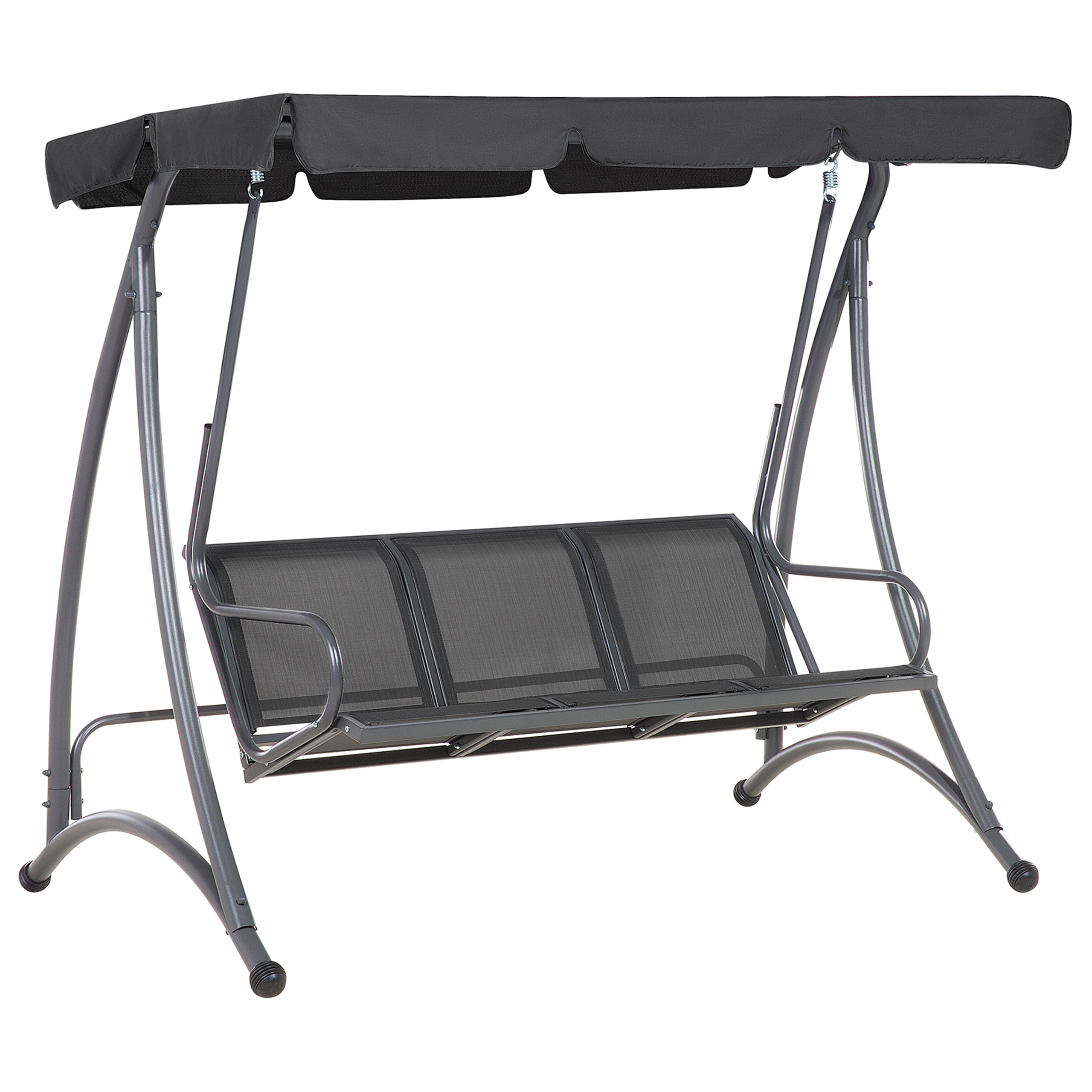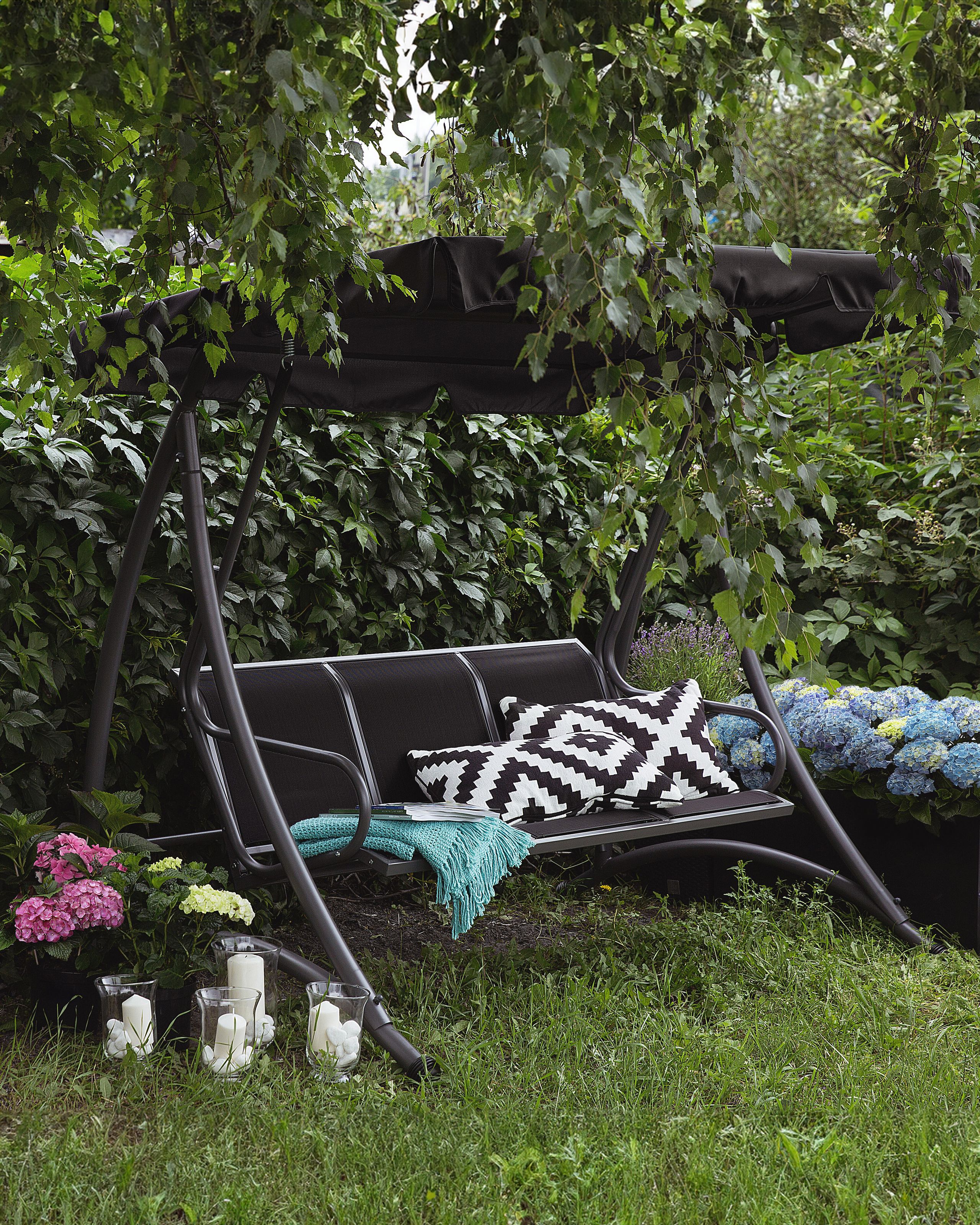 Moderni puutarhakeinu katoksella. Tyylikäs puutarhakeinu tarjoaa puutarhaan mukavan modernin paikan, jossa rentoutua ja viettää aikaa ystävien kanssa. Jauhemaalatusta teräksestä valmistettu runko on erittäin vankka ja säänkestävä. Jämäkästä verkkokankaasta valmistetut istuimet tarjoavat mukavan tuen, ja yhteensopiva polyesteristä valmistettu katos suojaa auringolta ja tuulelta. Materiaaliensa ansiosta puutarhakeinu on erittäin helppohoitoinen. Leveät istuimet tarjoavat istumatilaa jopa kolmelle hengelle.