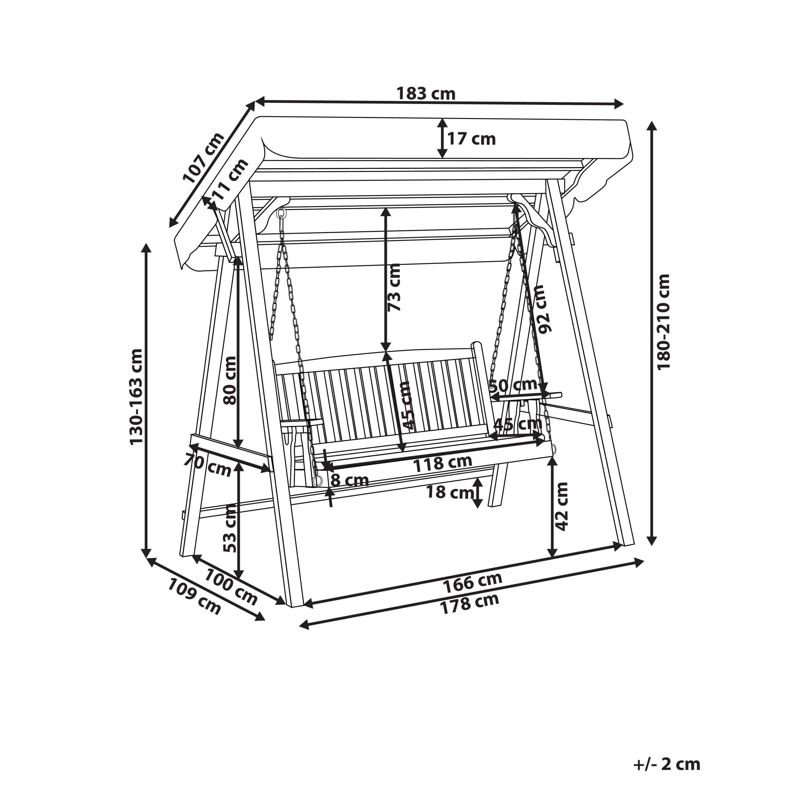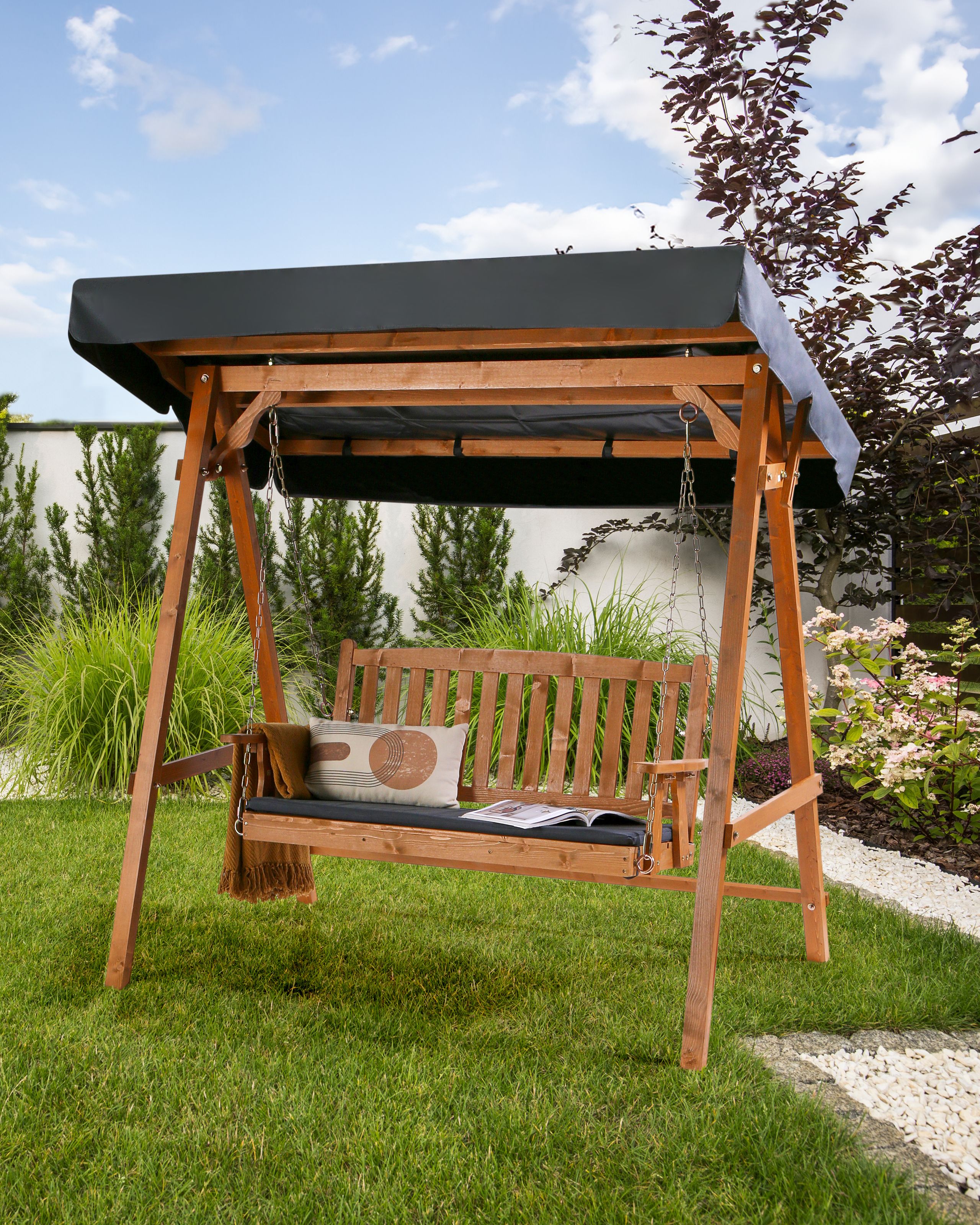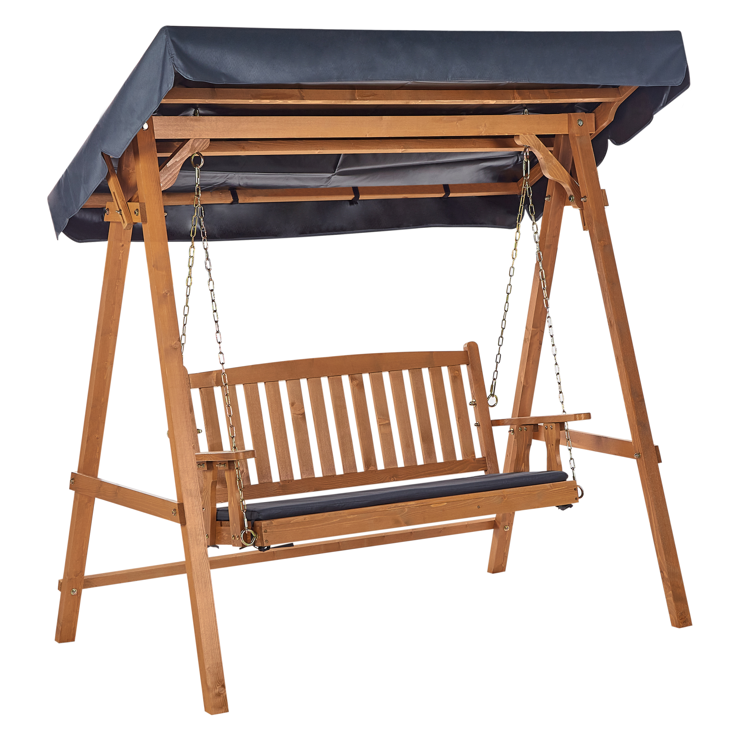 Puinen pihakeinu katoksella. Nauti ulkoilmasta mukavasti keinuen tällä kauniilla puutarhakeinulla, joka on valmistettu kuusesta sekä varustettu UV-säteilyä kestävällä ja vettä hylkivällä polyesterikatoksella. Ajaton muotoilu ja vankka rakenne tekevät siitä erinomaisen lisän mihin tahansa puutarhaan. Mukana tuleva tummanharmaa istuintyyny täydentää keinun katosta ja tarjoaa istumamukavuuden. Pihakeinu on täydellinen valinta lisäämään ripauksen tyyliä ulkotilaan, tarjoten viihtyisän rentoutumispaikan.