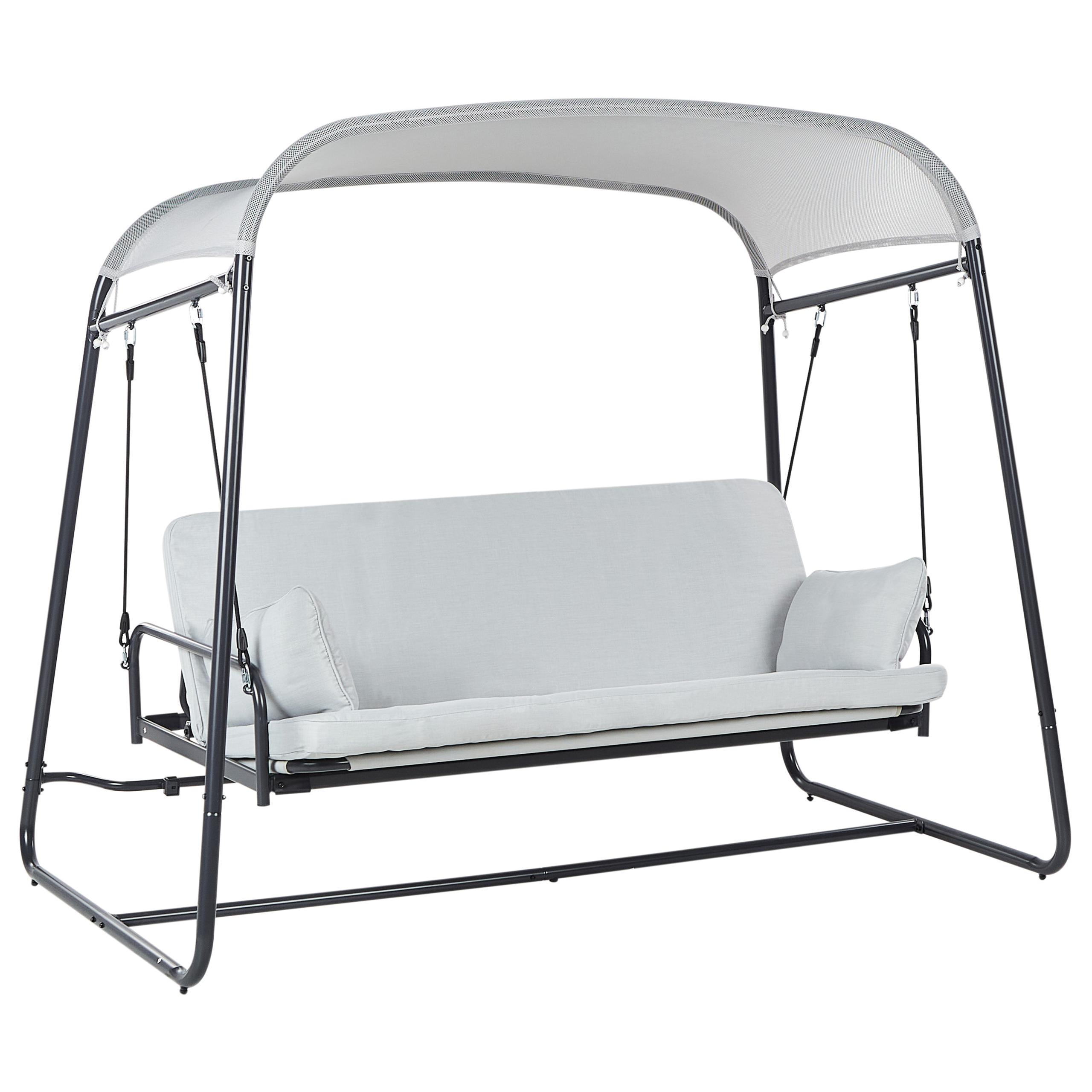 Moderni muunneltava puutarhakeinu katoksella. Luo viihtyisä ulkotyyssija tällä tyylikkäällä puutarhakeinulla, joka on suunniteltu mukavuutta ja toiminnallisuutta silmällä pitäen. Kestävästä jauhemaalatusta teräksestä valmistettu keinu on tehty kestämään vuosia. Verkkokankaasta valmistettu katos tarjoaa hieman varjoa ja täydentää keinun muotoilua, ja mukava istuinosa on helppo taittaa viihtyisäksi päivävuoteeksi. Estetyn keinuliikkeen ansiosta se tarjoaa avattuna turvallisen ja mukavan tavan rentoutua ulkona.