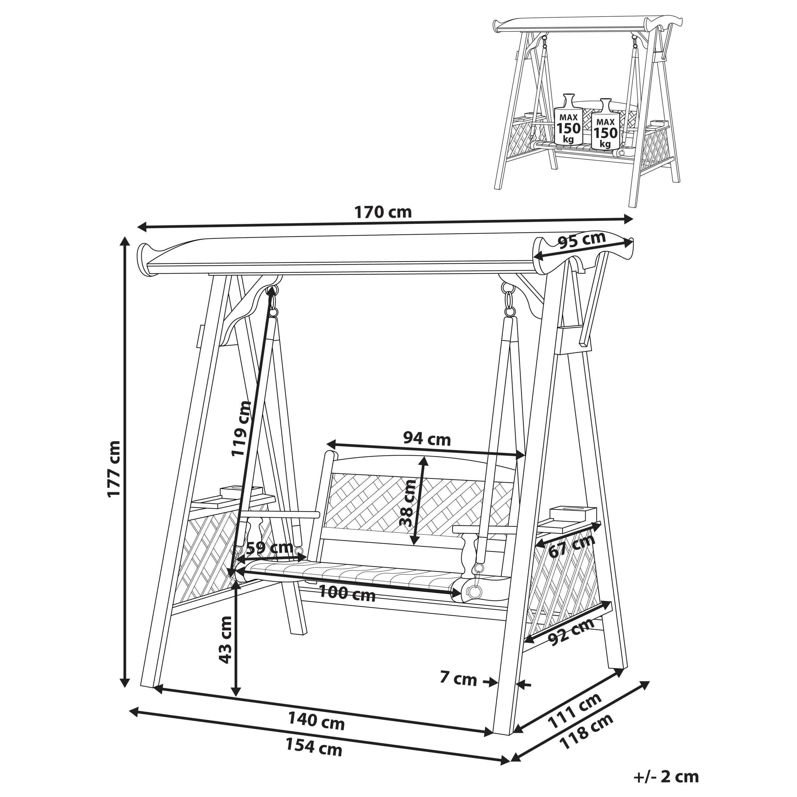 Perinteinen puutarhan puukeinu katoksella. Kohota ulkotilaasi tällä hurmaavalla puutarhakeinulla, joka on suunniteltu sekä tyylikkääksi että mukavaksi. Kestävästä tummasta kuusesta valmistettu keinu erottuu muotoilullaan, tuo luonnollista ilmettä ja takaa tukevan sekä vakaan rakenteen. Säädettävä katos tarjoaa varjoa ja suojaa auringolta, tehden pihakeinusta täydellisen paikan rentoutua ja nauttia raittiista ilmasta säällä kuin säällä. Lisäksi molemmille puolille sijoitetut tarjottimet tarjoavat kätevän paikan välipaloille ja juomille.