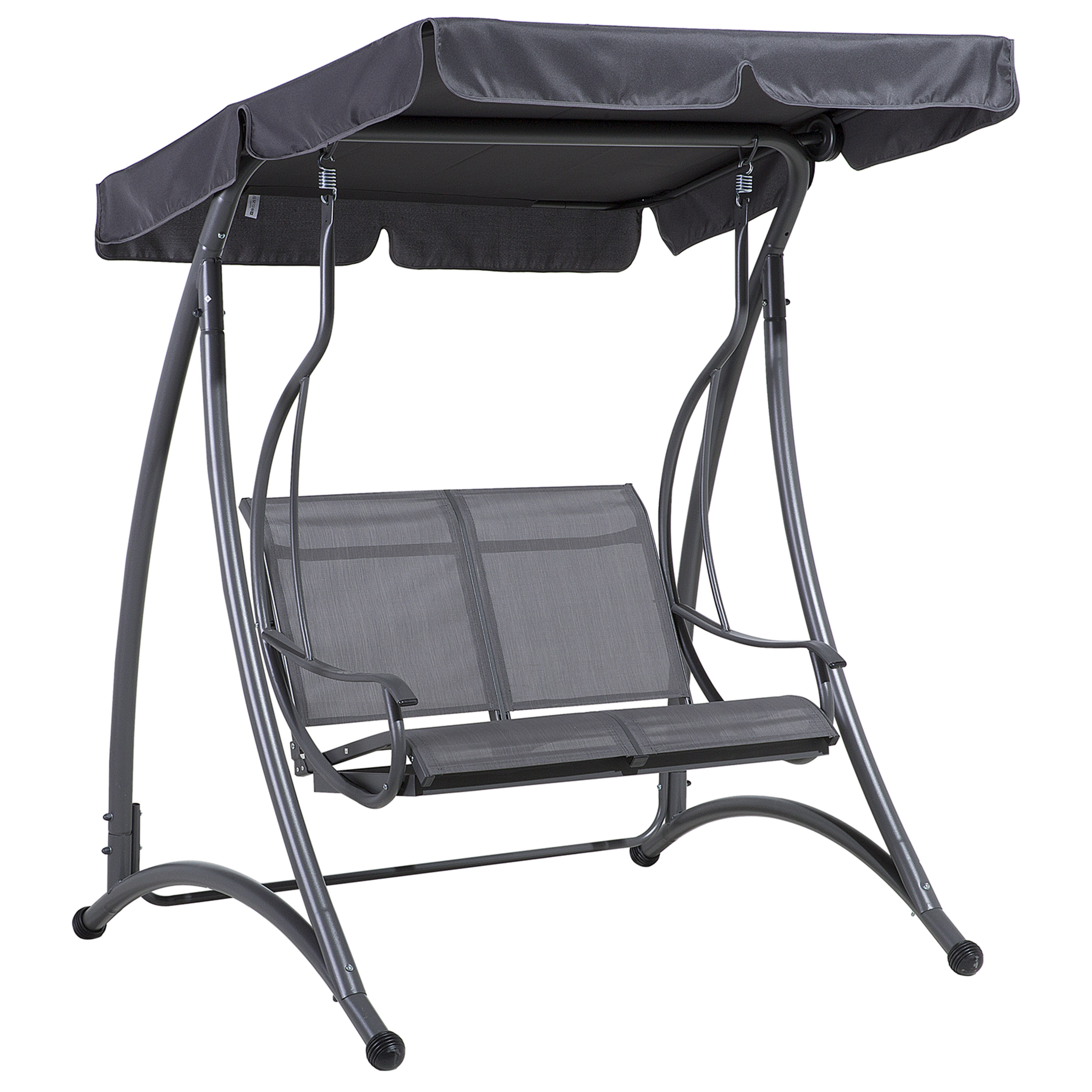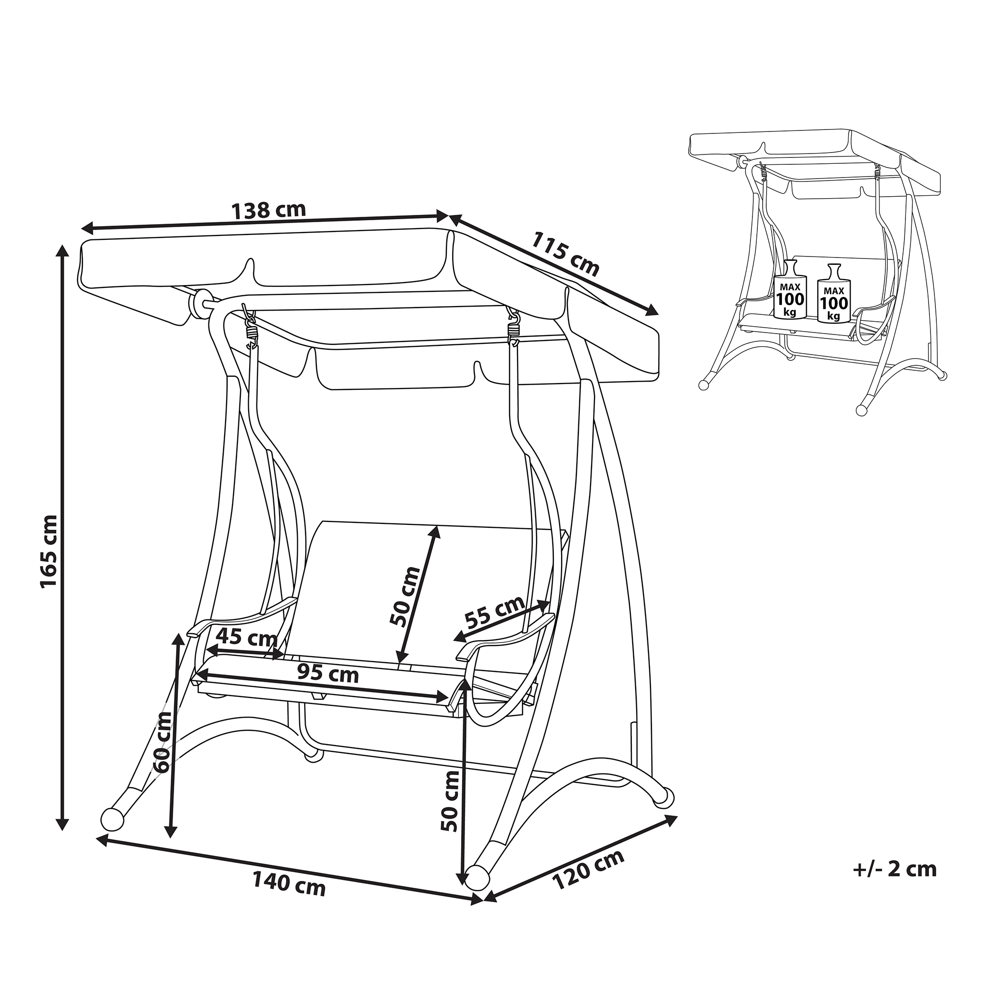 Tyylikäs puutarhakeinu katoksella. Tämä nykyaikainen puutarhakeinu sopii täydellisesti mihin tahansa moderniin puutarhaan tai terassille. Sen tukeva runko on valmistettu jauhemaalatusta teräksestä ja istuinosa helppohoitoisesta ja säänkestävästä synteettisestä kankaasta. Käytännöllinen säädettävä katos on irrotettavissa ja pesunkestävä, tarjoten mukavan suojan auringolta ja tuulelta. Puutarhakeinu tarjoaa mukavasti istumatilaa jopa kahdelle hengelle. Pihakeinun pyöristetyt muodot ja neutraalit värit sulautuvat moniin erityylisiin ulkosisustuksiin.
