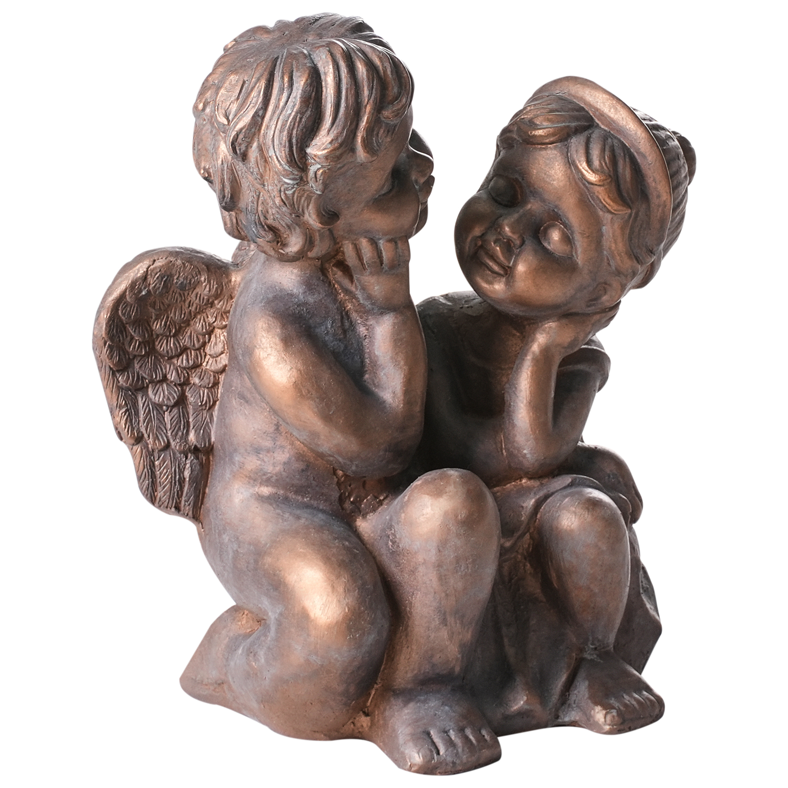 Poikaenkeliä ja tyttöä esittävä ulkokoriste. Tämä viehättävä, poikaenkeliä ja tyttöä esittävä puutarhakoriste on täydellinen lisä jokaiseen sisä- ja ulkotilaan. Kestävistä materiaaleista käsin valmistettu koriste on viimeistelty patinoituneen näköiseksi ja sen hienovarainen kiilto lisää luonnetta mihin tahansa ympäristöön. Se tuo sisustukseen leikkisää mutta eleganttia viehätystä ja näyttää erittäin kauniilta kivien ja kasvien vieressä.