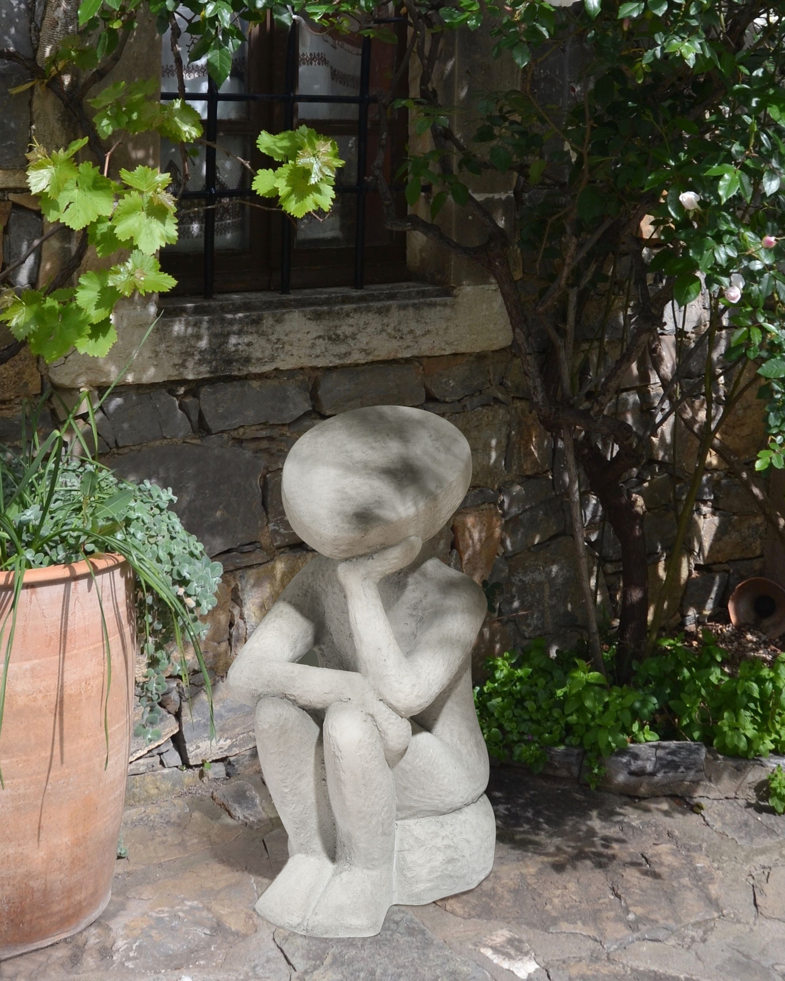 Minimalistinen koriste sisä- ja ulkokäyttöön. Lisää puutarhaan seesteinen ja taiteellinen aksentti tällä puutarhakoristeella, joka tuo tilaan ripauksen viehätystä. Hahmon mietiskelevä asento luo rauhallisen tunnelman, mikä tekee siitä ihanteellisen lisän erilaisten ulkotilojen sisustukseen. Se korostaa puutarhan luonnetta vaivattomasti, olipa se sitten kukkien keskellä tai sisäänkäynnin vierellä.