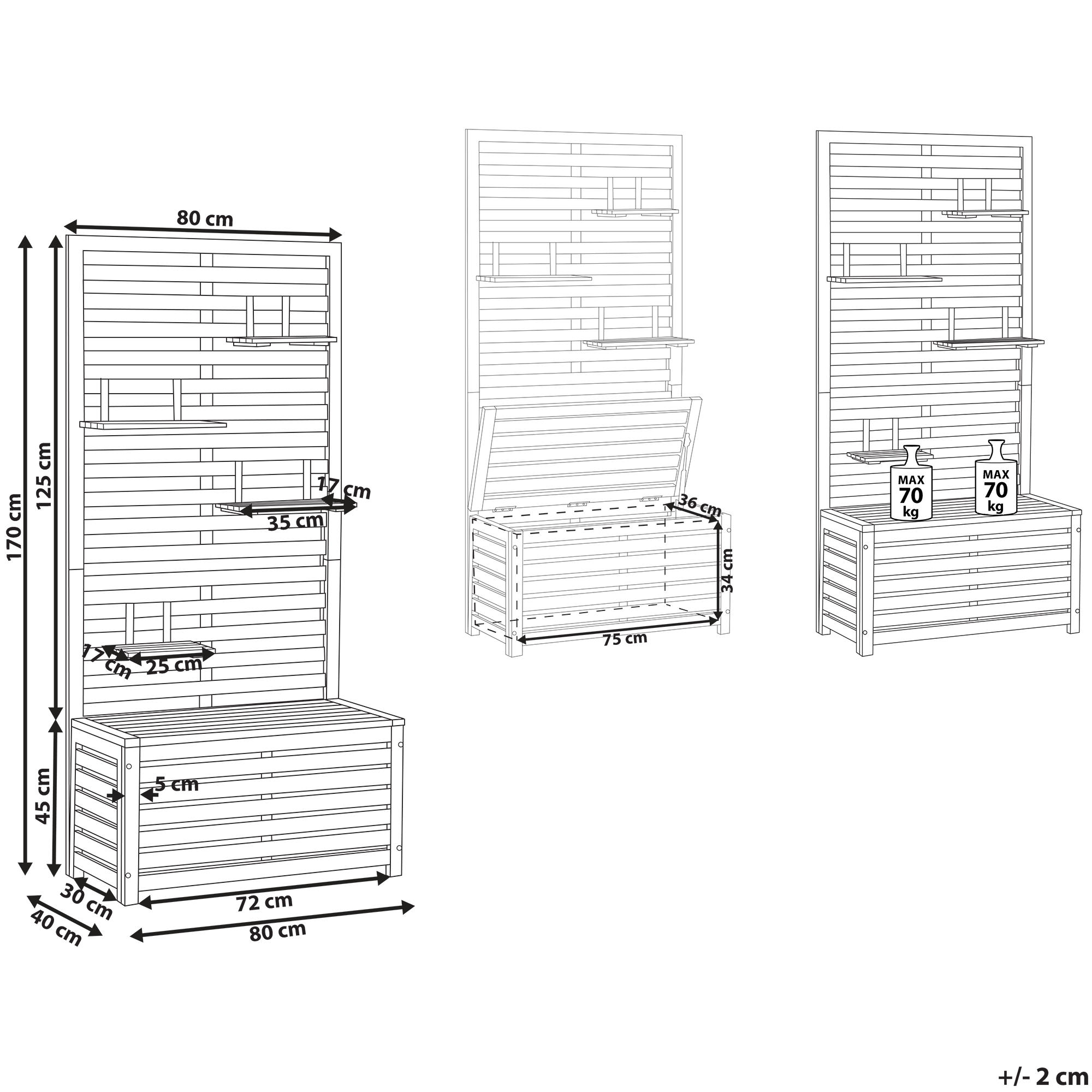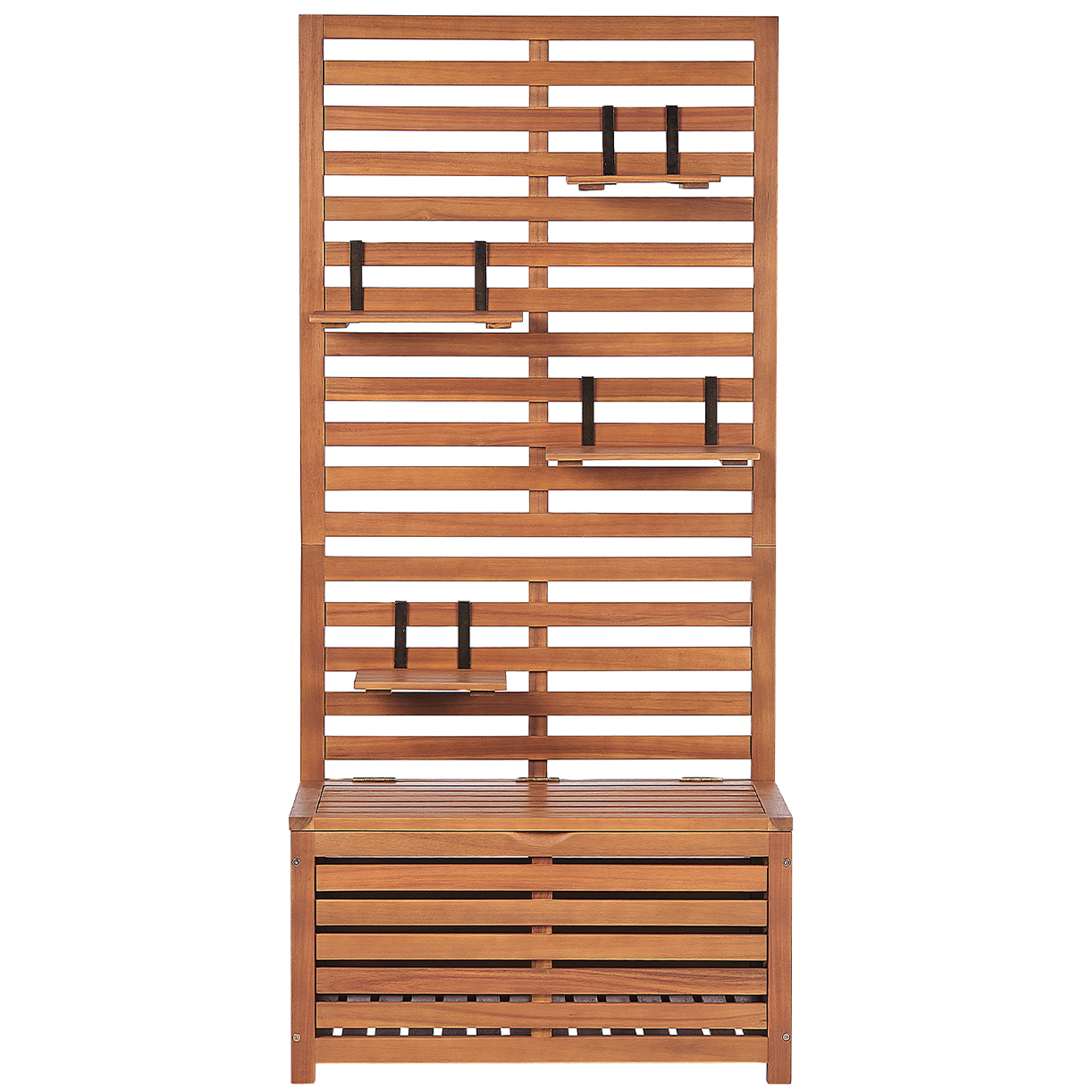 Penkki säilytystilalla ja hyllyillä ulkokäyttöön. Tämä penkin, säilytyslaatikon ja hyllyillä varustetun seinän yhdistelmä on täydellinen ratkaisu pienempiin ulkotiloihin, kuten parvekkeelle. Akaasiasta valmistettu kaluste on kestävä sekä pitkäikäinen, ja puun lämmin väri takaa viihtyisän, rustiikkisen ilmeen. Siirrettävät hyllyt tarjoavat tilaa erilaisille kasveille, yrteille tai puutarhakoristeille, kun taas istuimen alle kätkeytyvä säilytyslaatikko mahdollistaa puutarhatarvikkeiden tai erilaisten tekstiilien säilytyksen. Koristele kaluste iltojen pimetessä esimerkiksi ulkovaloilla luodaksesi parvekkeellesi kotoisan tunnelman.