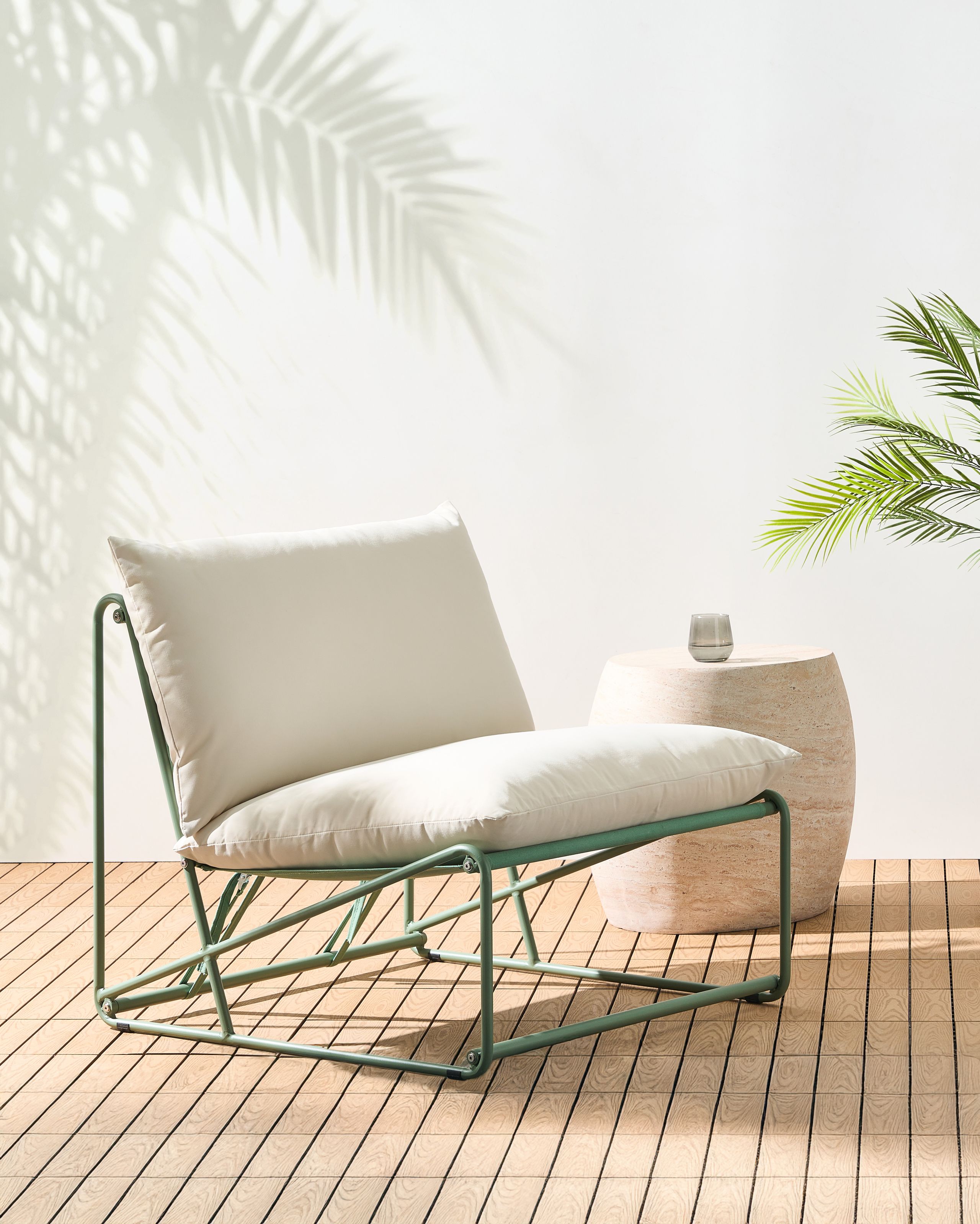 Kalteva käsinojaton tuoli tyynyillä. Tämä ylimitoitettu puutarhatuoli on suunniteltu tuomaan tilaan mukavuutta ja tyyliä. Puhdas, geometrinen teräsrunko ja muhkeat tyynyt luovat modernin mutta kutsuvan tunnelman, minkä ansiosta tuoli sopii täydellisesti rentoutumiseen niin sisällä kuin ulkona. Tyynyjen vettä hylkivät ja pestävät irrotettavat päälliset varmistavat pitkäikäisen kestävyyden ja helppohoitoisuuden myös muuttuvissa sääolosuhteissa. Yhdistä tuoli malliston suuremman sohvan kanssa yhtenäisen ja elegantin oleskelualueen luomiseksi.