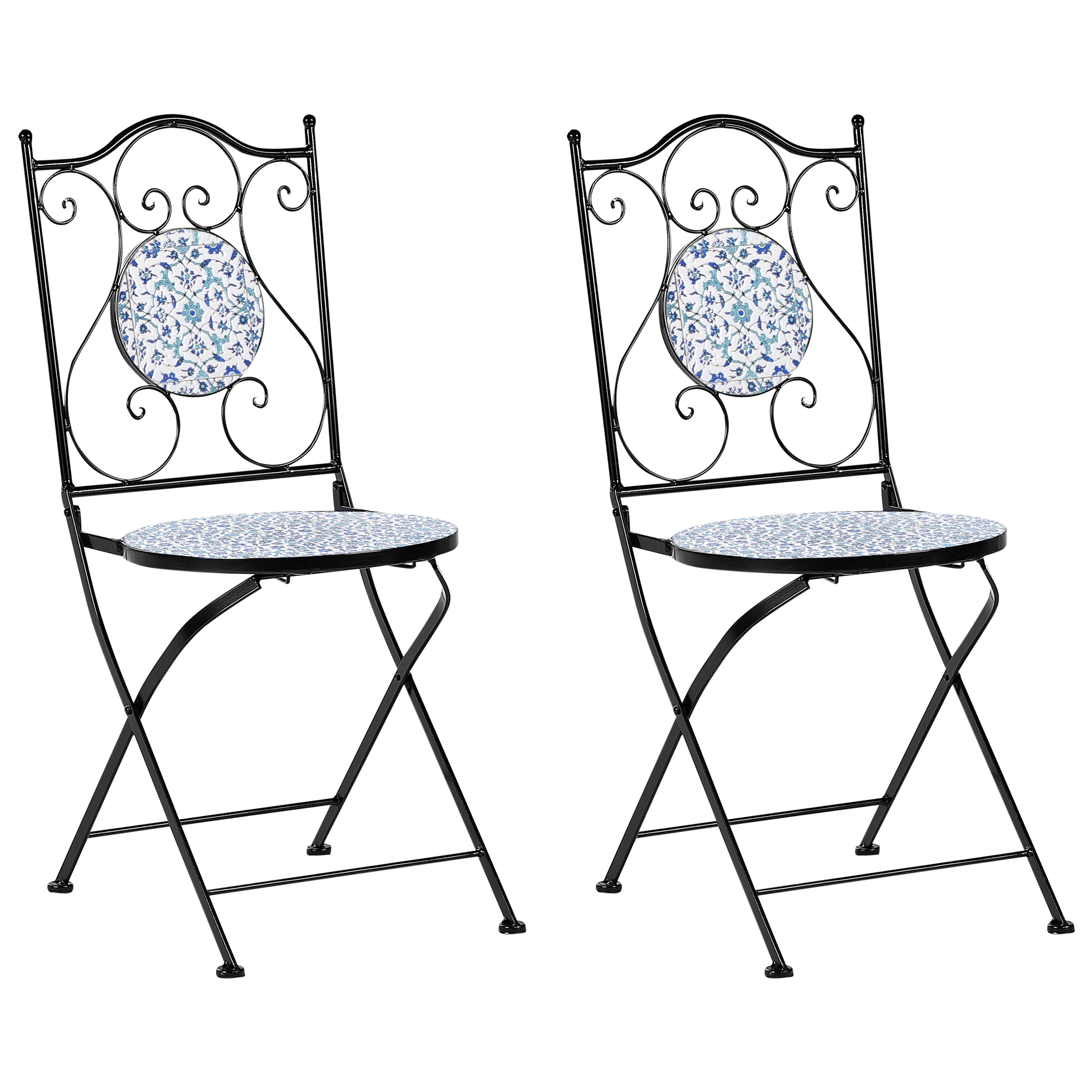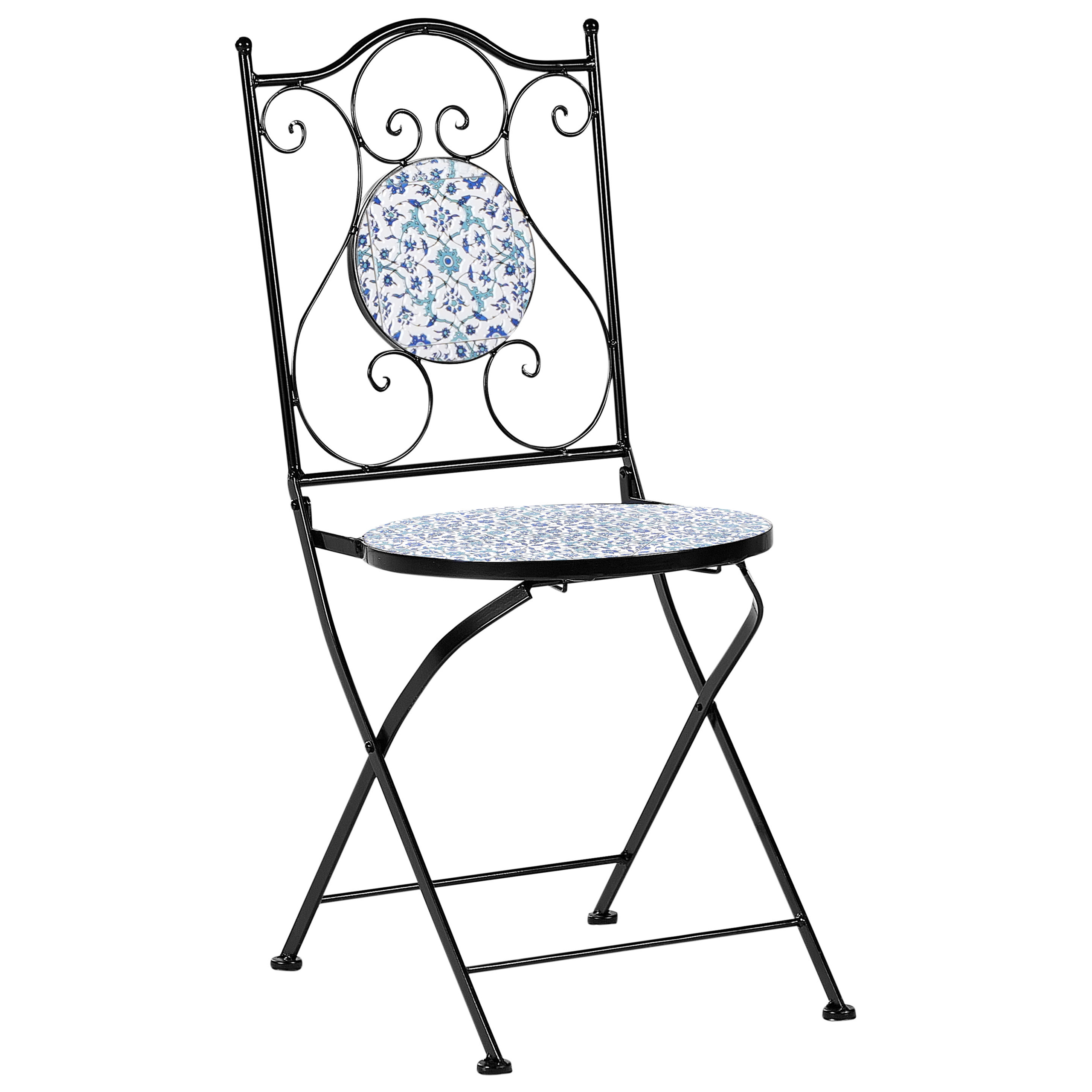 Välimerellinen puutarhatuolisetti mosaiikkikuviolla. Tuo ulkotilaasi ajatonta eleganssia tällä hurmaavalla kahden kokoontaitettavan puutarhatuolin setillä, joka yhdistää klassisen tyylin ja jokapäiväisen toiminnallisuuden. Tuoleissa on herkät sinivalkoiset keraamiset mosaiikkipinnat sekä sirot mustat rautarungot, joissa on e-pinnoite – sähkökemiallinen pintakäsittely, joka suojaa ruosteelta ja korroosiolta. Tämän ansiosta tuolit on suunniteltu kestämään sääolosuhteita ja ovat helppohoitoisia. Ne sopivat täydellisesti parvekkeille, terasseille ja pieniin puutarhoihin, tarjoten mukavan paikan ulkona rentoutumiseen ja luonnosta nauttimiseen.