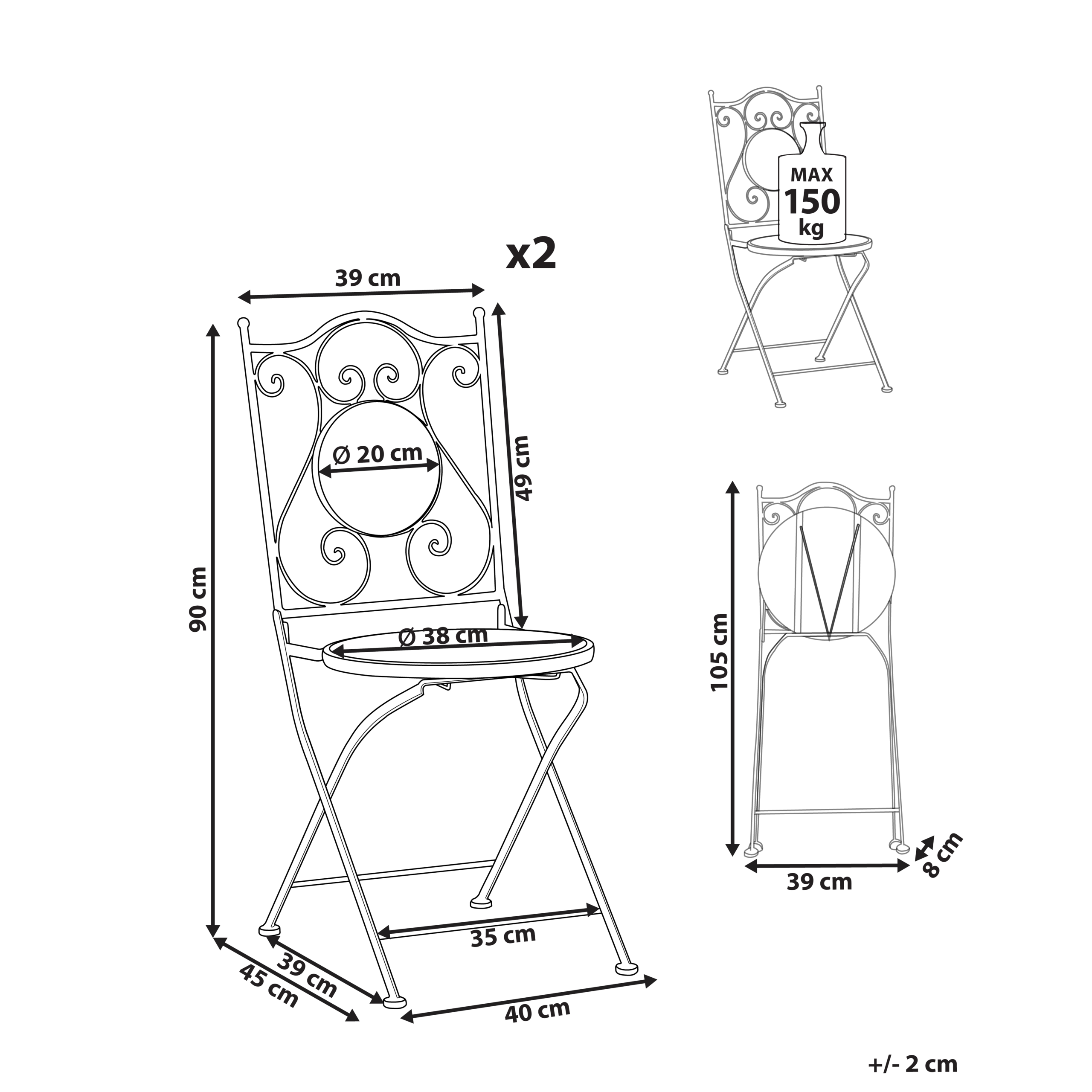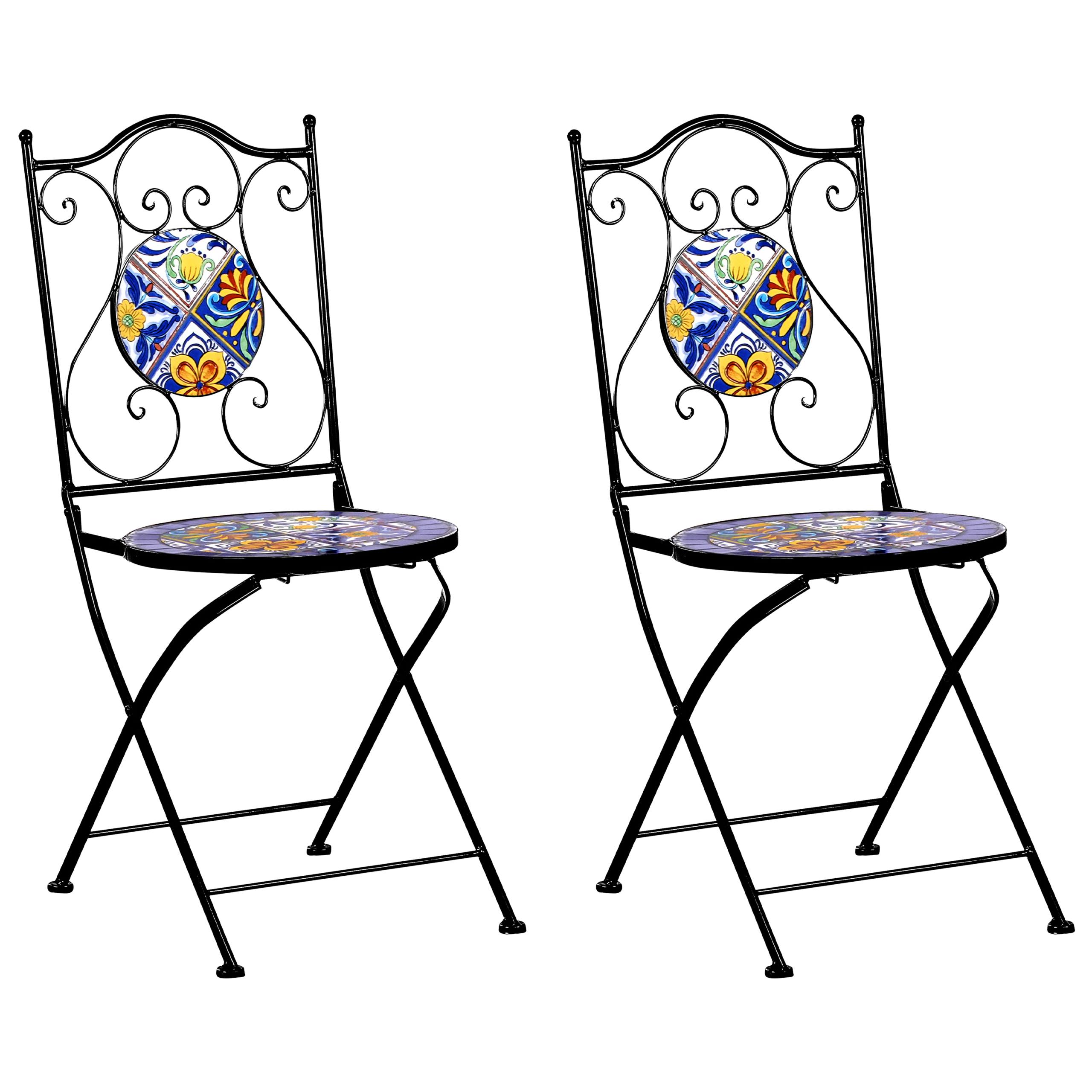 Vintage-tyylinen puutarhatuolisetti mosaiikkikuviolla. Lisää puutarhaasi, parvekkeellesi tai terassillesi väriä ja eleganssia tällä näyttävällä kahden kokoontaitettavan puutarhatuolin setillä. Tukevasta raudasta valmistetuissa rungoissa on e-pinnoite – sähkökemiallinen pintakäsittely, joka suojaa ruosteelta ja korroosiolta. Tämän ansiosta ne kestävät vaihtelevia sääolosuhteita ja säilyttävät viehättävän ulkonäkönsä ajan myötä. Eloisalla mosaiikkikuviolla koristellut keraamiset selkänojat ja istuimet tuovat koristeellista tunnelmaa. Kestävät ja vähän huoltoa vaativat tuolit ovat tyylikkäät ja käytännölliset jokaiseen ulkotilaan, tarjoten täydellisen paikan aamuauringon tai auringonlaskun nauttimiseen.
