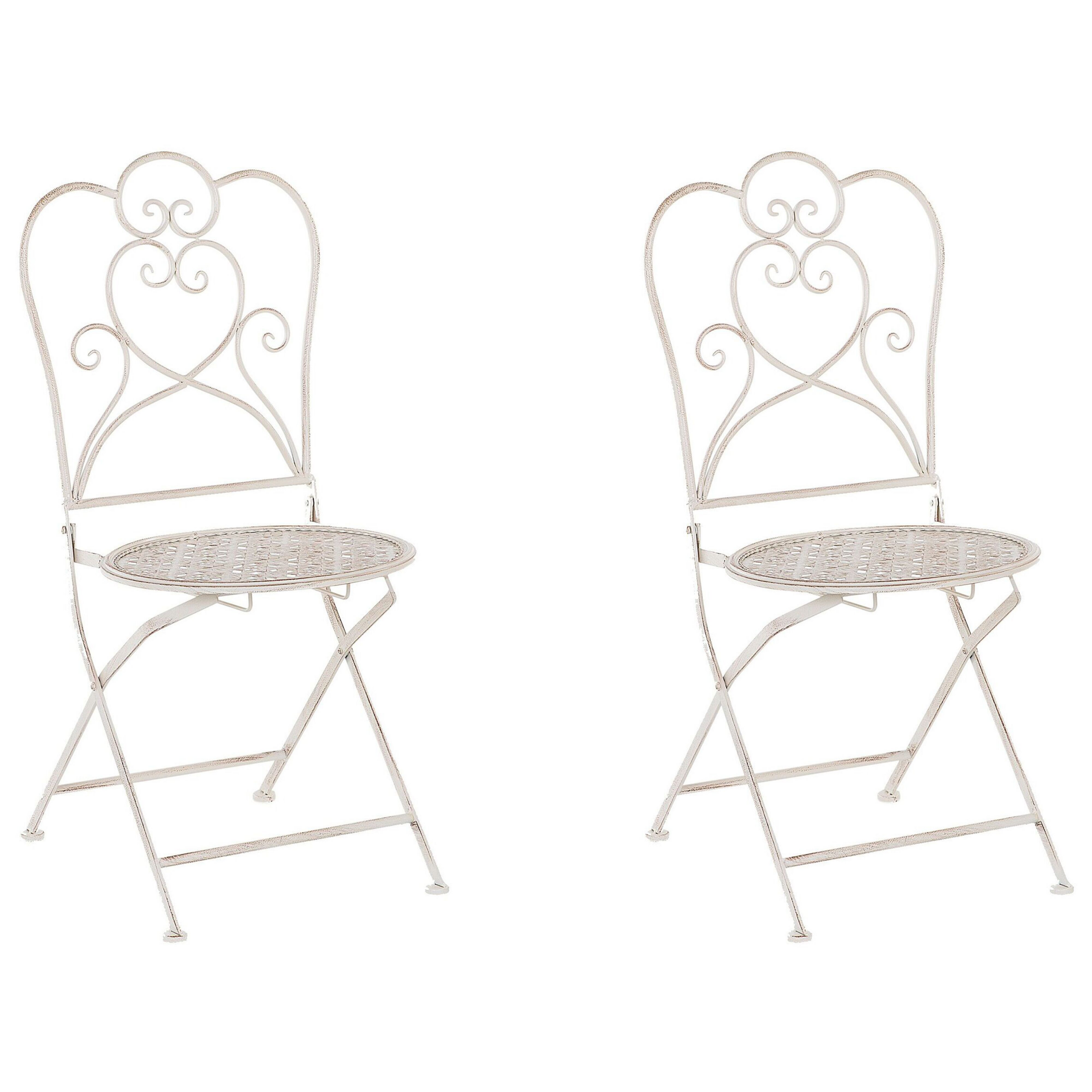 Kahden tuolin setti. Nauti auringosta ja raikkaista juomista näillä tyylikkäillä puutarhatuoleilla istuskellen. Vankka runko on valmistettu jauhemaalatusta raudasta, joka takaa kestävyyden ja pitkäikäisyyden. Romanttisen ranskalaistyylin inspiroima muotoilu ja kauniit filigraanikuviot antavat tuoleille ylellisen ilmeen, joka sopii moniin erilaisiin ulkosisustuksiin. Neutraalin värinsä ja kuluneen viimeistelynsä ansiosta tuolit on helppo yhdistää monien eriväristen tekstiilien kanssa. Tuolit ovat kokoontaitettavissa, joten ne on helppo varastoida käyttökauden loputtua.