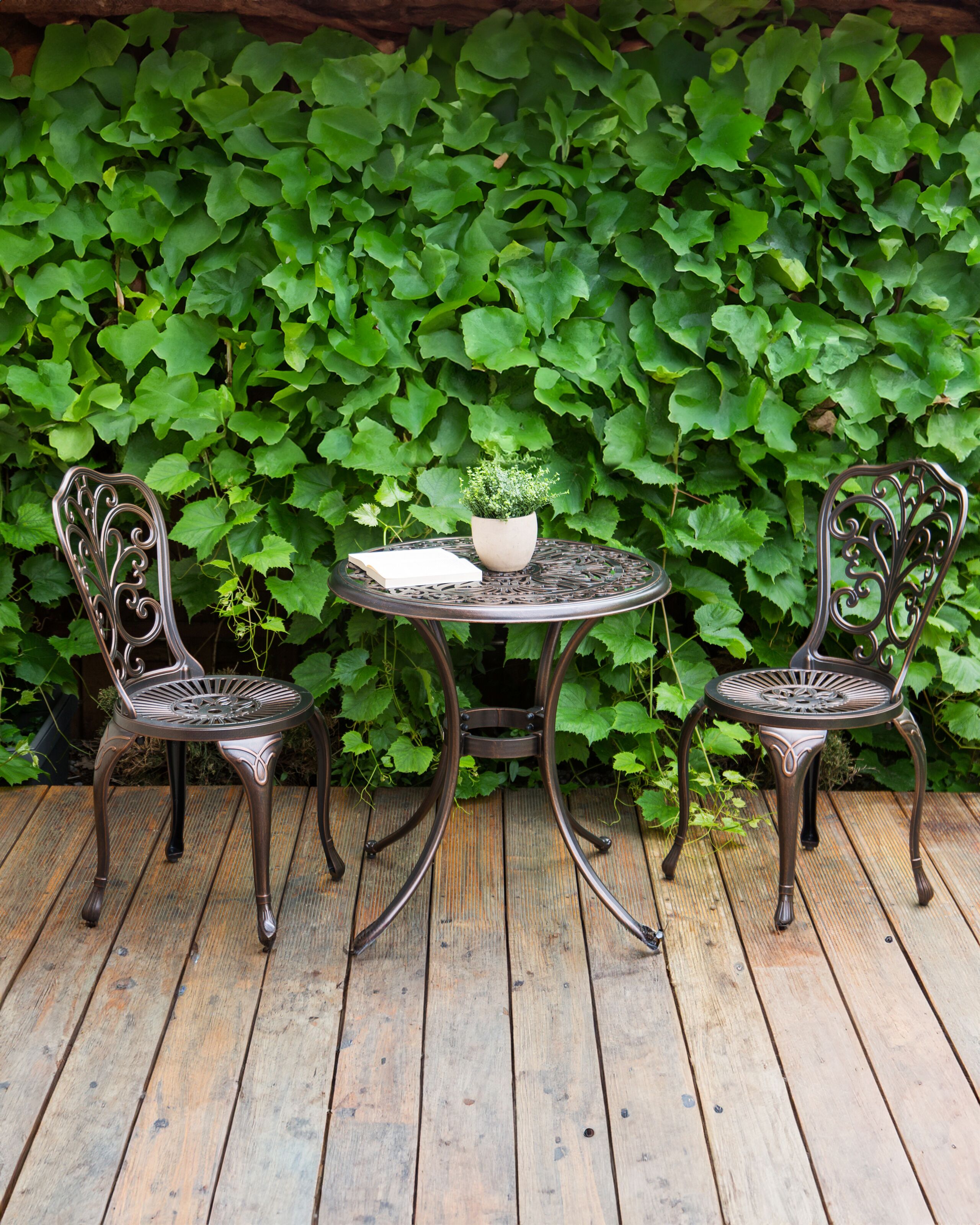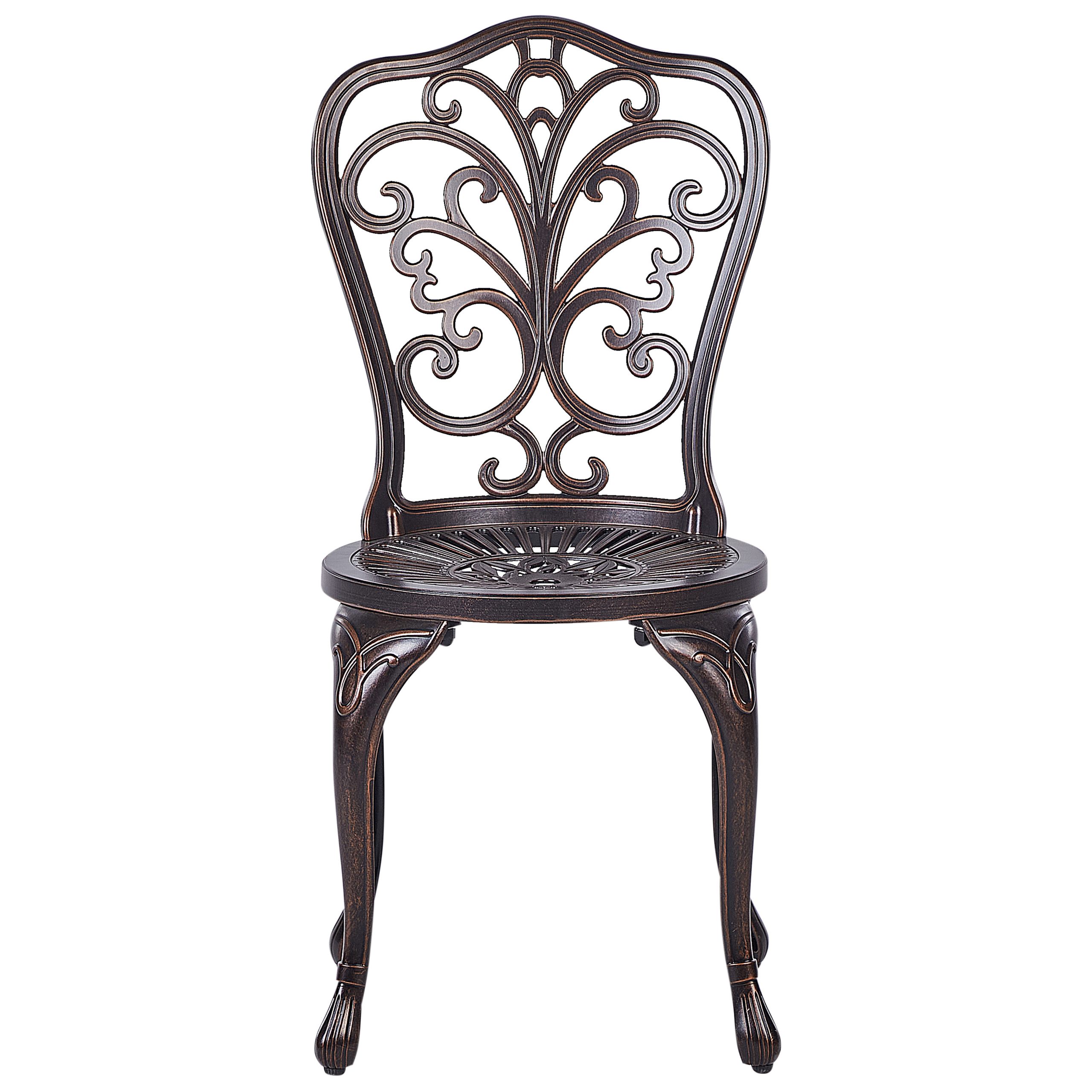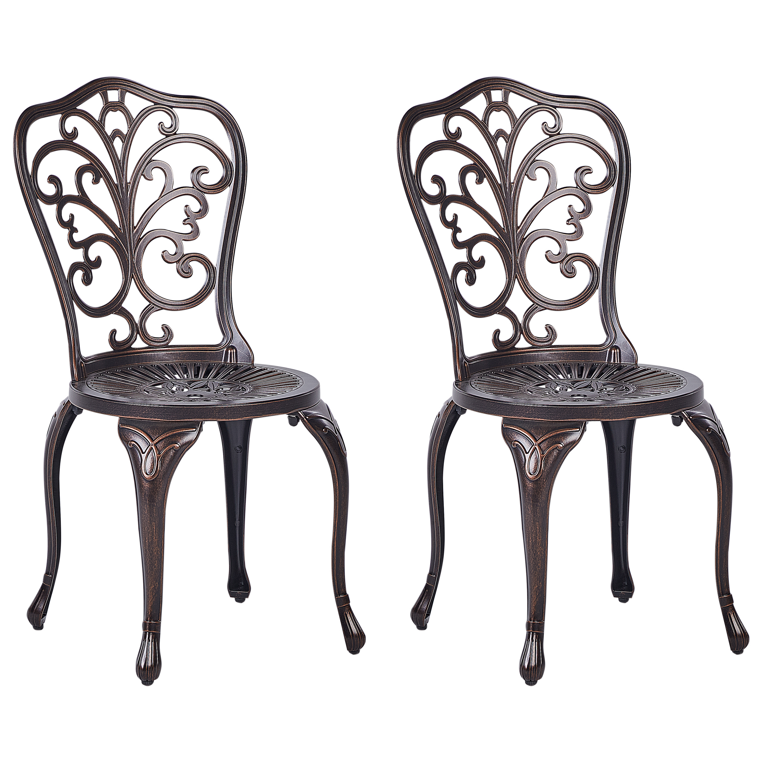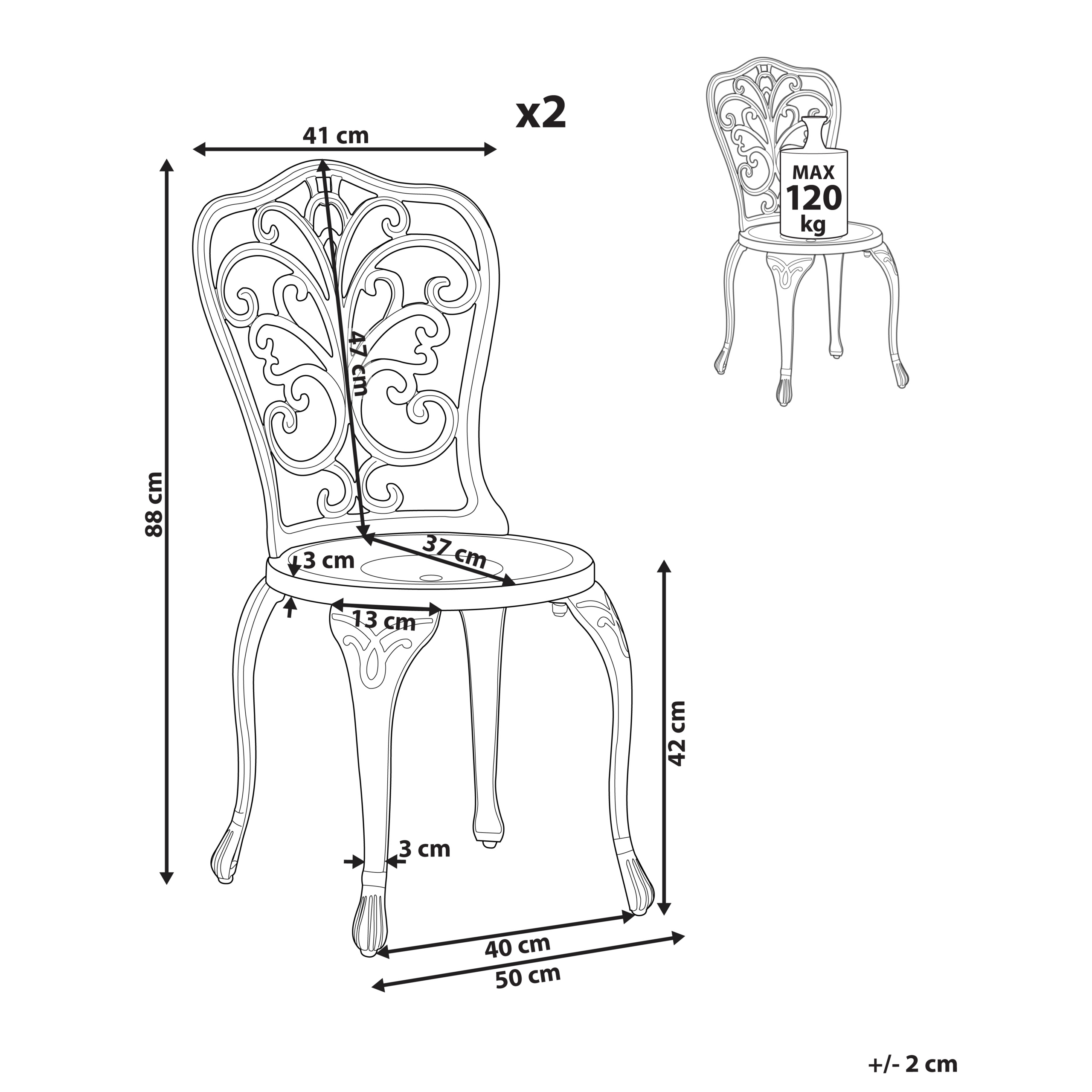 Vintage-tyylinen puutarhatuolisetti. Tyylikäs kahden puutarhatuolin setti sopii täydellisesti niin puutarhaan, terassille kuin parvekkeellekin. Tuolit on valmistettu kevyestä mutta kestävästä alumiinista, ja niiden jauhemaalattu viimeistely takaa pitkäikäisen laadun. Selkänojien kauniit kuvioinnit antavat tuoleille vintage-henkisen ilmeen, joka täydentää pyöreitä istuimia ja hennosti kaartuvia jalkoja. Yhdistä nämä upeat ulkotuolit yhteensopivan pöydän kanssa luodaksesi hurmaavan vintage-tyylisen ulkotilan.