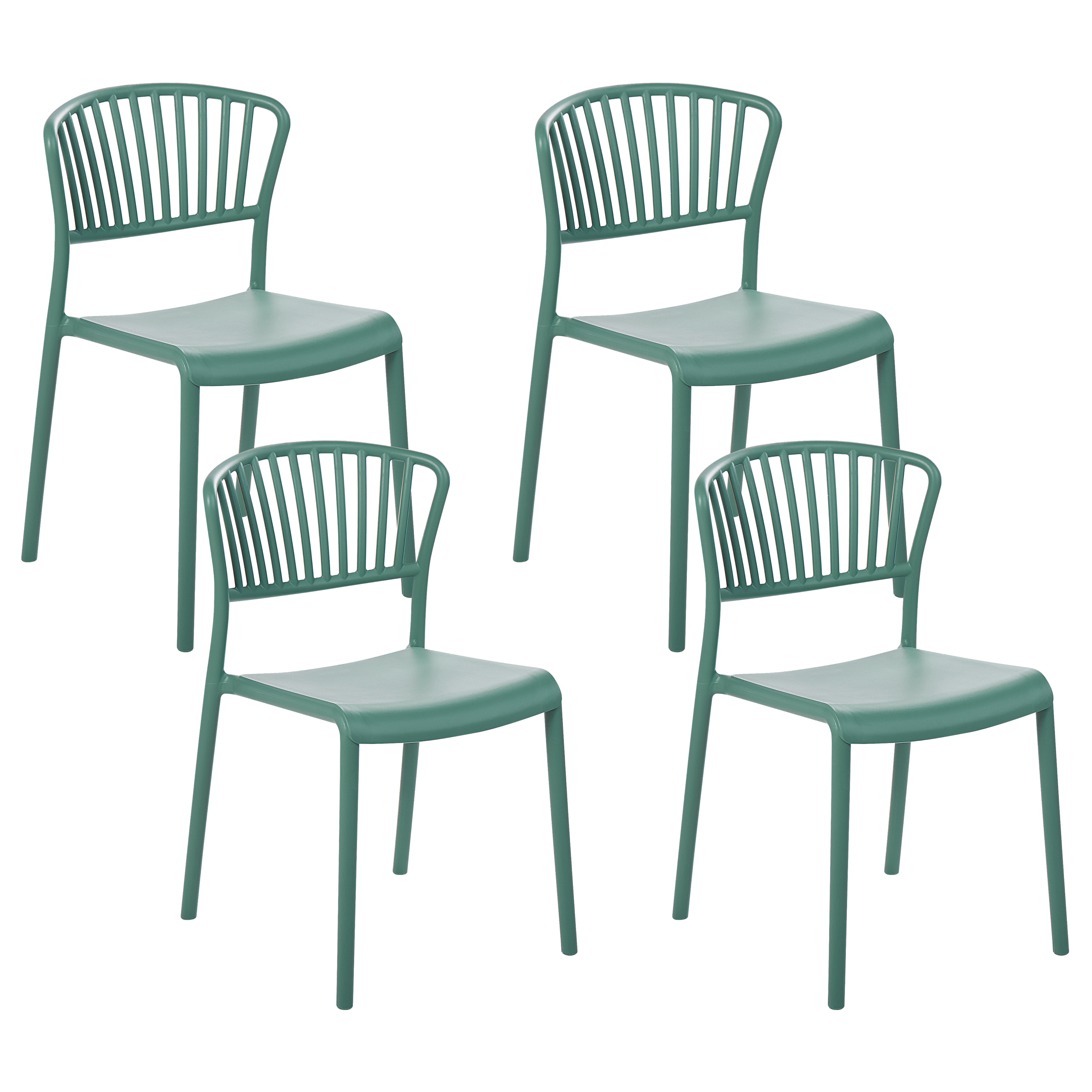 Pinottava muovituolisetti sisä- ja ulkokäyttöön. Koristeellisen ja käytännöllisen muotoilunsa ansiosta tämä neljän tuolin ryhmä sopii täydellisesti moniin erilaisiin sisätiloihin sekä terassille tai parvekkeelle. Tuolit on valmistettu muovista, joten kesäsateet eivät vahingoita niitä. Pinottavan ominaisuutensa ansiosta tuoleja on helppo säilyttää silloin, kun ne eivät ole käytössä. Hieman kaarevat, avonaiset selkänojat ja mintunvihreä väri antavat niille retrovaikutelman. Nämä tuolit sopivat kauniisti kaikkialle, aina ruokailutilasta keittiöön tai puutarhaan, ja ne tuovat tilaan ripauksen väriä.