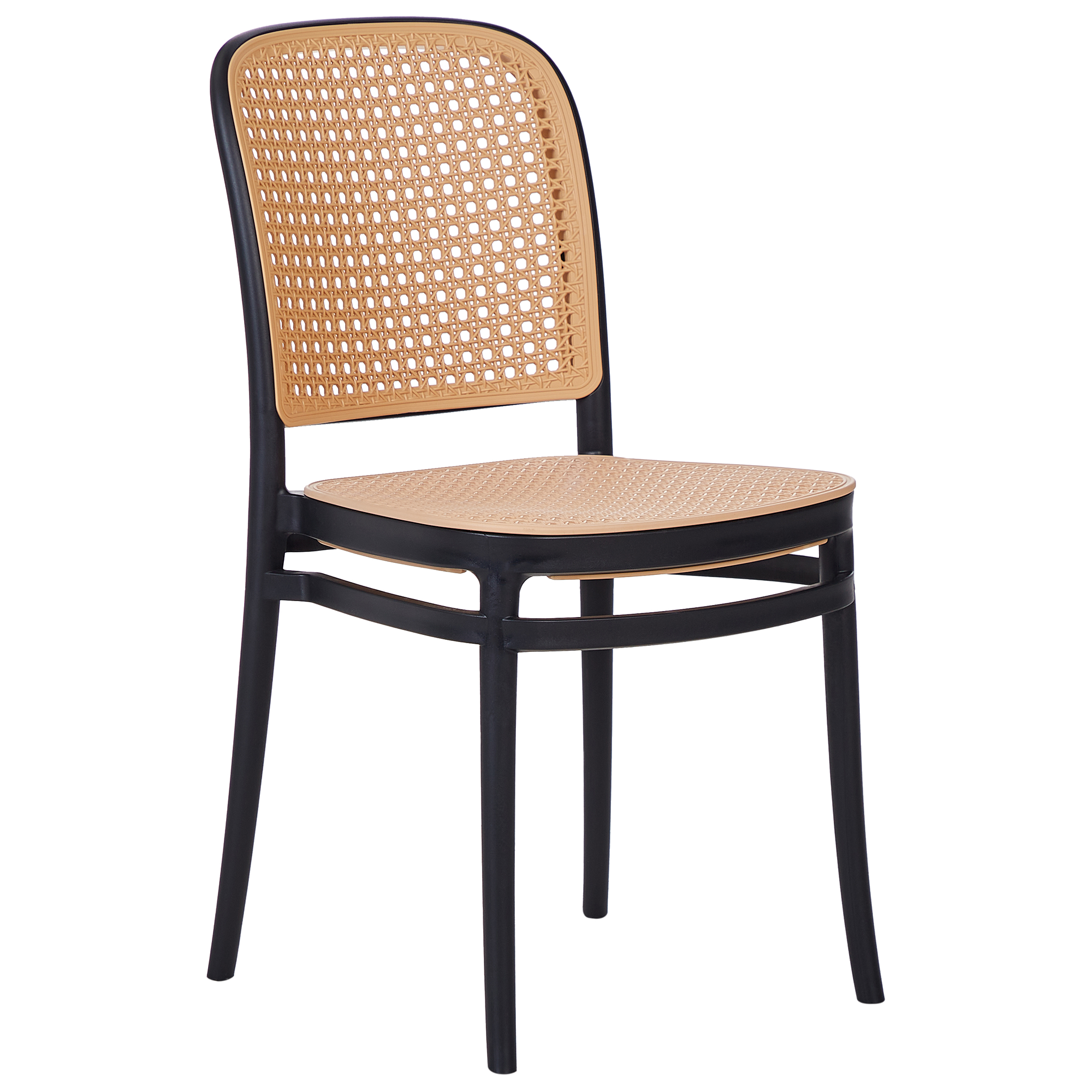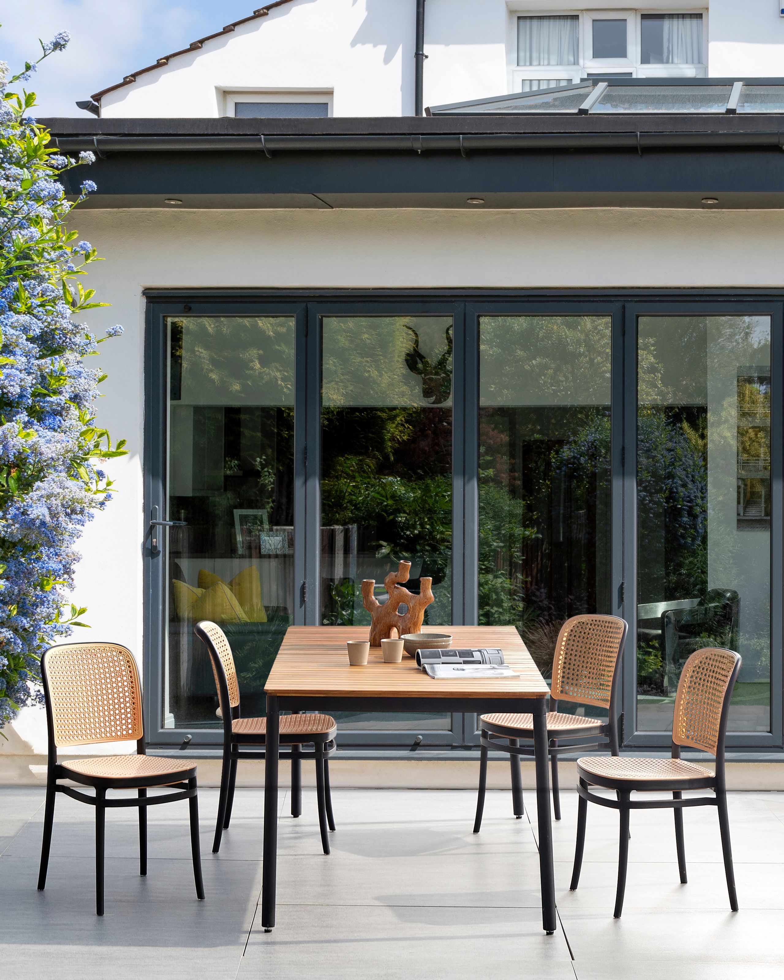 Moderni pinottava tuolisetti. Tämä elegantti neljän ruokatuolin setti yhdistää tyylin ja käytännöllisyyden täydellisesti. Tuolit on suunniteltu sekä sisä- että ulkokäyttöön, eivätkä ne haalistu auringossa UV-kestävyytensä ansiosta. Ne on valmistettu kestävästä synteettisestä materiaalista, mikä takaa säänkestävyyden tyylikästä ulkonäköä menettämättä. Selkänojia koristaa wieniläispunosta jäljittelevä kuvio, joka antaa tuoleille klassisen ilmeen, ja minimalistinen runko tuo kokonaisuuteen modernia tyyliä. Lisäksi tuolit ovat pinottavia, mikä tekee säilyttämisestä ja tilan maksimoimisesta helppoa. Setti on ajaton valinta, joka päivittää mitä tahansa puutarhaa tai ruokailutilaa kauniilla muotoilullaan.