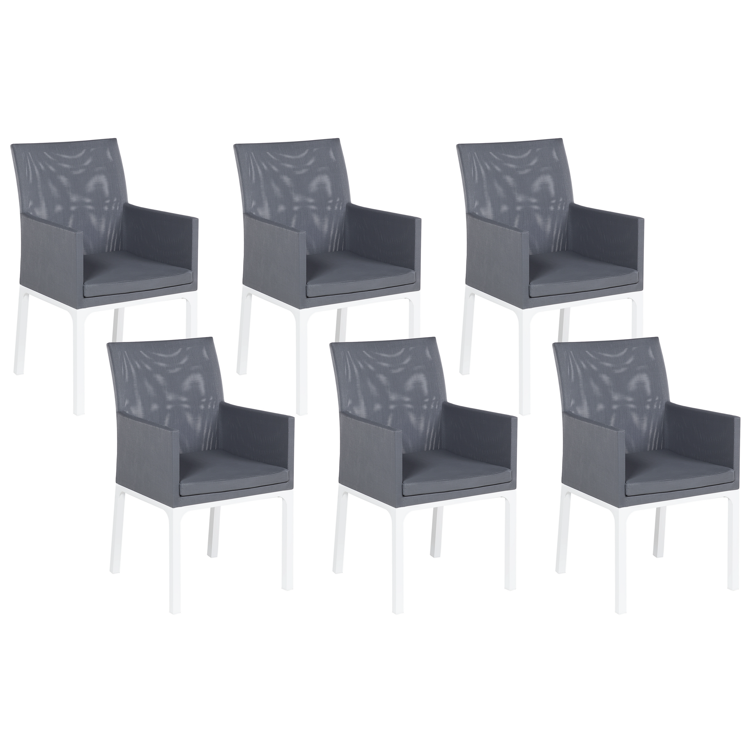 6 kangasverhoiltua pihatuolia. Tämä klassisesti muotoiltu, neutraalin värinen kuuden puutarhatuolin setti sulautuu loistavasti moniin erilaisiin ulkosisustuksiin. Tuolien käsinojat ja korkea selkänoja takaavat mukavuuden ja oikeanlaisen tuen. Valkoisesta jauhemaalatusta alumiinista valmistettu runko on verhoiltu pitkäikäisellä, UV-säteilyn kestävällä tummanharmaalla polyesterillä. Mukana tulevat paksut istuintyynyt on varustettu vedenkestävällä päällisellä.