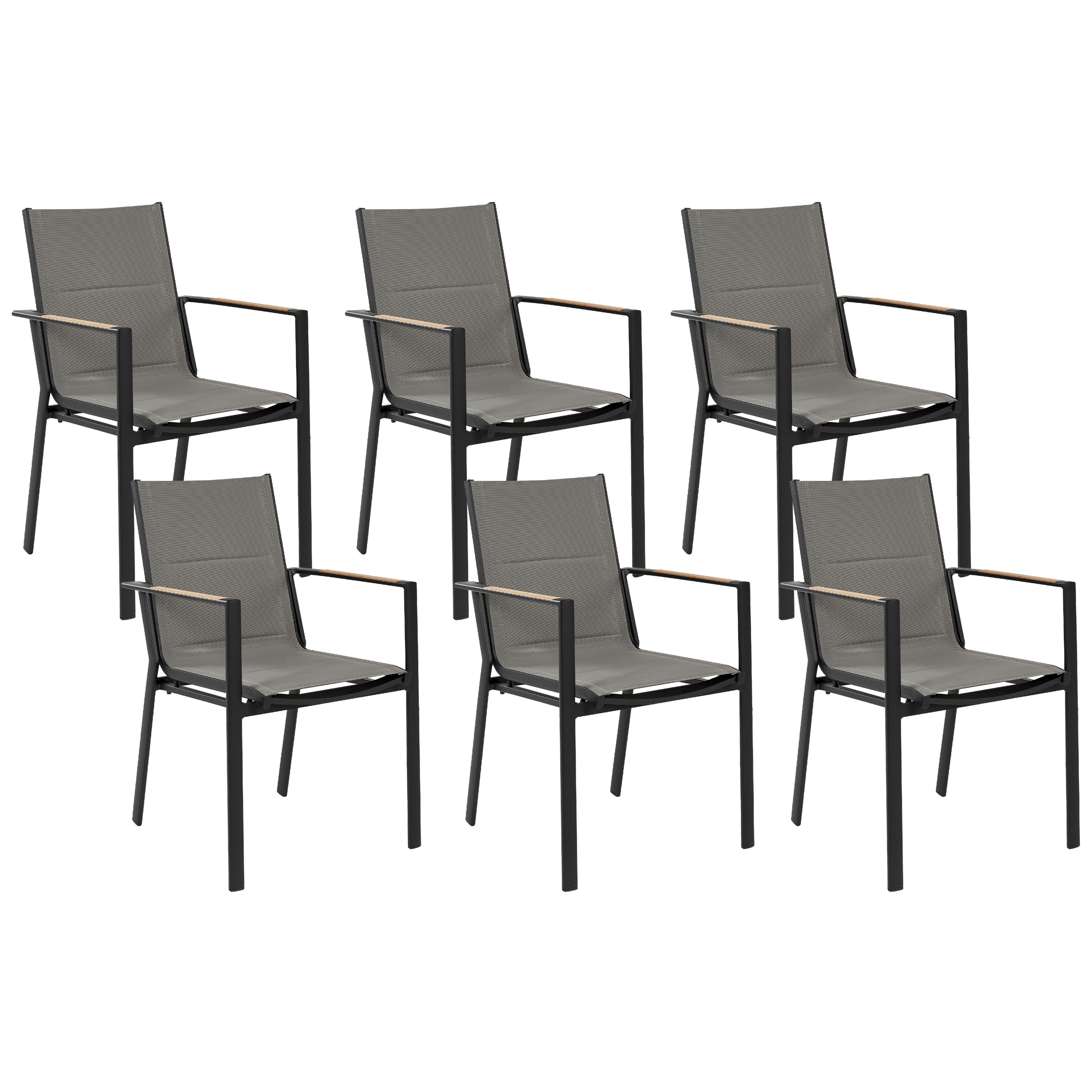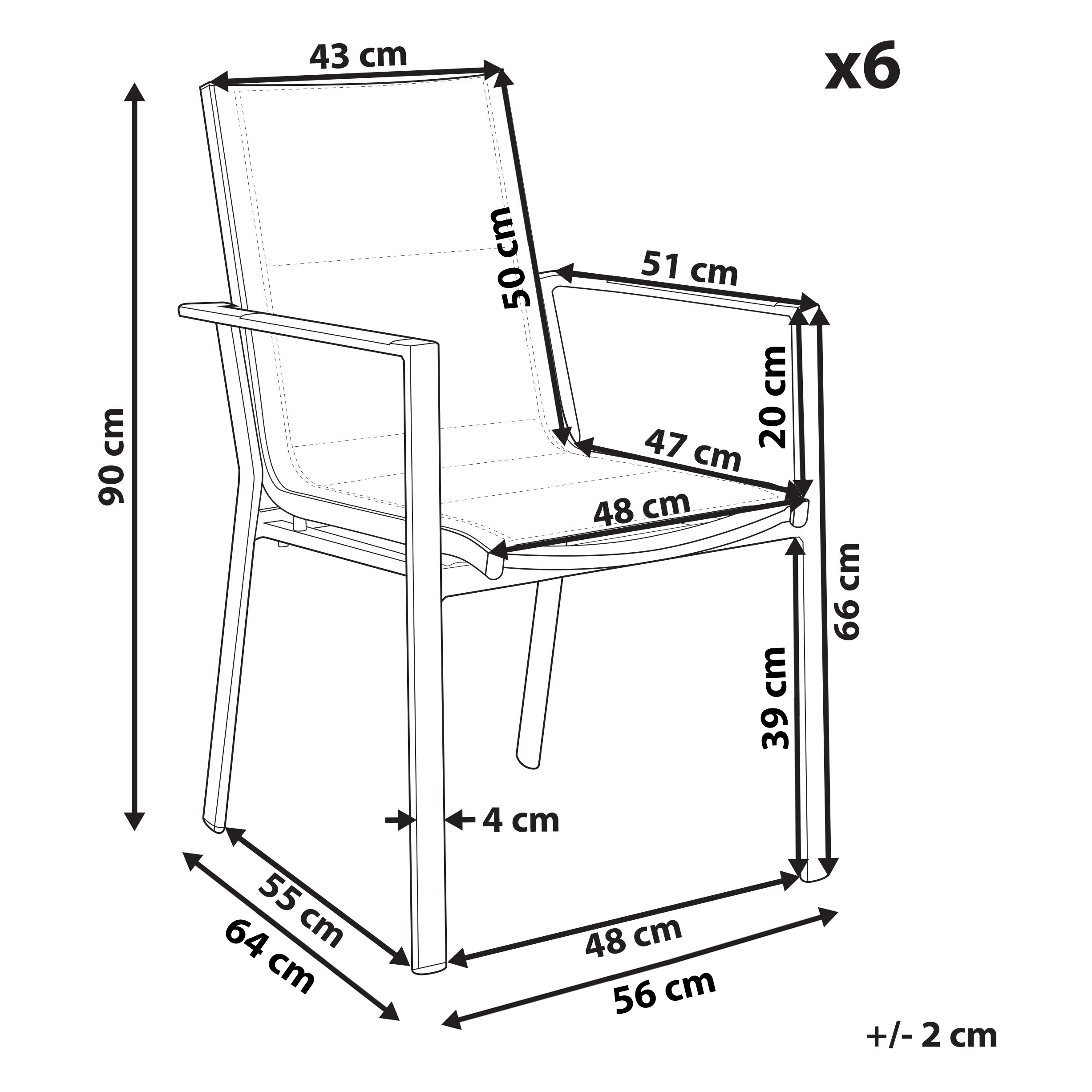 Puutarhatuolisetti ulkokäyttöön. Tämä puutarhatuolisetti on täydellinen ulkoilmasta nauttimiseen ja ajan viettoon yhdessä ystävien tai perheen kanssa. Jokaisen tuolin istuin ja selkänoja on verhoiltu paksulla synteettisellä materiaalilla käyttömukavuuden takaamiseksi. Tuolien runko on valmistettu laadukkaasta jauhemaalatusta alumiinista, jonka ansiosta ne ovat kestäviä ja pitkäikäisiä. Käsinojissa olevat muovipuupäälliset tarjoavat mukavan tuen. Yhdistä tuolit puutarhapöydän kanssa luodaksesi tyylikkään kokonaisuuden.