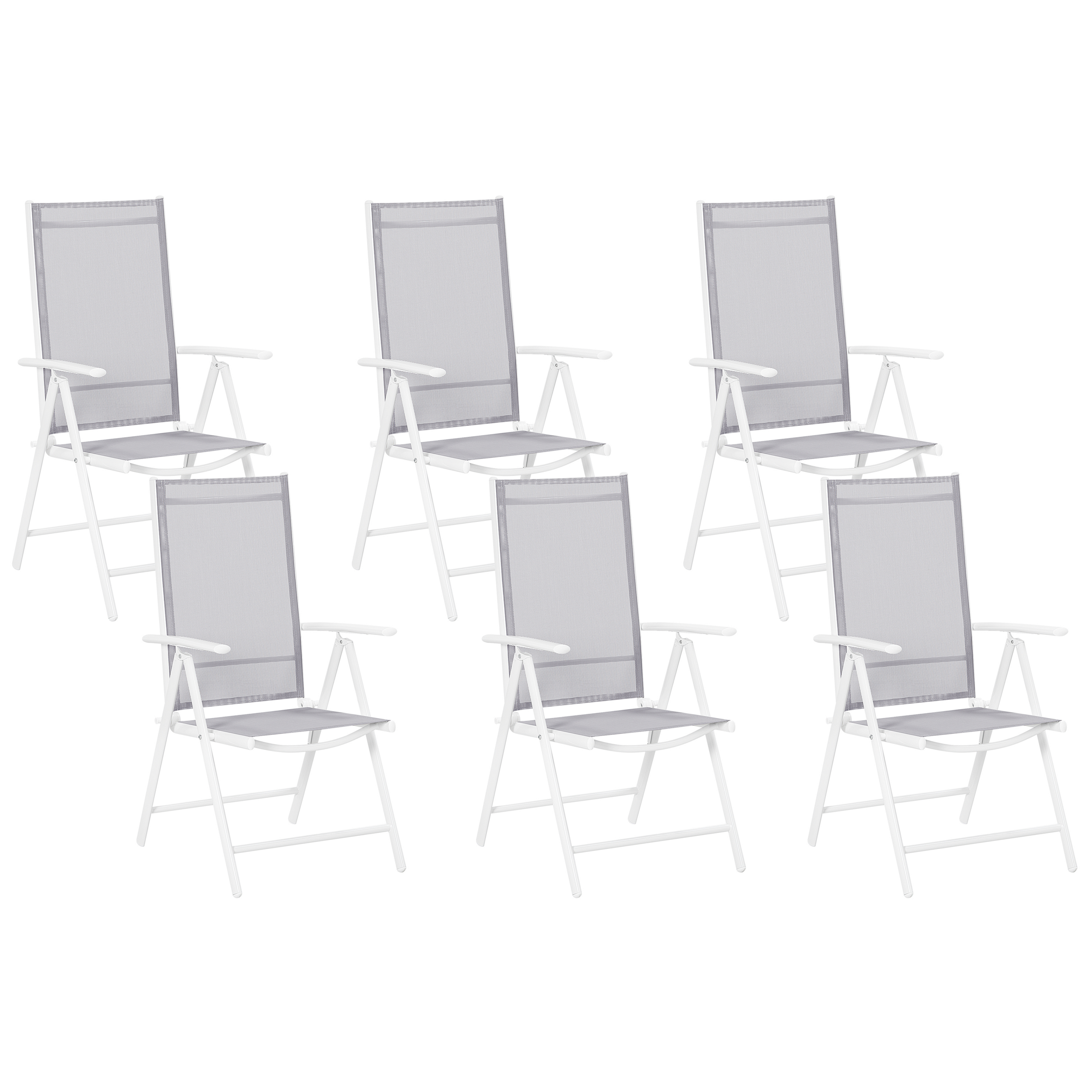 Kokoontaitettavat ulkotuolit säädettävällä selkänojalla. Tämä kuuden kokoontaitettavan puutarhatuolin setti on olennainen ja käytännöllinen osa jokaista modernia puutarhaa tai terassia. Tuolien tukevat, jauhemaalatut alumiinirungot ovat poikkeuksellisen kestäviä, sopien loistavasti päivittäiseen käyttöön. Syvät istuimet on valmistettu joustavasta sekä miellyttävän tuntuisesta kankaasta. Korkeat, viiteen eri asentoon säädettävät selkänojat tarjoavat oikeanlaisen tuen ja istumamukavuuden. Säänkestävä tuolisetti on poikkeuksellinen kokonaisuus, joka kestää vuosien käytön. Yhdistä tuolit puutarhapöydän kanssa luodaksesi tyylikkään kokonaisuuden.